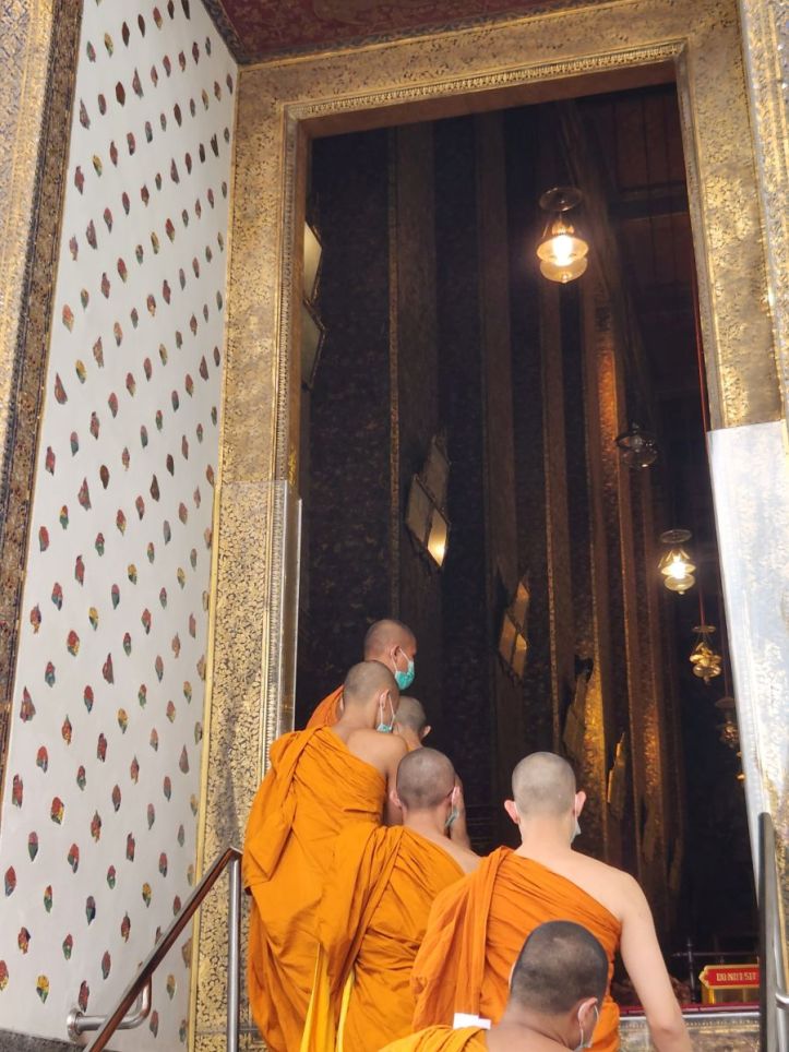 For the last part of our tour we walk through a portico in the cloister with lots of Buddha images, where Odum acts as photographer for us all, then into Ubosot where we can view the gold and crystal 3 tiered pedestal holding the Buddha and the 9 tiered umbrella which represents the “authority” of Thailand. After exiting, as we are putting on our shoes, a group of young monks comes in – obviously on a tour from somewhere, all looking almost star struck to be here. Sweet.