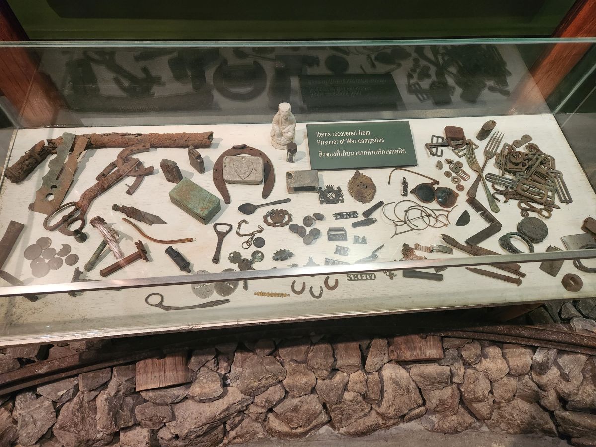 We’re onto the main events – at least in our minds – the River Kwai and Railway stories. First we visit Death Railway museum which has truly fascinating exhibits about the Japanese occupation during the war and their quest to build a secure supply railway line between their positions and Burma. If you’ve ever watched the movie, The Bridge over the River Kwai, which we have of course (just recently actually), you’ll know the basic (if not fictionally embellished) story: The Japanese used prisoners of war to build the railway line, forcing them to work to their deaths in horrid conditions. there is a lot more detail than that (increased deadlines for finishing, entire camps dying and disappearing, all sorts of horrors), but those are the basics. This museum just adds to all the facts we already knew with placards explaining the massive numbers of deaths, artifacts found over the years from the rail line itself and from the prisoner of war camps along with a fabulous diorama of the line and Hellfire pass. A very educational 30 minutes or so for us.