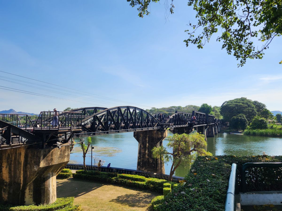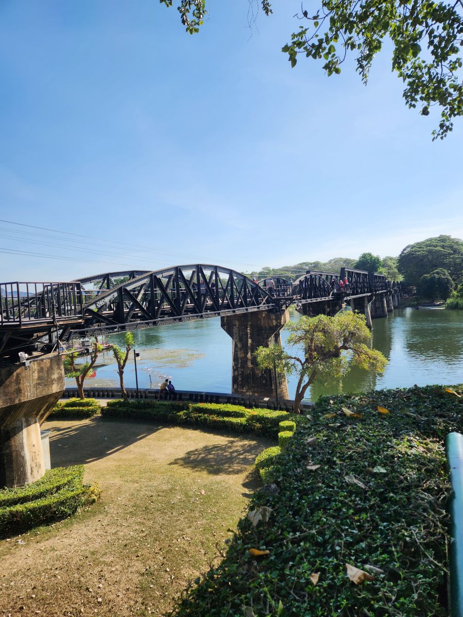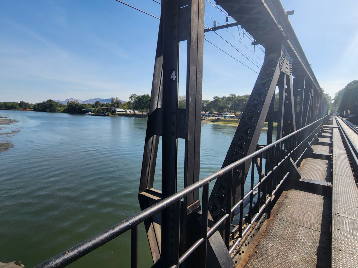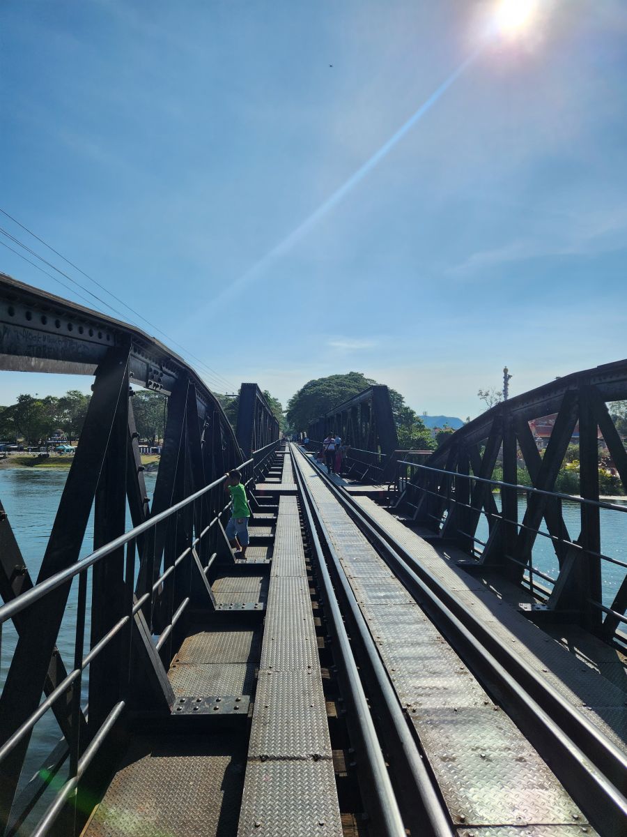 Finally we are off to the Bridge! As always, there are market stalls complexes all around the place, but once out to the river, it is just the bridge, where you can walk out onto the middle and actually stand there when a train comes by. We aren’t lucky enough to do that, but we can walk down the rails to the middle of the bridge for gorgeous views over the river, then off to the viewing point to see the bridge in its entirety. Odum has told us that the trestles that are rounded in shape are original and the squared, rectangular ones repaired.