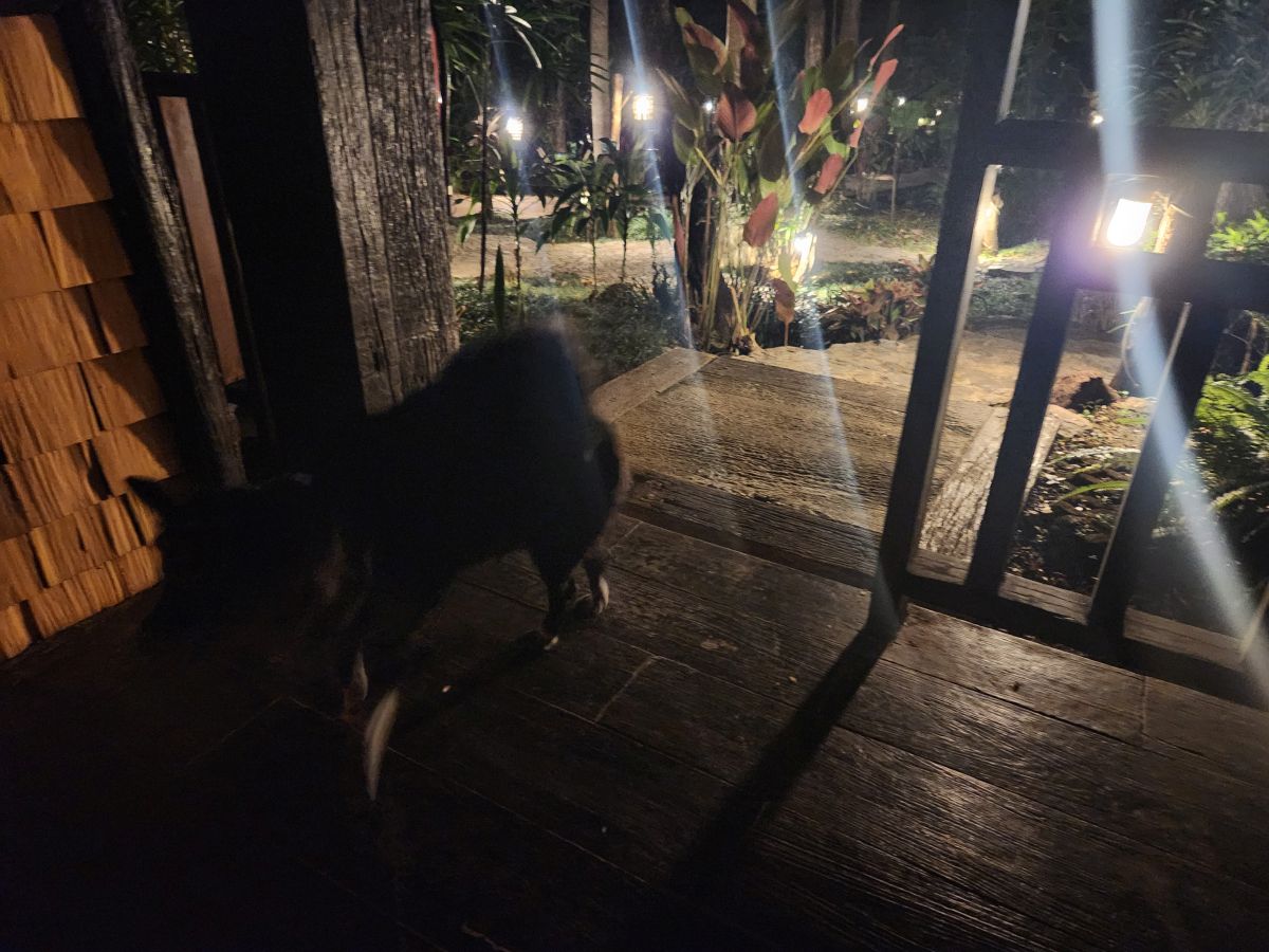 After a very pleasant evening we carefully navigate our way back to our porch, following the handpainted signs and playing with Ed’s new best friends who joined us on the walk and the porch. Then hung out on said porch listening to the tree frogs and having a night cap.