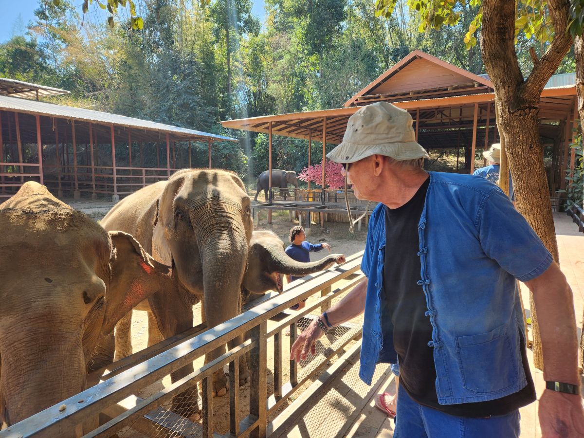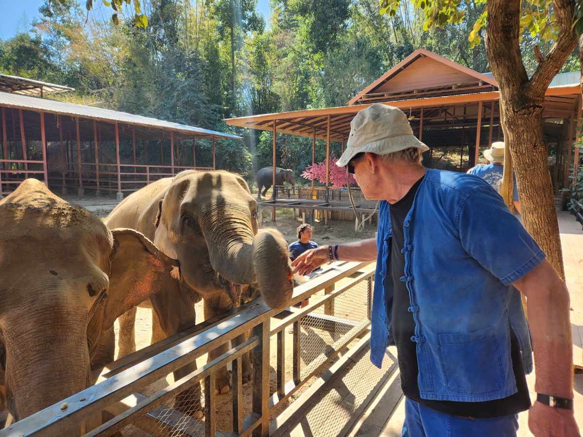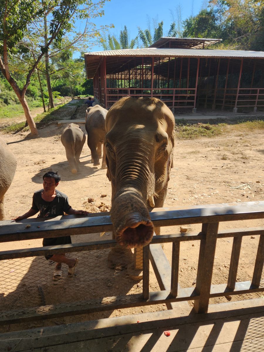 Then it’s time to feed the Elephants. Only a few are here, kept in a corral or pen behind the tables where we made their food. We all climb up on the feeding platform and begin the hysterical process of feeding each elephant down the line. But some of them are just too greedy and some people aren’t moving and well, it becomes a mass of grasping elephant trunks and empty buckets of food. Too funny.