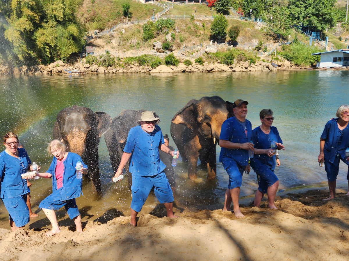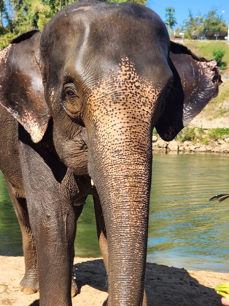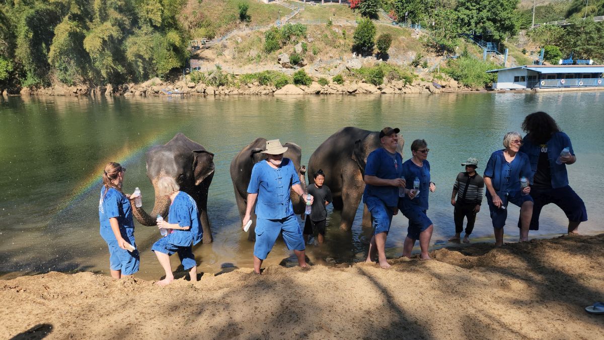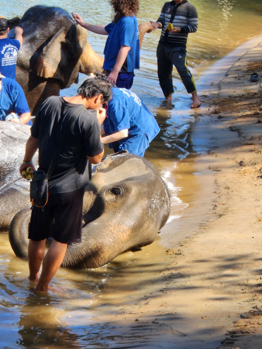 After we feed these guys and gals, we wash our hands and proceed down a steep and narrow dirt pathway to the river where 3 more elephants wait for us to bathe them. We’ve decided we aren’t going to get in the water today – we’ll just be the official photographers, which, honestly, is the best! It is so much fun to watch everyone get soaked while they are bathing the elephants and then sprayed by the elephants– rather than do it ourselves! The videos and the pictures are well worth it!