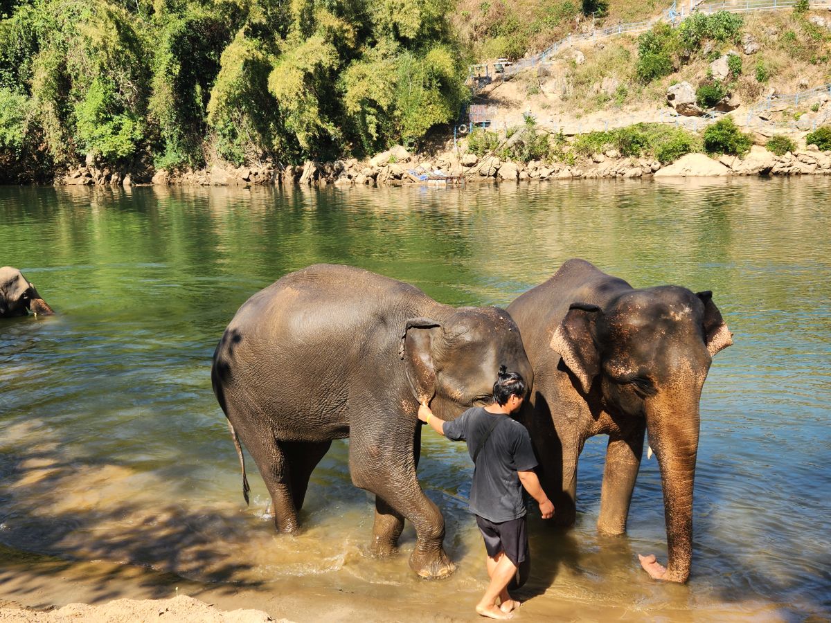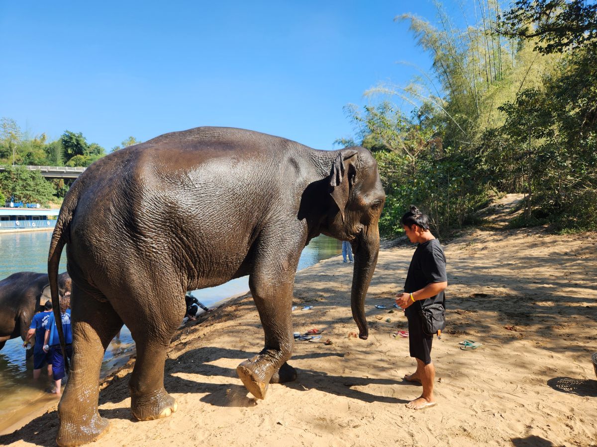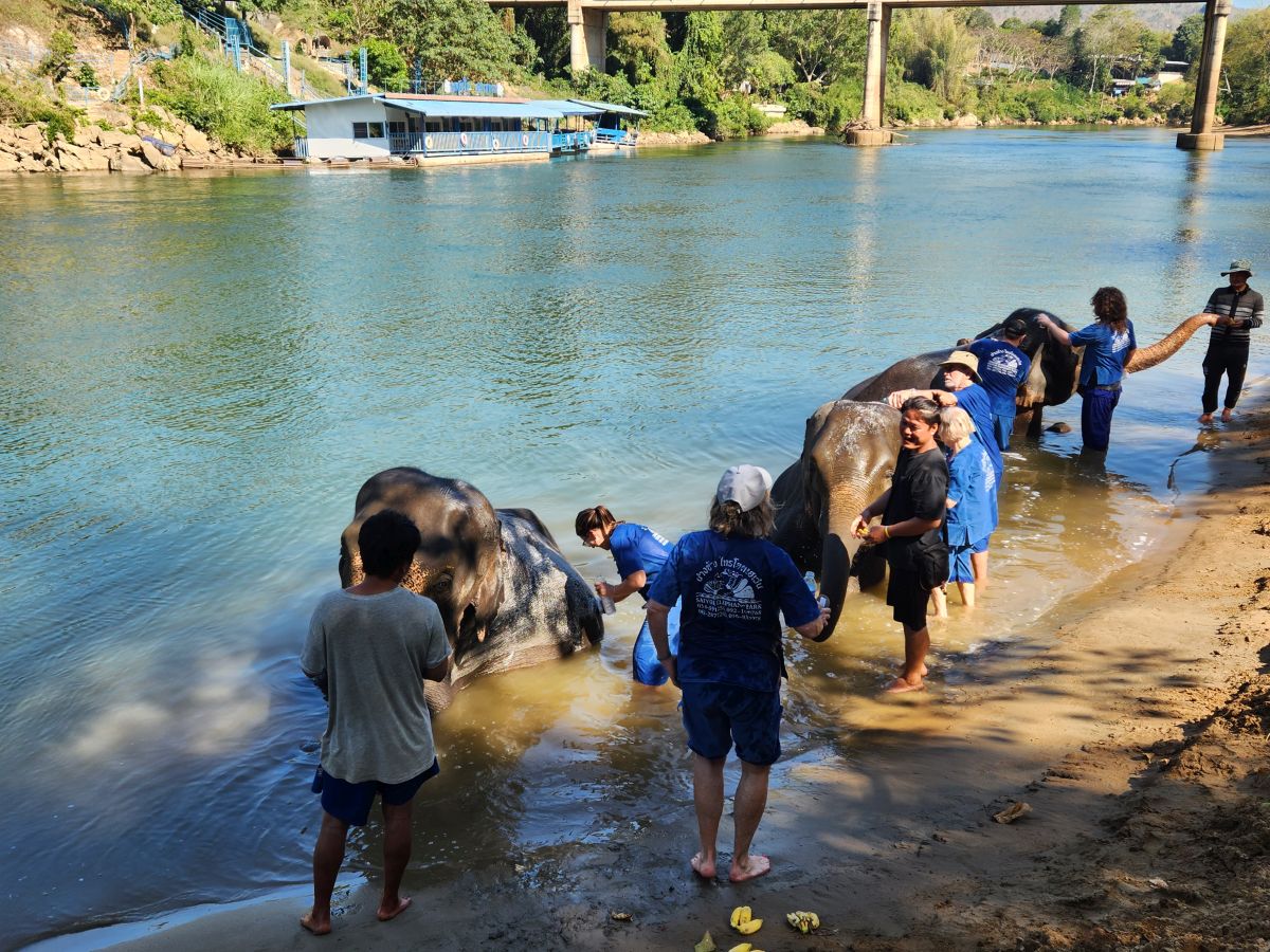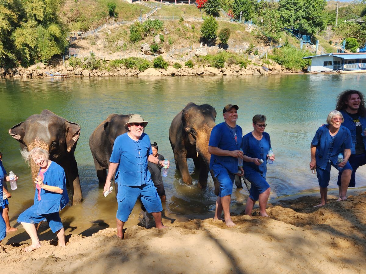 After we feed these guys and gals, we wash our hands and proceed down a steep and narrow dirt pathway to the river where 3 more elephants wait for us to bathe them. We’ve decided we aren’t going to get in the water today – we’ll just be the official photographers, which, honestly, is the best! It is so much fun to watch everyone get soaked while they are bathing the elephants and then sprayed by the elephants– rather than do it ourselves! The videos and the pictures are well worth it!