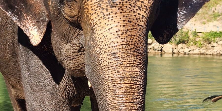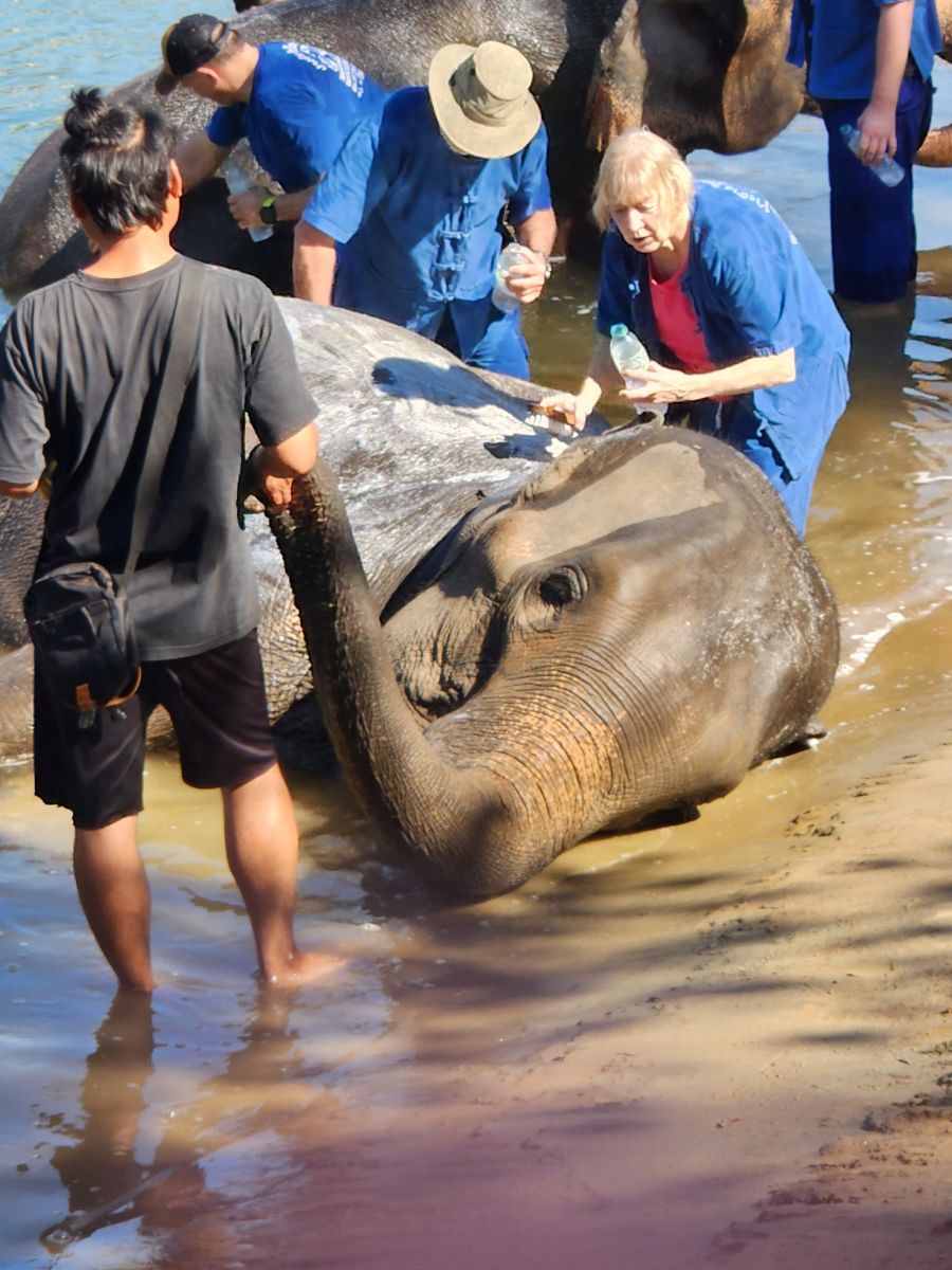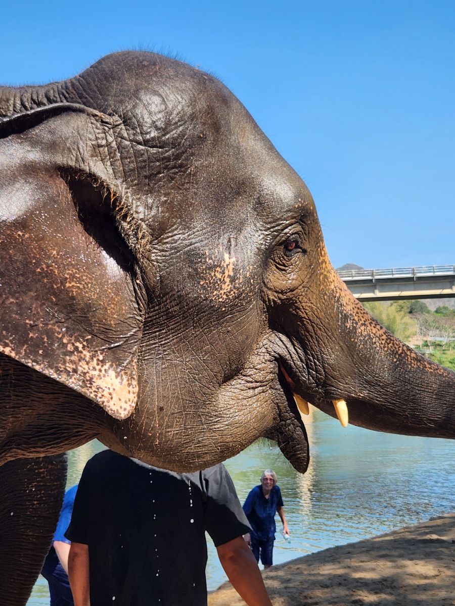 Once everyone has been in the water for a bit, the Mahouts get the elephants to lay down in the river, almost crushing Maggie who was in the wrong place at the wrong time! Bathing work continues with more soap and more soaking wet elephants…and bathers! But, oh, those faces! That huge face and those expressive eyes, just laying there in water looking up at you so balefully!
