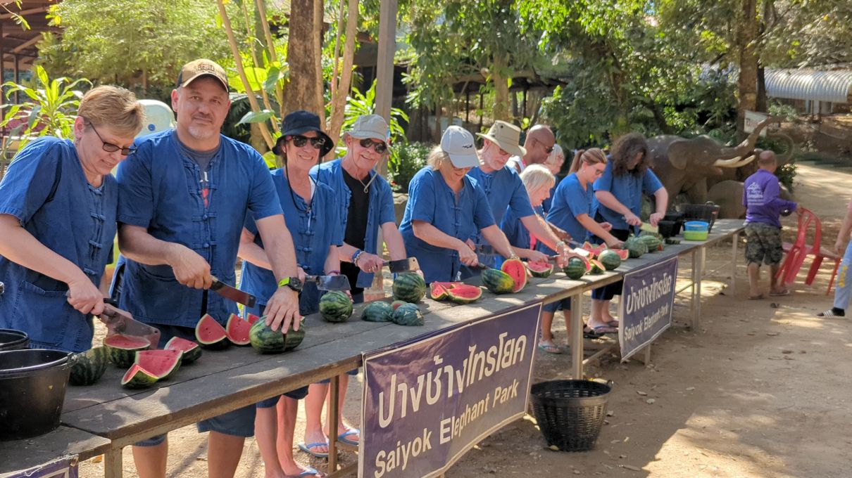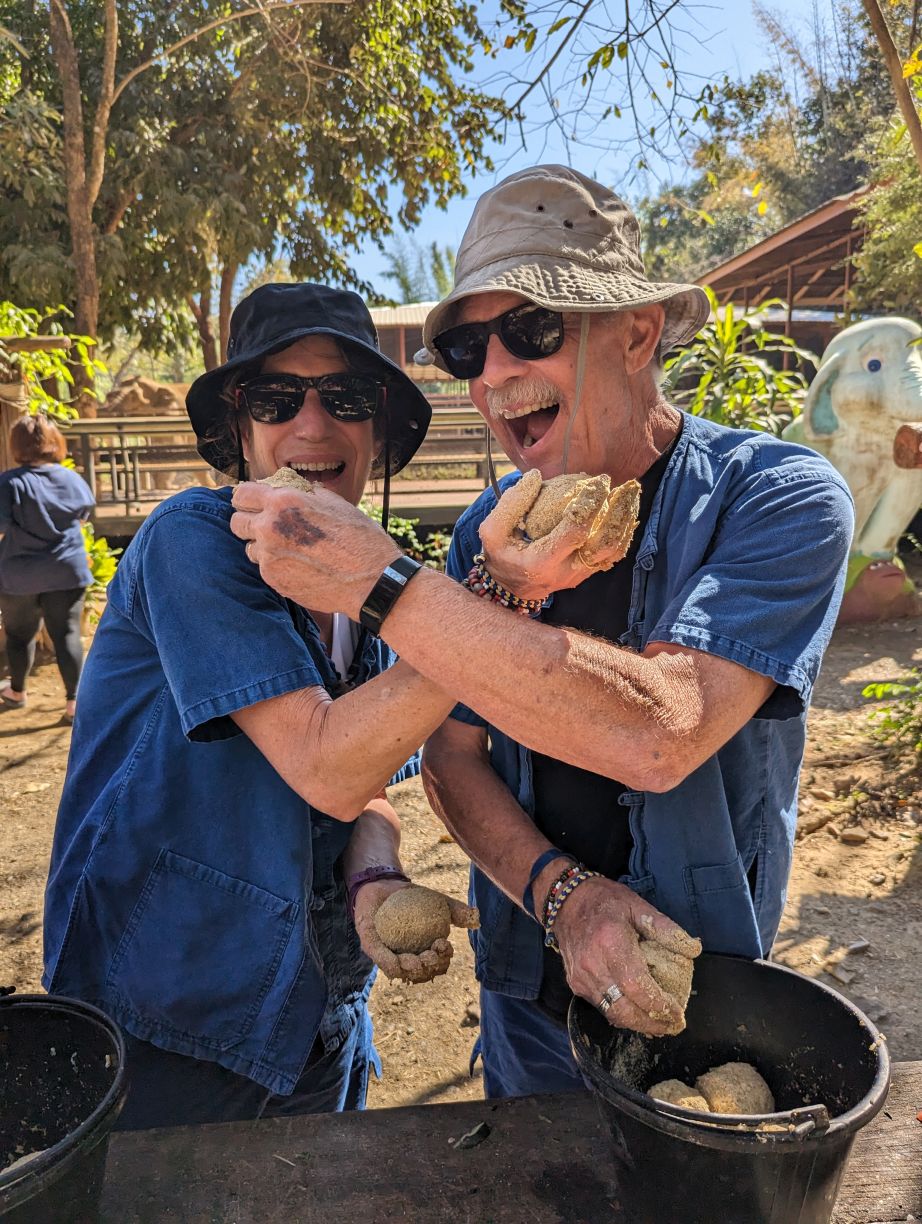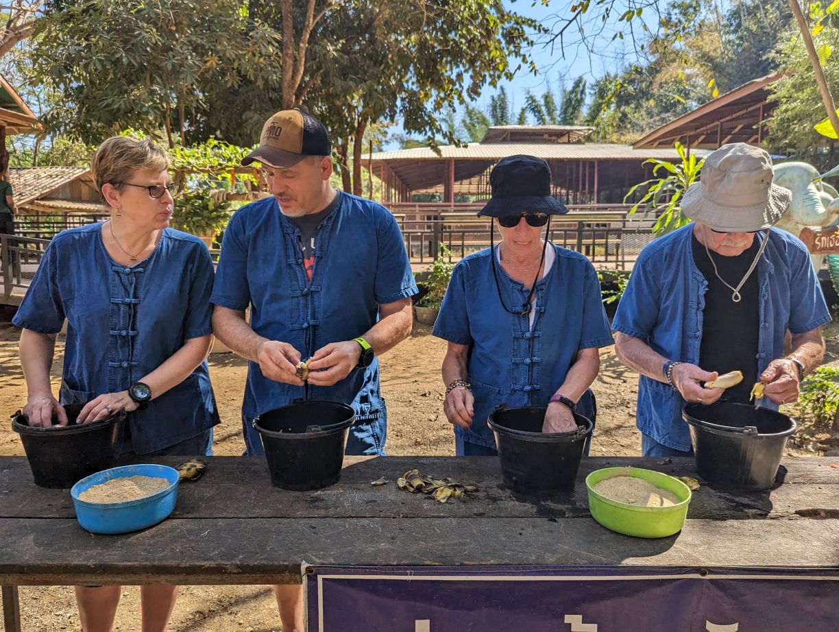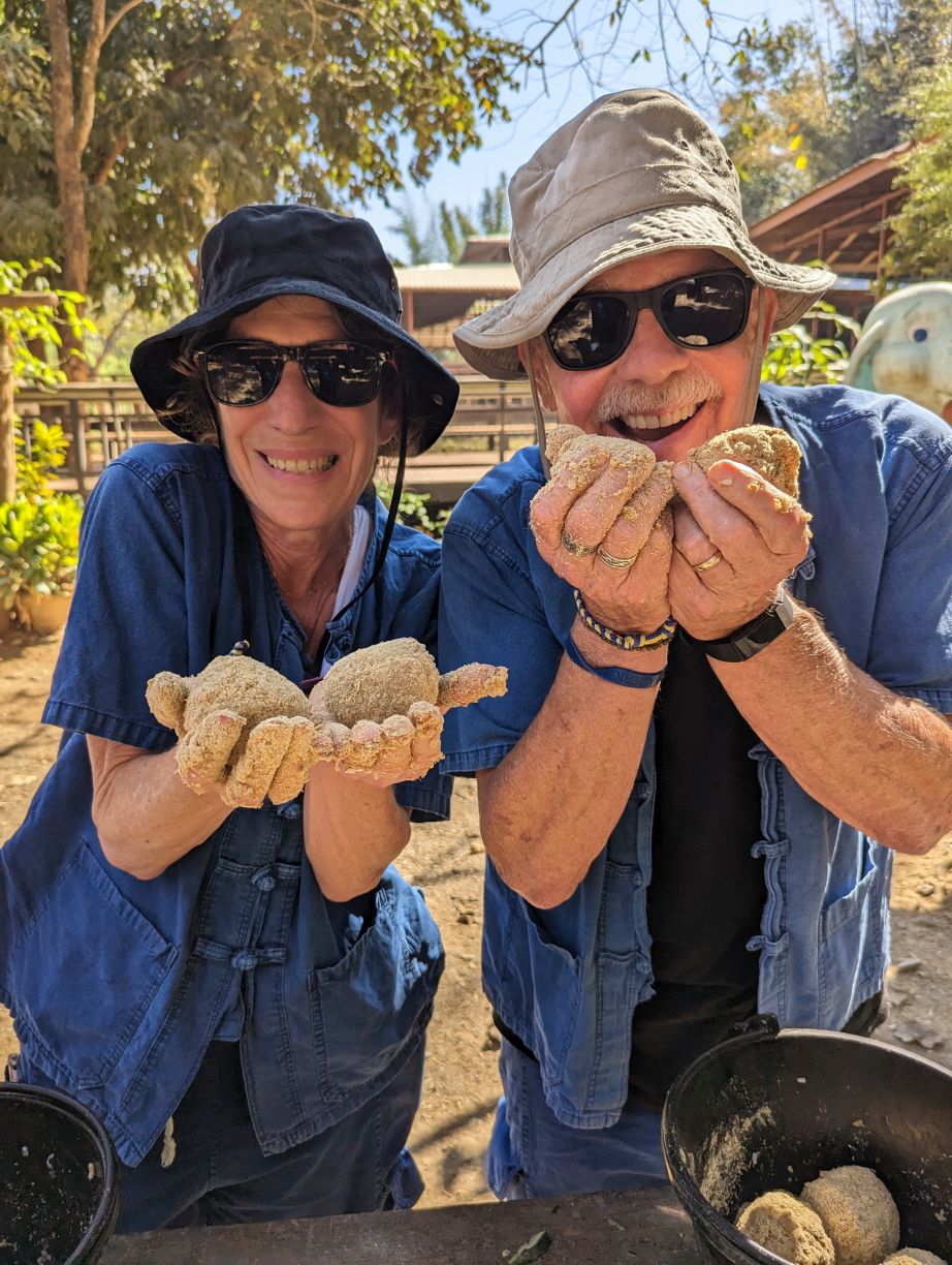 Arriving at the little park, we are handed our uniforms (this is obviously a thing now at parks – which makes sense in so many different ways), head up the hill to the bathrooms to change, then regroup down by the ticket booth. Here we get to make the elephants’ food – similar to our other experience – but oh so much better!!! First of all, there are no kids. Second of all there is lots of interaction with the elephants. We start off making the food – which entails lots of hacking fruits with huge knives! Then mashing everything together in little “medicine” balls. Very similar to our Chiang Mai experience, only this time, we’re actually taking part in the making. The guides/Mahouts are our photographers and we get some great photos to share.