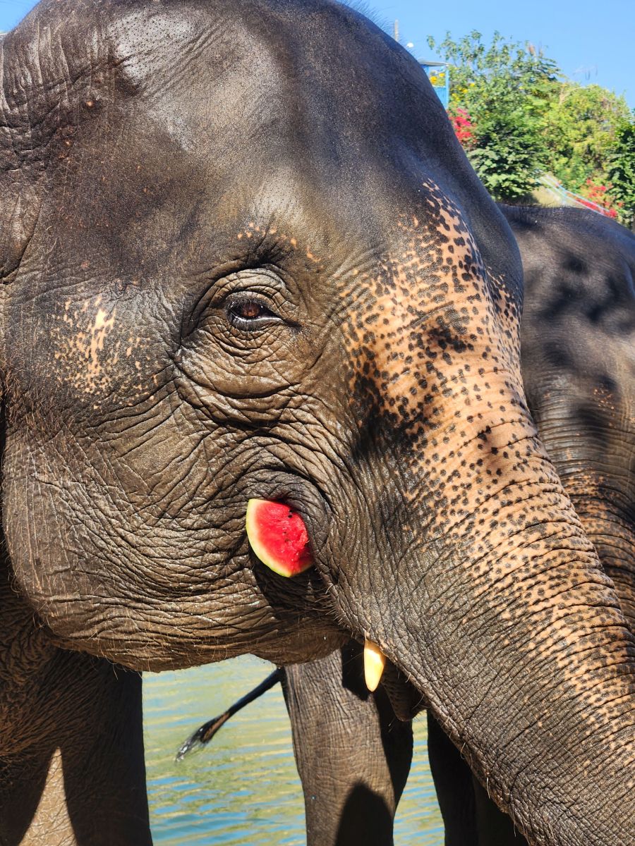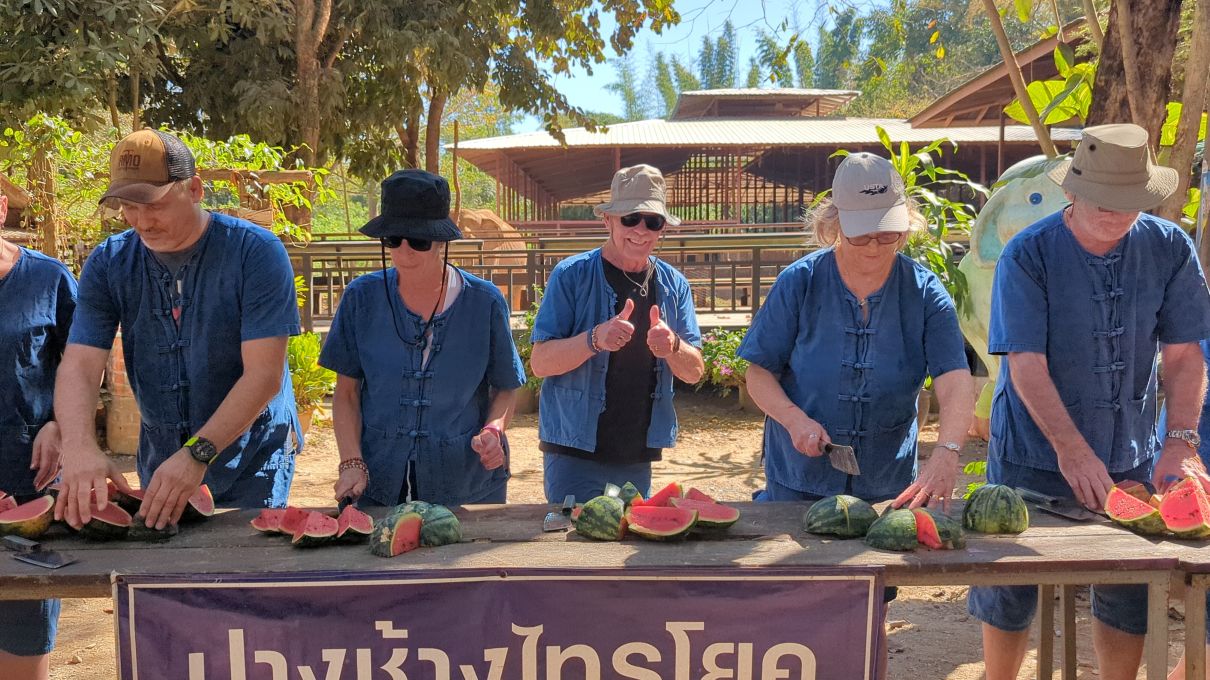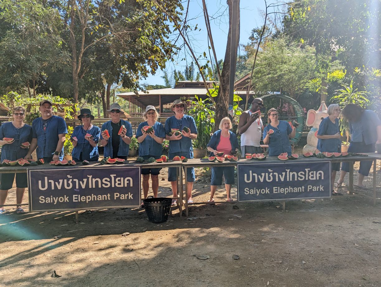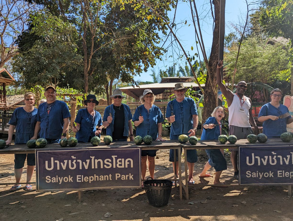 Arriving at the little park, we are handed our uniforms (this is obviously a thing now at parks – which makes sense in so many different ways), head up the hill to the bathrooms to change, then regroup down by the ticket booth. Here we get to make the elephants’ food – similar to our other experience – but oh so much better!!! First of all, there are no kids. Second of all there is lots of interaction with the elephants. We start off making the food – which entails lots of hacking fruits with huge knives! Then mashing everything together in little “medicine” balls. Very similar to our Chiang Mai experience, only this time, we’re actually taking part in the making. The guides/Mahouts are our photographers and we get some great photos to share.