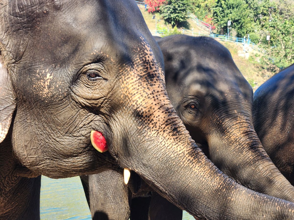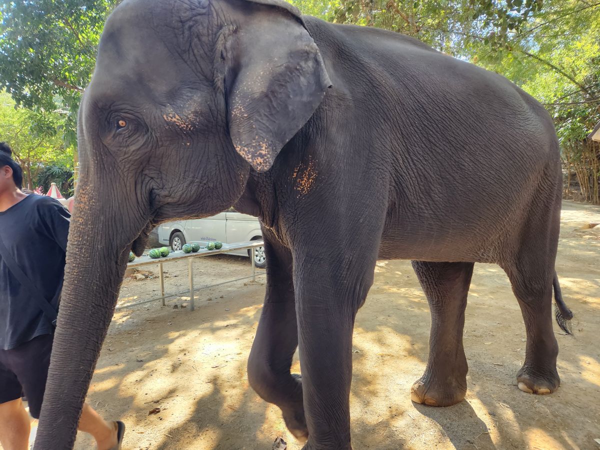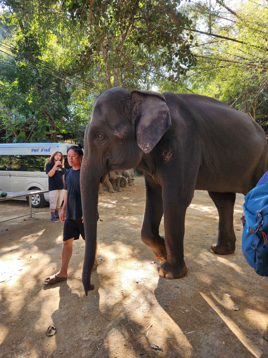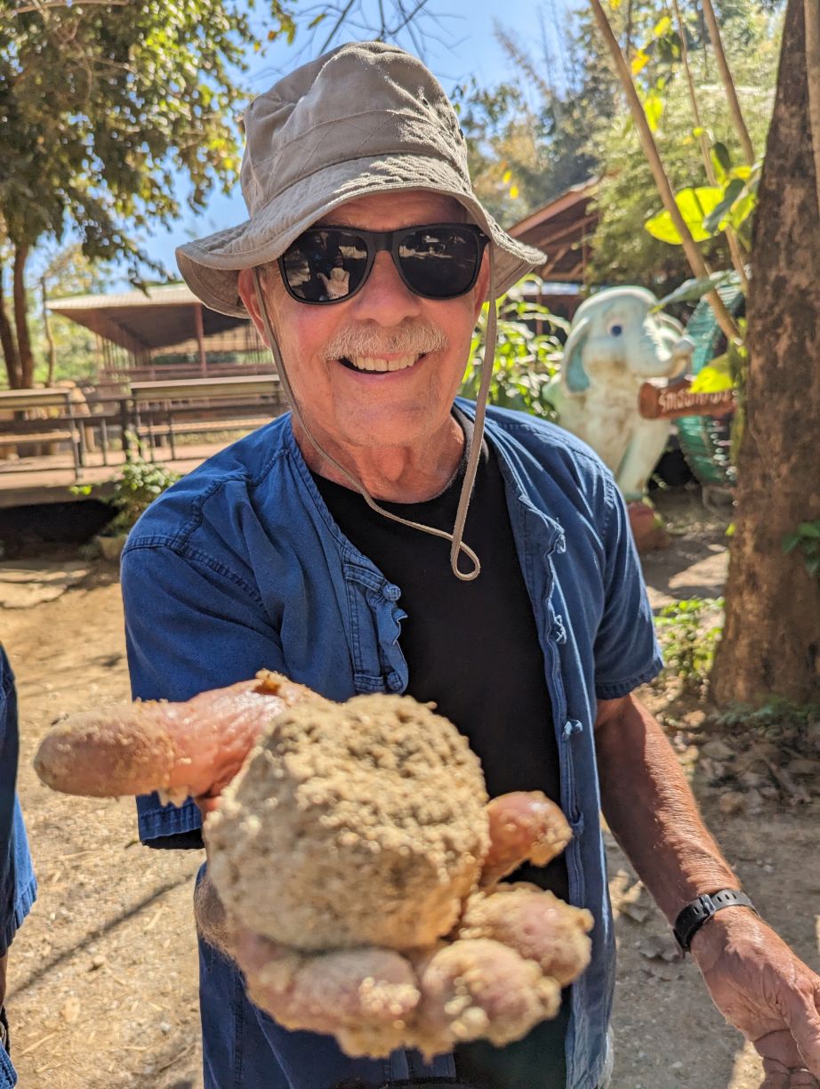 Arriving at the little park, we are handed our uniforms (this is obviously a thing now at parks – which makes sense in so many different ways), head up the hill to the bathrooms to change, then regroup down by the ticket booth. Here we get to make the elephants’ food – similar to our other experience – but oh so much better!!! First of all, there are no kids. Second of all there is lots of interaction with the elephants. We start off making the food – which entails lots of hacking fruits with huge knives! Then mashing everything together in little “medicine” balls. Very similar to our Chiang Mai experience, only this time, we’re actually taking part in the making. The guides/Mahouts are our photographers and we get some great photos to share.
