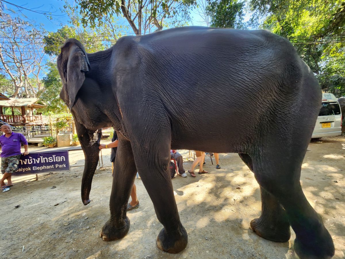This is a “surprise” optional tour that Odum has arranged on his own. We had wavered about going, but really? More elephants? What were we thinking. So of course, in the end, we signed right up. It’s only 500 baht each and it will fill the afternoon – so what the heck. Not everyone is going, so we split up – ensuring to listen to Odum when he tells us to take everything we need from the bus with us because we won’t be seeing the bus until the next morning – and hop into a little van at the train bus parking area with 8 others, and taking off into the wilderness of Kanchanaburi.