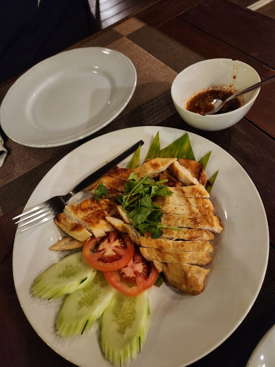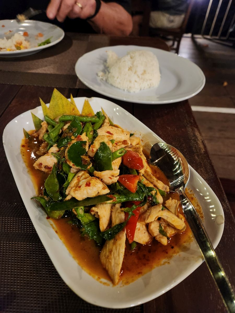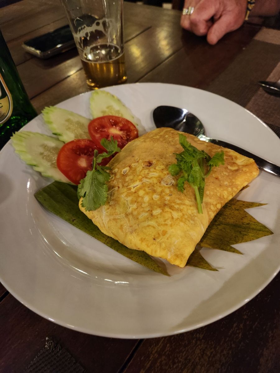 After getting cleaned up and packing organized, we wandered down to the restaurant for dinner. We had a lovely meal of Khai yat sai, an omelet stuffed with pork and veggies, grilled chicken with peanut sauce and yummy stir fried chicken and veggies. The setting couldn’t have been better, sitting down on the deck overlooking the river in the dusk.
