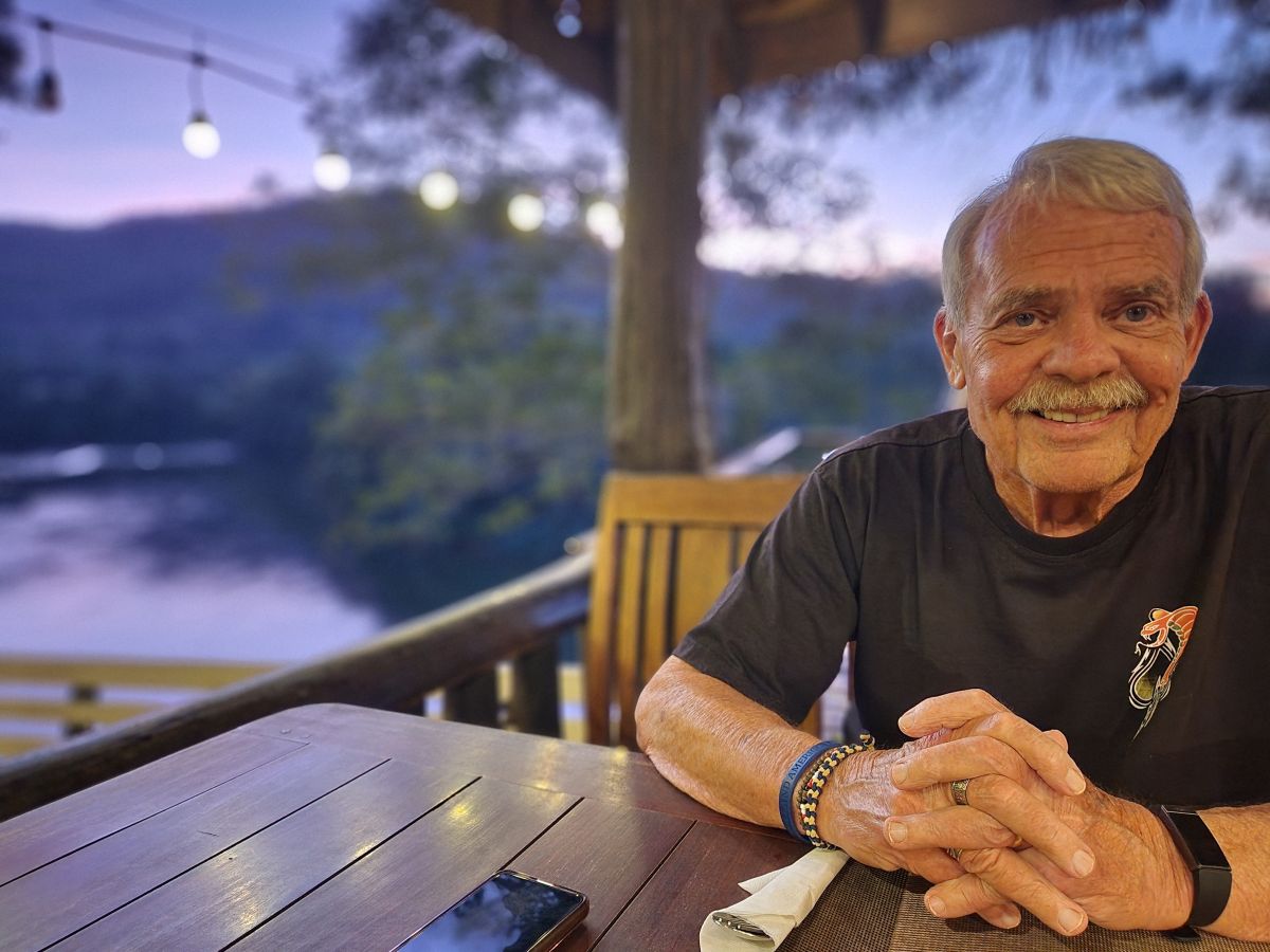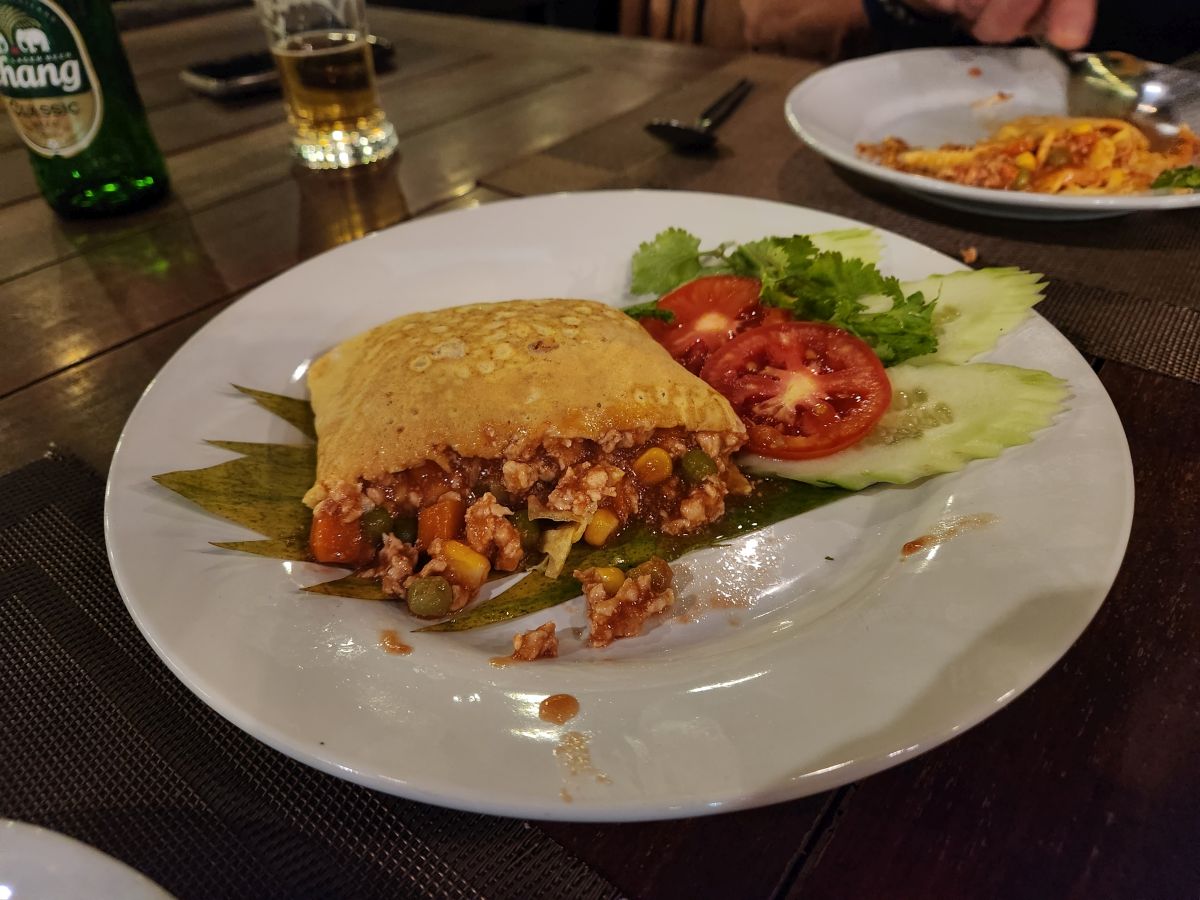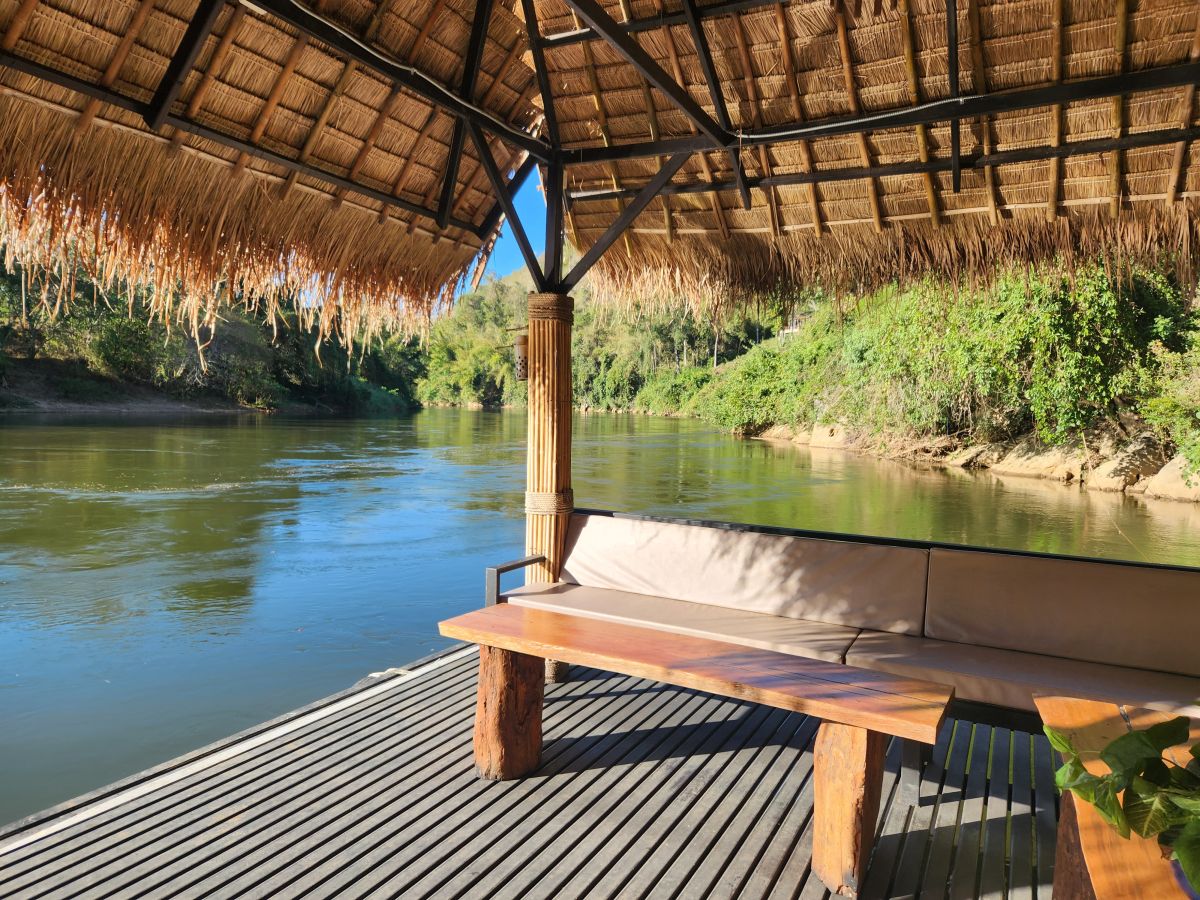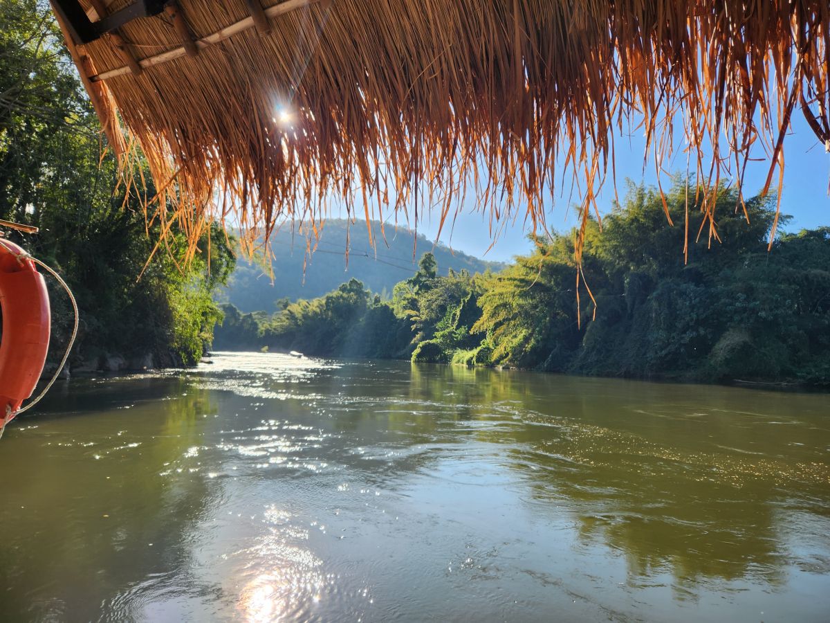 After getting cleaned up and packing organized, we wandered down to the restaurant for dinner. We had a lovely meal of Khai yat sai, an omelet stuffed with pork and veggies, grilled chicken with peanut sauce and yummy stir fried chicken and veggies. The setting couldn’t have been better, sitting down on the deck overlooking the river in the dusk.