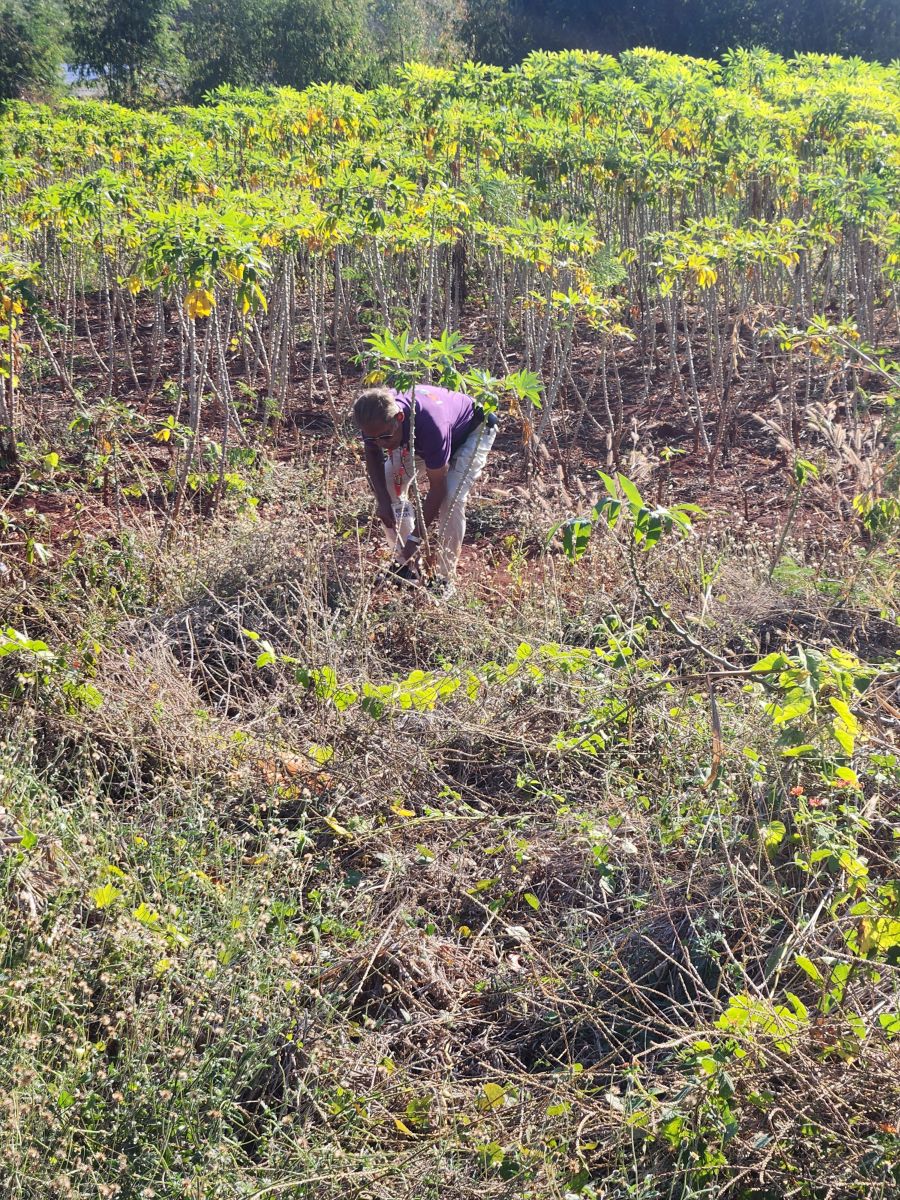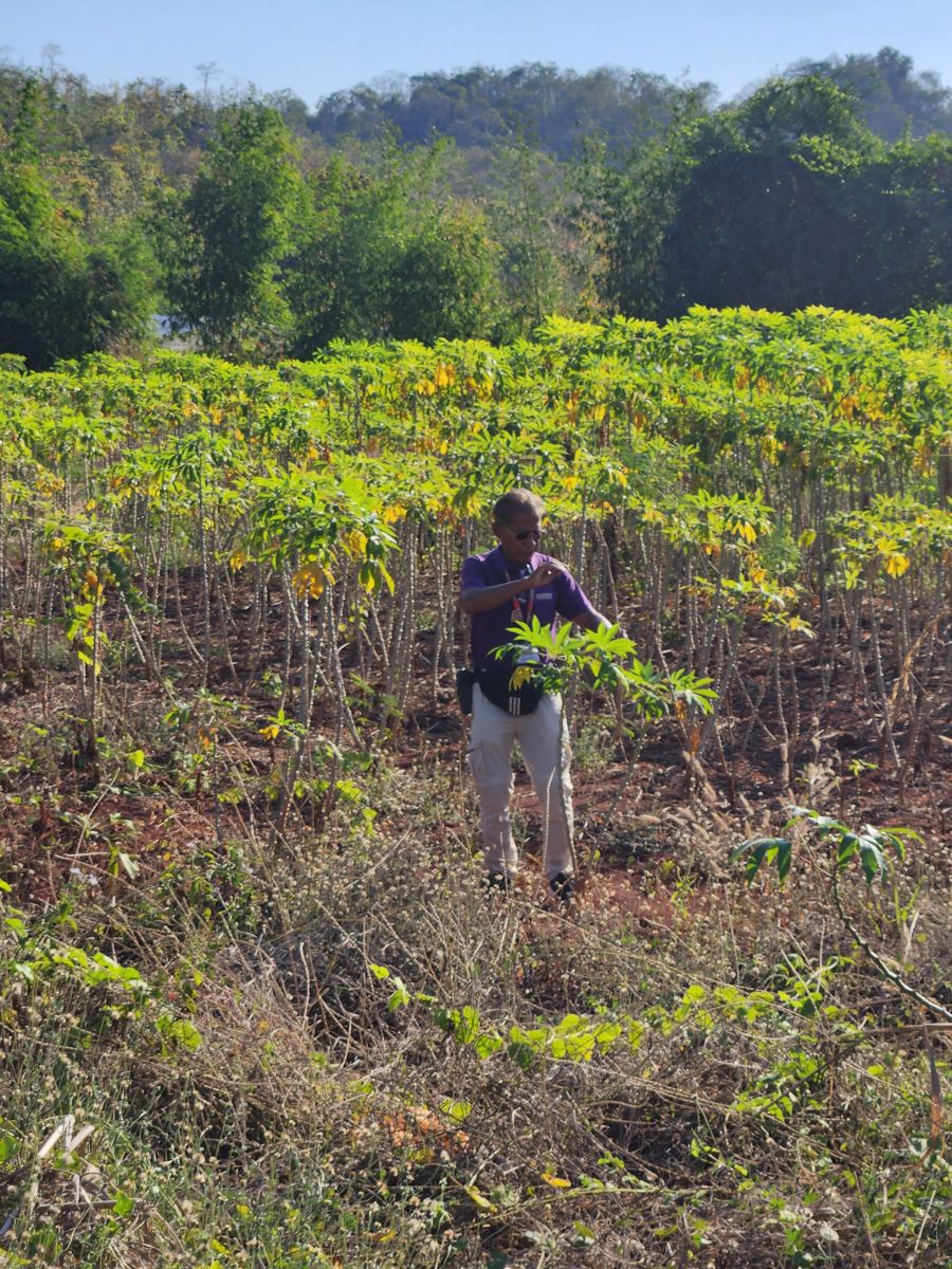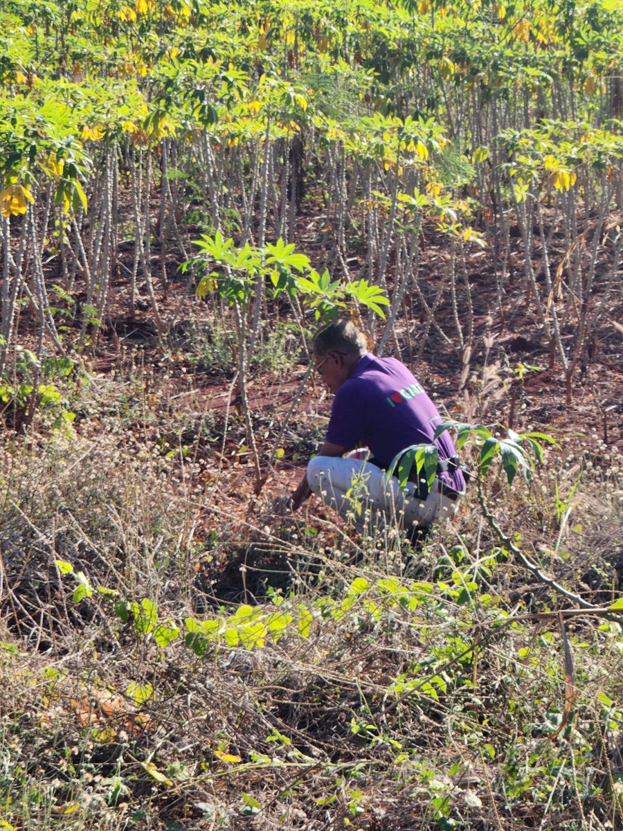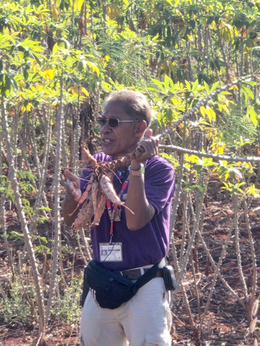 An hour into our drive, Odum instructs the driver to pull over to the side of the road, at some little Village house (or as Maggie put it, some random house and field). We all troop off the bus, as Odum takes us on a tour through some poor person’s home – explaining the courtyard, the house, and then across the dirt lane into the fields with Cassava. Where he whacks his way down to the field, then digs up a Cassava plant to show us the tubers and explain how Tapioca flour is made, then replants the Cassava! Oh my God! He is too awesome!