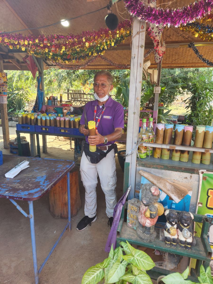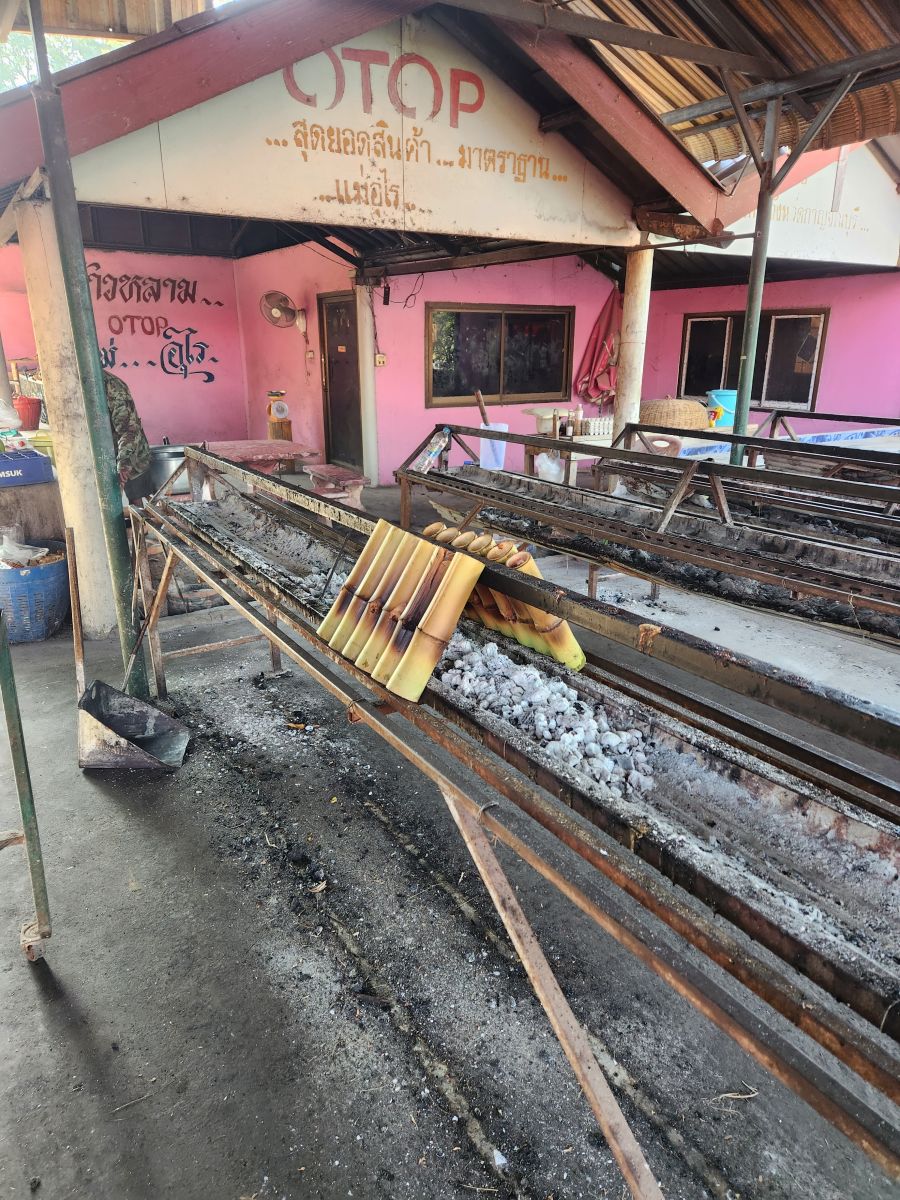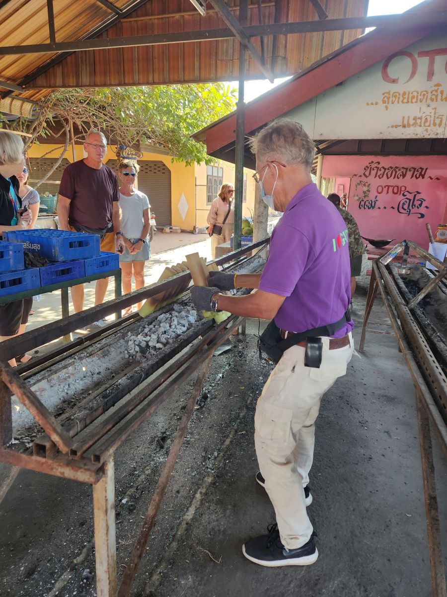 But, to be honest? Not as fascinating as the Sticky rice stop. I mean, come on! Odum gets us all out, gives us a demonstration of where the Kao Larn (sticky rice) is cooked (over a hot wood burning stove/grill) and how it is then cut out of the bamboo receptacle with a machete (oh yeah, big knife!). And then we get to taste it all! With the spoons Udom has made from the bamboo! And take the extras on the bus! Fabulous!!!