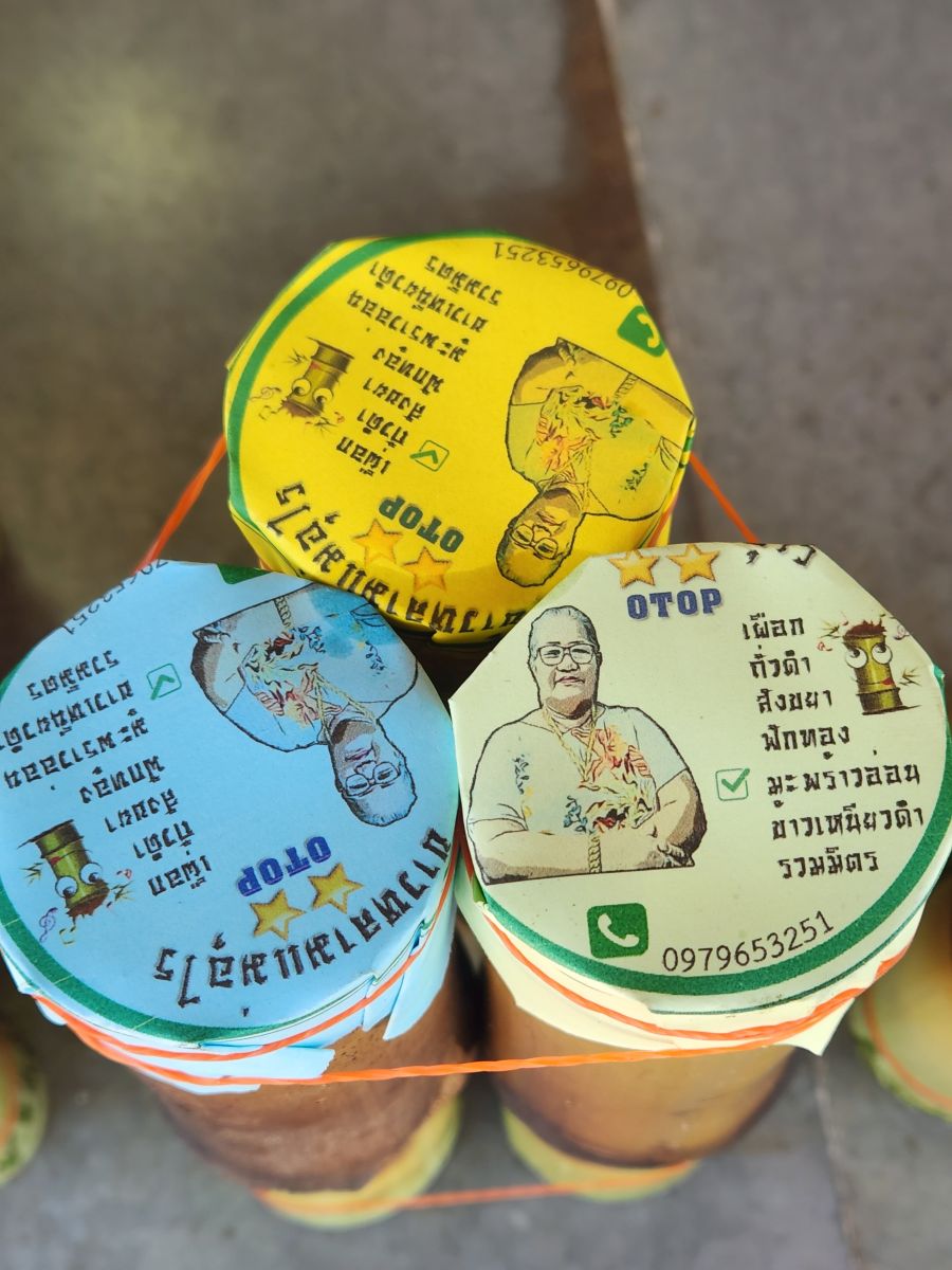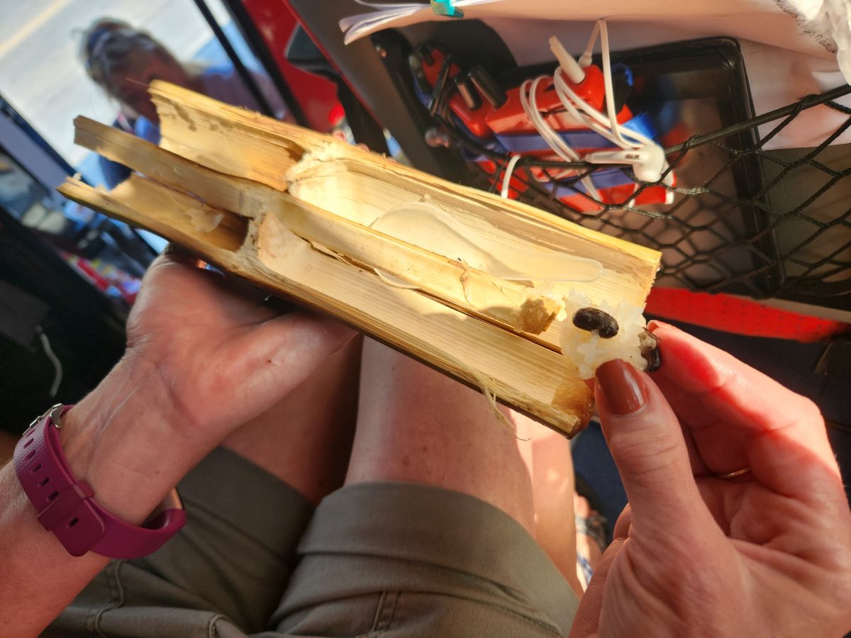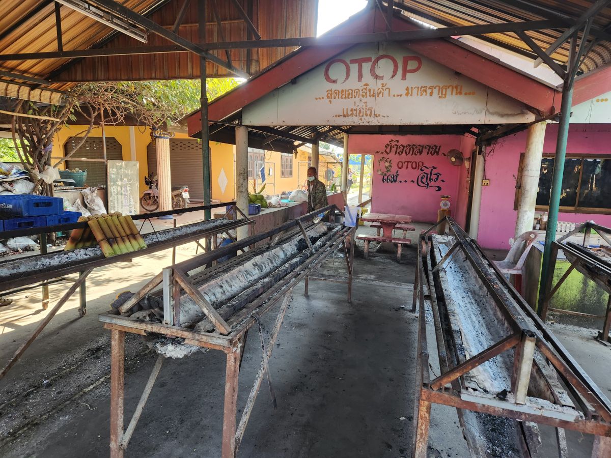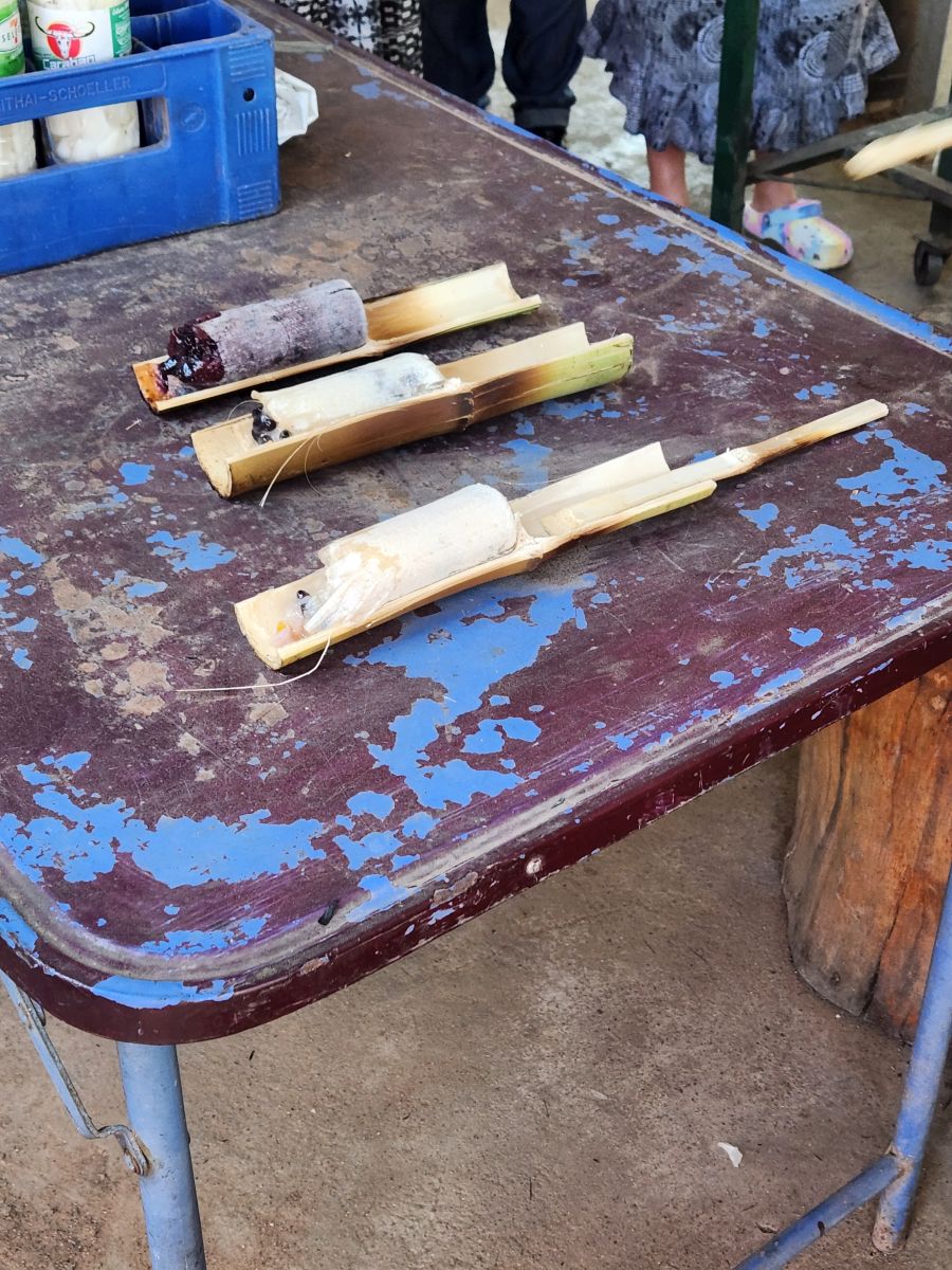 But, to be honest? Not as fascinating as the Sticky rice stop. I mean, come on! Odum gets us all out, gives us a demonstration of where the Kao Larn (sticky rice) is cooked (over a hot wood burning stove/grill) and how it is then cut out of the bamboo receptacle with a machete (oh yeah, big knife!). And then we get to taste it all! With the spoons Udom has made from the bamboo! And take the extras on the bus! Fabulous!!!