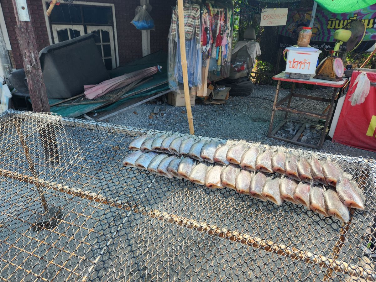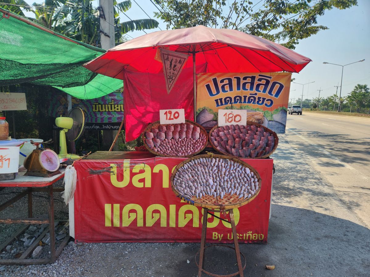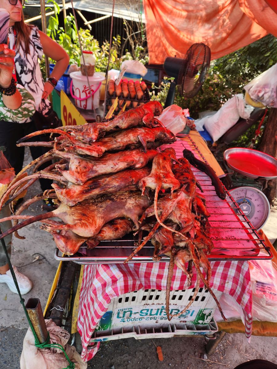 Then we are back on the bus again, driving through farmland with miles and miles of sugarcane, pineapple, bananas. Odum talks about Buddhism, giving us a lesson on the 2 sects: Mahayana, the Happy Buddha (which is Chinese in origin) and Hinayana, or Yanna, the Handsome Buddha (Thai in origin). He is so full of knowledge and experiences. It is absolutely wonderful to sit back and listen to him, and wonder where he will take us next! Well, next is – of all things – a rice field rat stall. Yes, you read that right. Rice field rats. Seems that the rice fields are full of rats that eat the young rice and grain and snakes that can bite the farmers. Neither pest is of any use to the Thais, so they catch them and then eat them. Grilled of course! Why not.