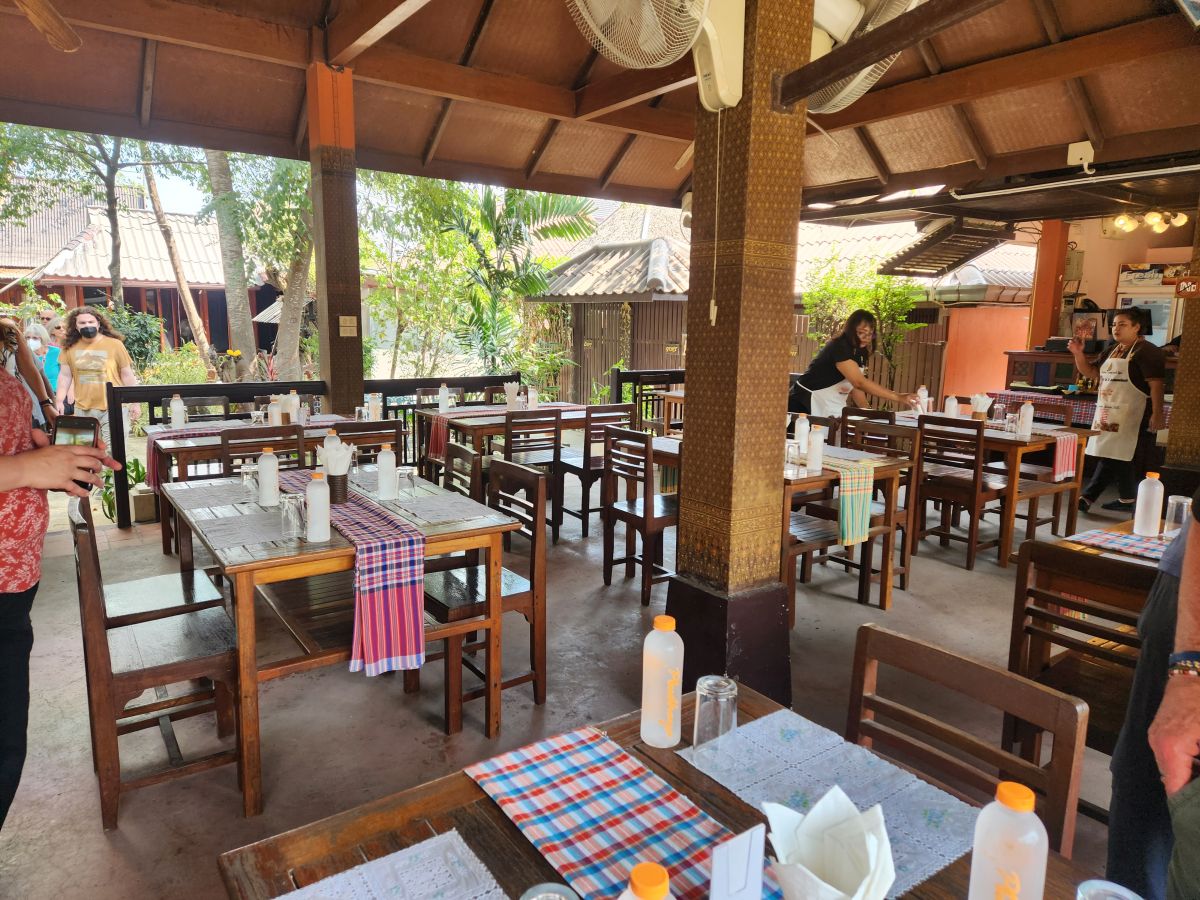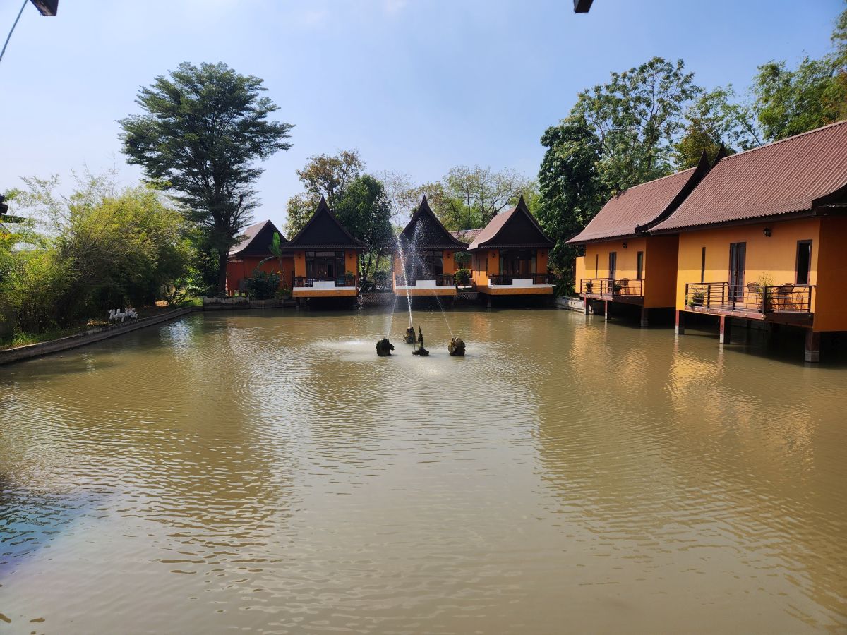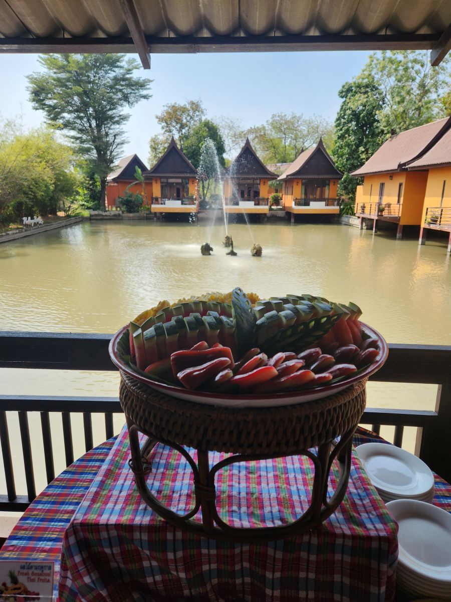 Another 90 minutes of bus riding, through rice fields and then actually into the outskirts of Ayutthaya itself, we get to a lovely little resort in the middle of the rice fields for our lunch. It is in this lovely setting, overlooking a pond in the middle of the resort, that we dig into a wonderful buffet lunch of onion soup with minced pork, Pad Thai, chicken fired with ginger, Massaman Gai (chicken), Burmese chili, stir fry with egg and fruit for dessert. Absolutely delicious.