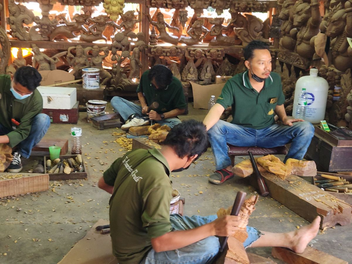The building is made completely of wood, with no nails, only wooden dowels holding everything together. As we begin our tour, we walk through the workshop where sculptures are busy at work carving items that will be placed into the castle.
