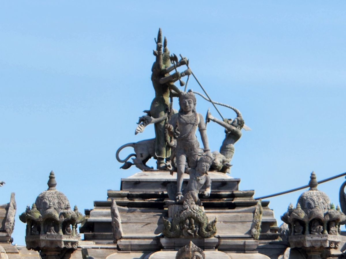Approaching the actual building, you can pick out the five peaks of the castle which represent the five missions of human: do good deeds, inherit the best from science; build eternal peace; good behavior and making a good result; and the fusion of the 4 previous virtues. The detail is incredible – and just as amazing to us as the first time we were here. Around the back, above the entrance we will use are the most incredible Elephants and aquatic creatures meant to represent swimming against the tide.