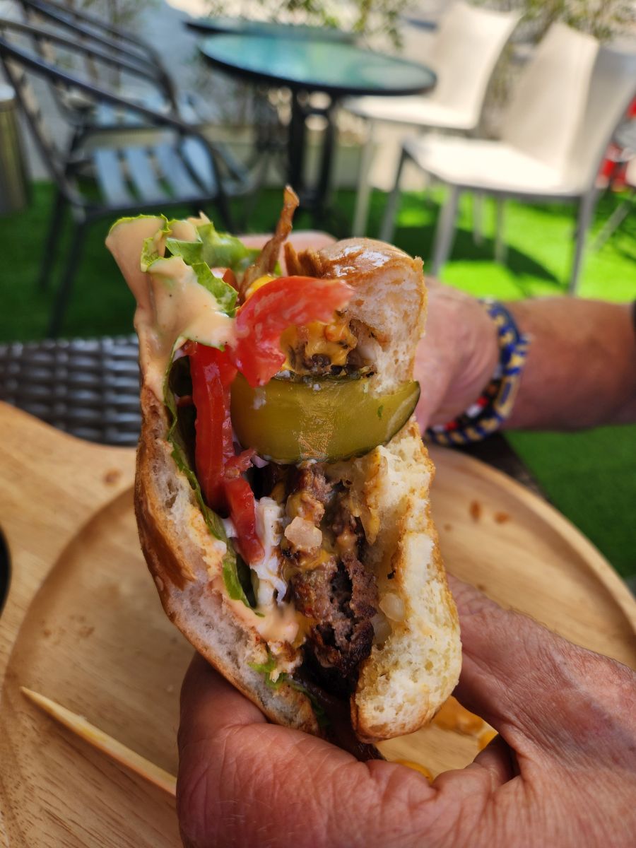 We arrived right as they opened, ordered our Junior burger (for me of course!) and an Aussie Egg Bacon burger for Ed and grabbed a table out on the patio area in front of the place. They didn’t have any alcohol, but there was a convenience store right next door, so Ed went off in search of beer and I happily guarded our table and my water. Beer purchase complete, burgers on the table, we dug into an excellent lunch. Just as good as at home – and at far less than half the cost!
