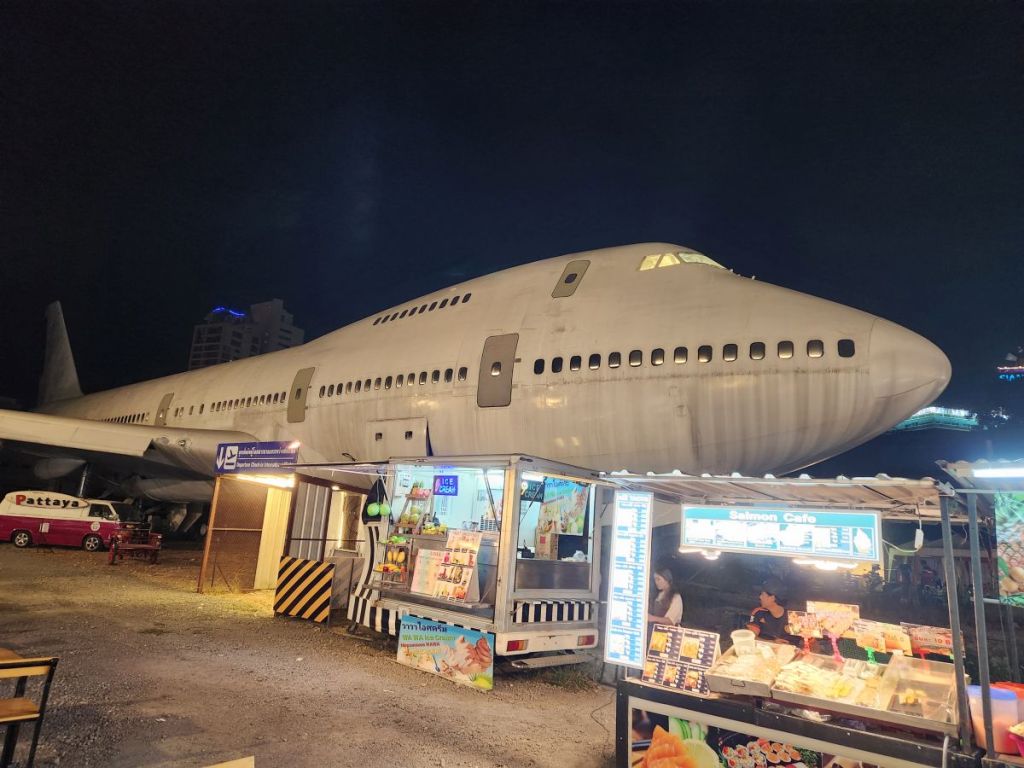 Instead of filling up here, we made our way down the street to the other food market, the Runway market. Don’t ask what’s up with all this airplane obsession. We’re clueless. But here again, there is a massive airplane parked in the back of the food market lot. Just bizarre!