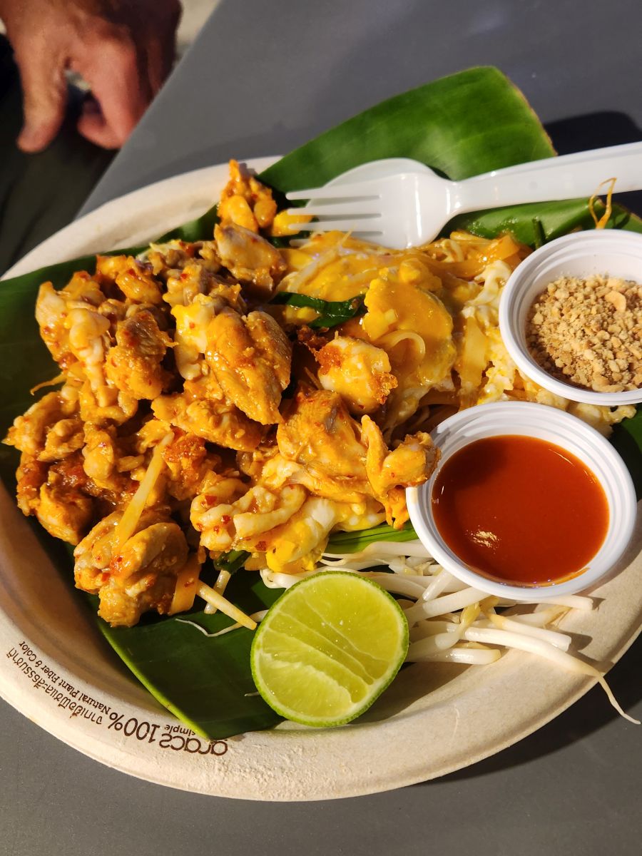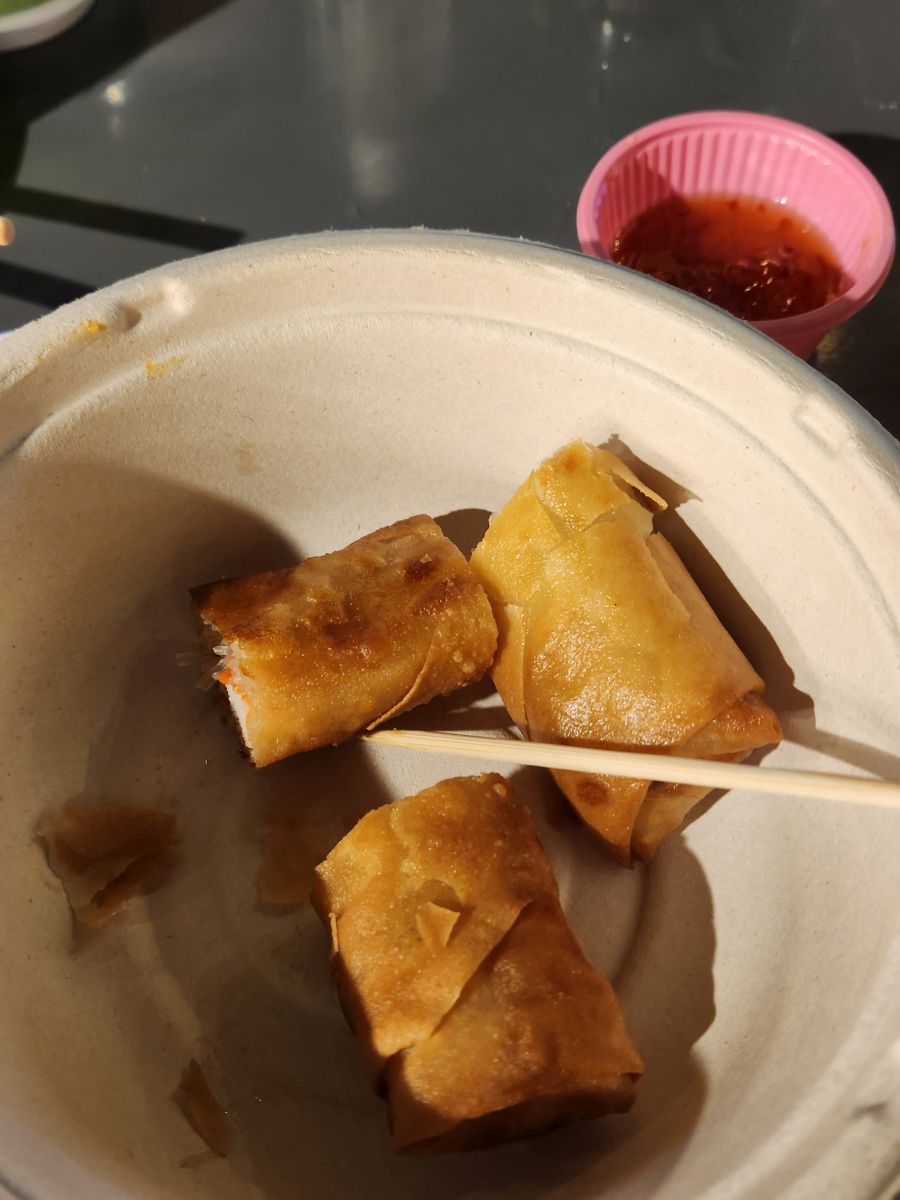 Unfortunately, nothing here rang our bell, so we headed back to the Marina court, where we found a great table near the band and feasted on some yummy spring rolls and even yummier seafood Pad Thai that was huge and chock full of seafood.