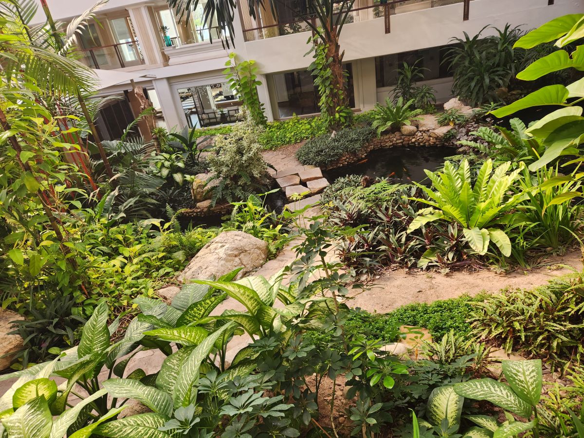 After breakfast and our last pictures of the lovely hotel atrium garden and view from the elevator sitting area…