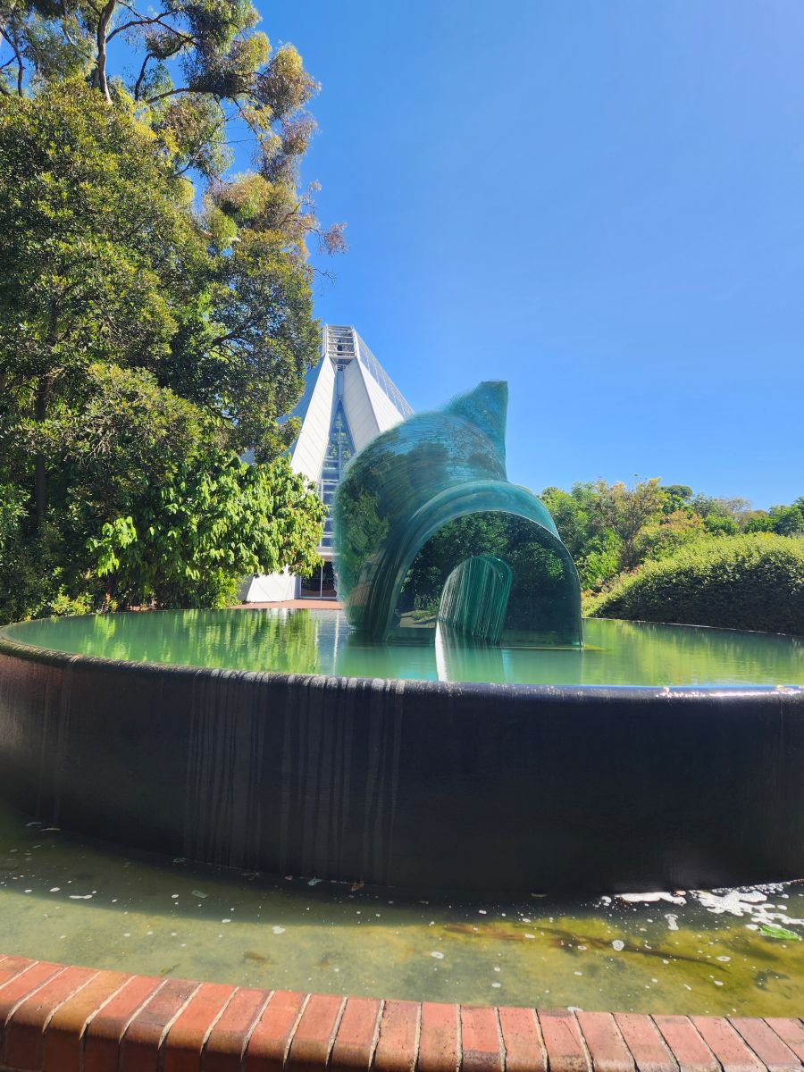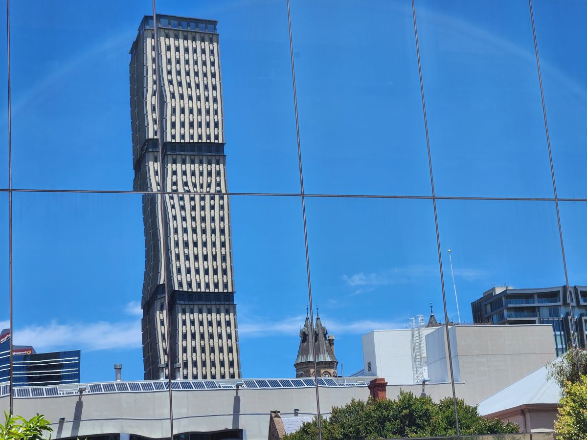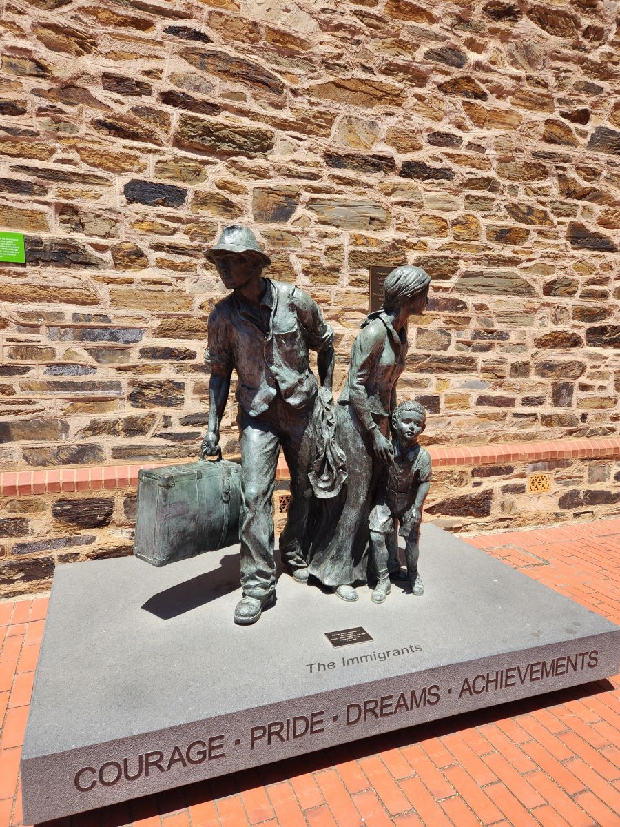 We were done with AGSA fairly quickly, faster than we anticipated, so we struck off through their courtyard out to the Migration Museum, getting a little lost on the way, but eventually succeeding in find the small entrance to the large interior courtyard and main entrance to the museum. Inside a series of rooms were exhibits on Aboriginal history, migration to South Australia, a war memorial and so much more. It was an excellent museum but no photos allowed. We could take photos outside however, and we did so of the Immigrants sculpture as well as the cool skyline reflections in the mirrored windows on the walls of the museum.