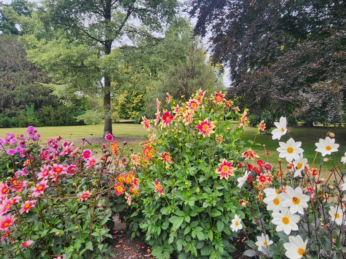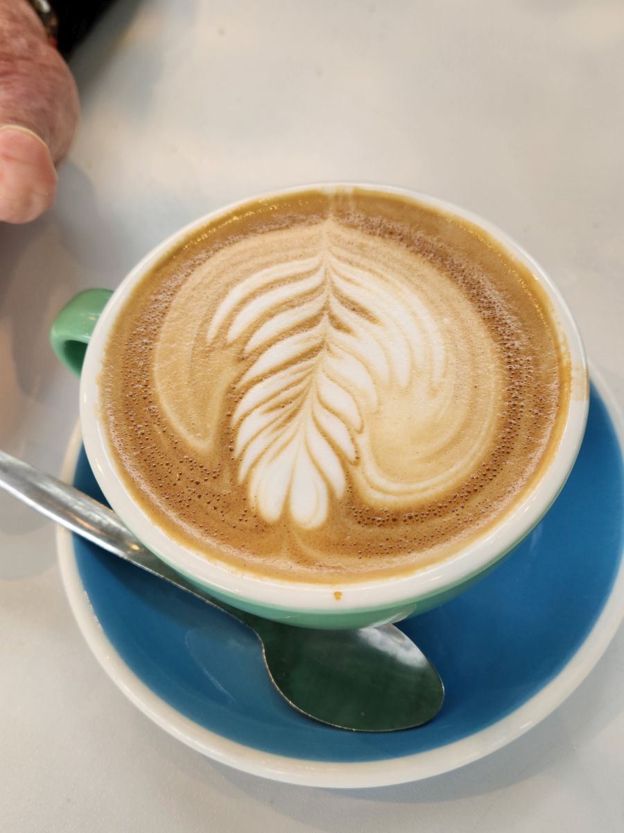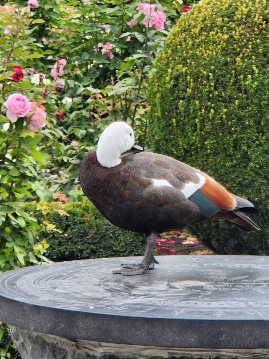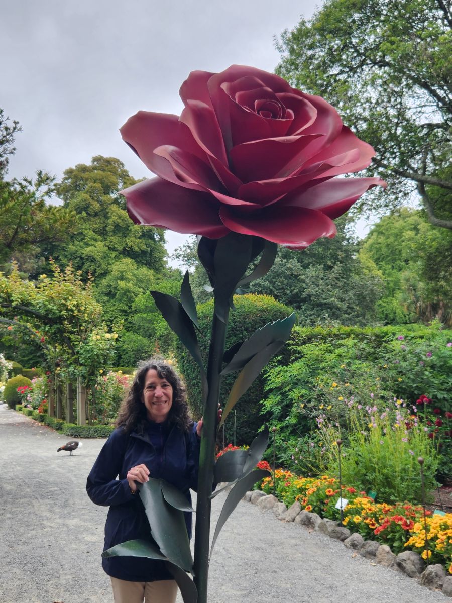 Next to the Bell are lovely zinnias and a wonderful rose garden, still very much in bloom. It is lovely to walk through all these flowering plants so late in the season (it is going on Fall here) and makes for a very pleasant morning. From the rose garden we spy the Garden café where we stop off for the restrooms, as well as a cappuccino and a flat white. We just figured out what flat whites are, and have decided to try them as they don’t have as much froth or whipped cream at the top and are supposed to have more espresso. The comparison is favorable – so we think we will now switch! And both coffees go quite well with the cream filled puff donut to which we succumbed.