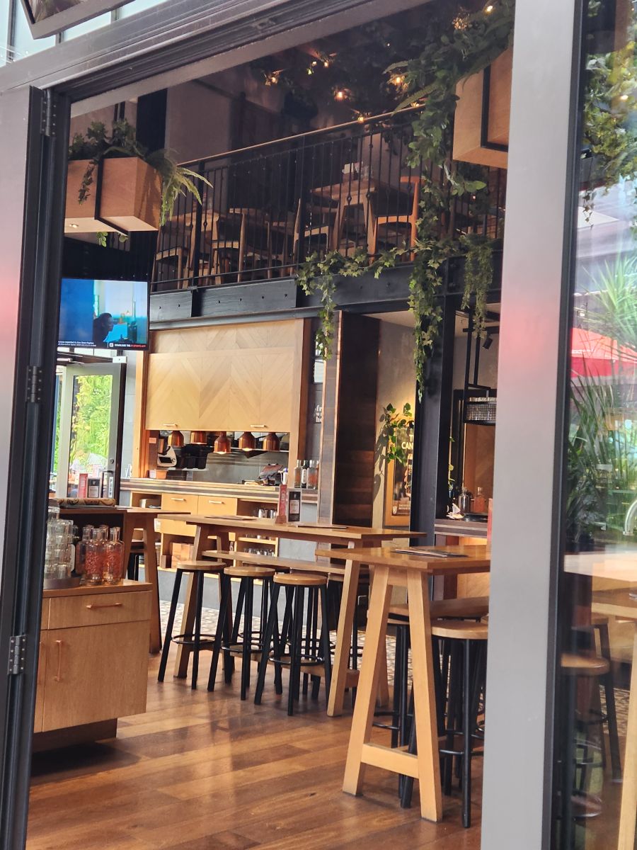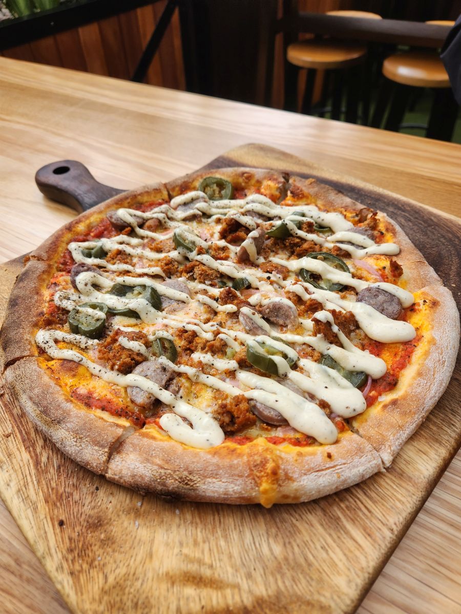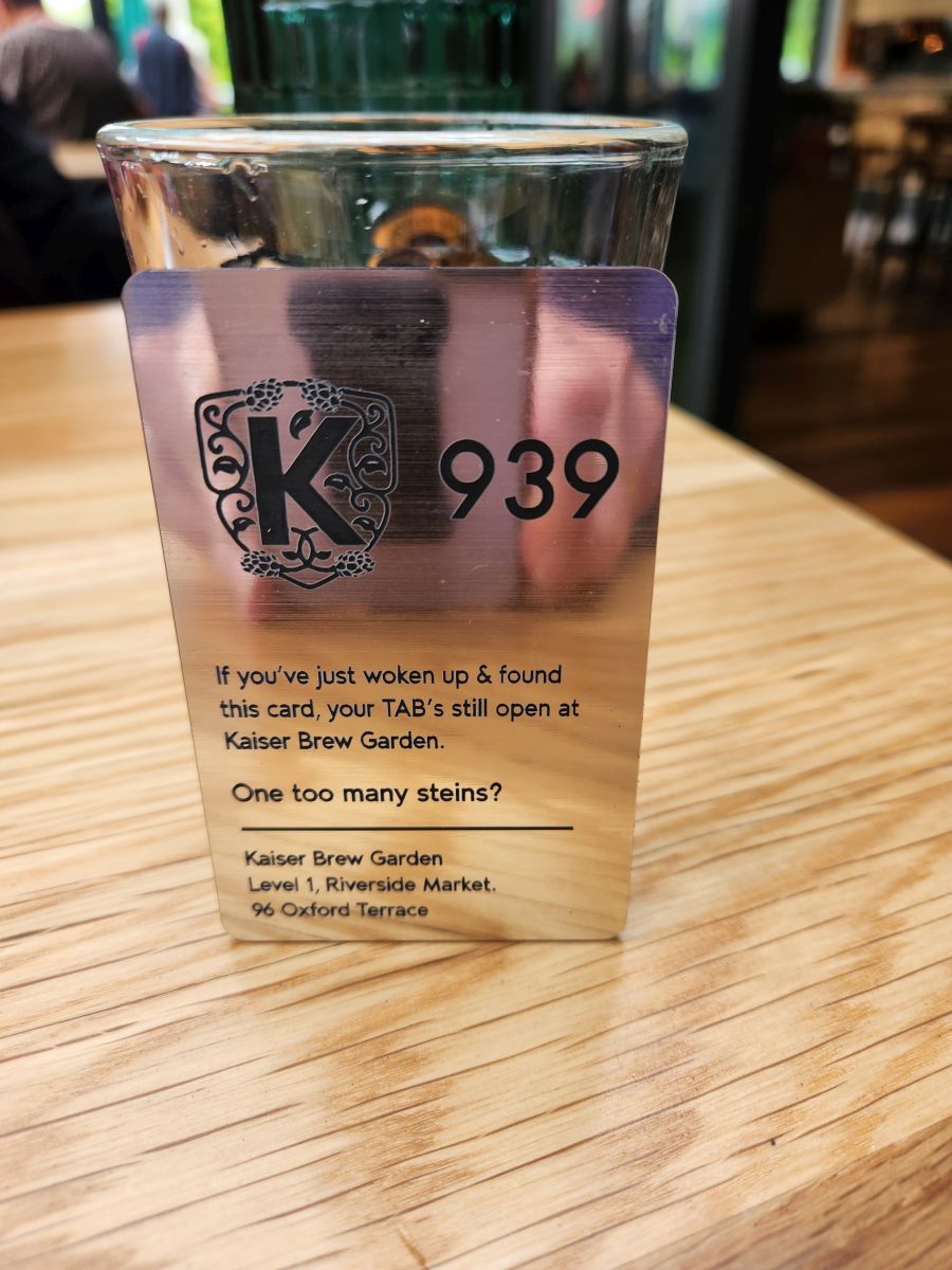 Inside the main area there are a ton of food stalls – but they are just so hard to eat at with very little table space and so many people milling around. We finally ended up at the Kaiser Brew Garden that was upstairs in the market. It was a great place, with an outdoor section that had an atrium like ceiling but was open air with huge windows and tons and tons of plants. A perfect place to rest a bit, have some great drinks and share a chorizo and kaiser sausage pizza. So good! Being as this was a beer garden, we figured it would be a pub type situation and we would pay when we ordered at the bar. But they have waitresses, and they just take your card and hold it for you, giving you this awesome heavy copper metal card with the cutest saying on it! Yep, too many steins!!!
