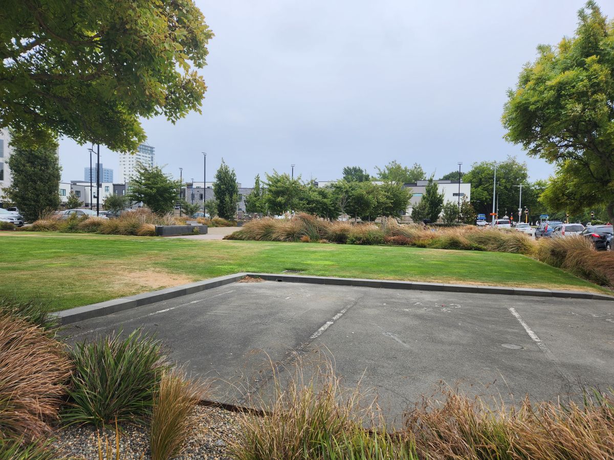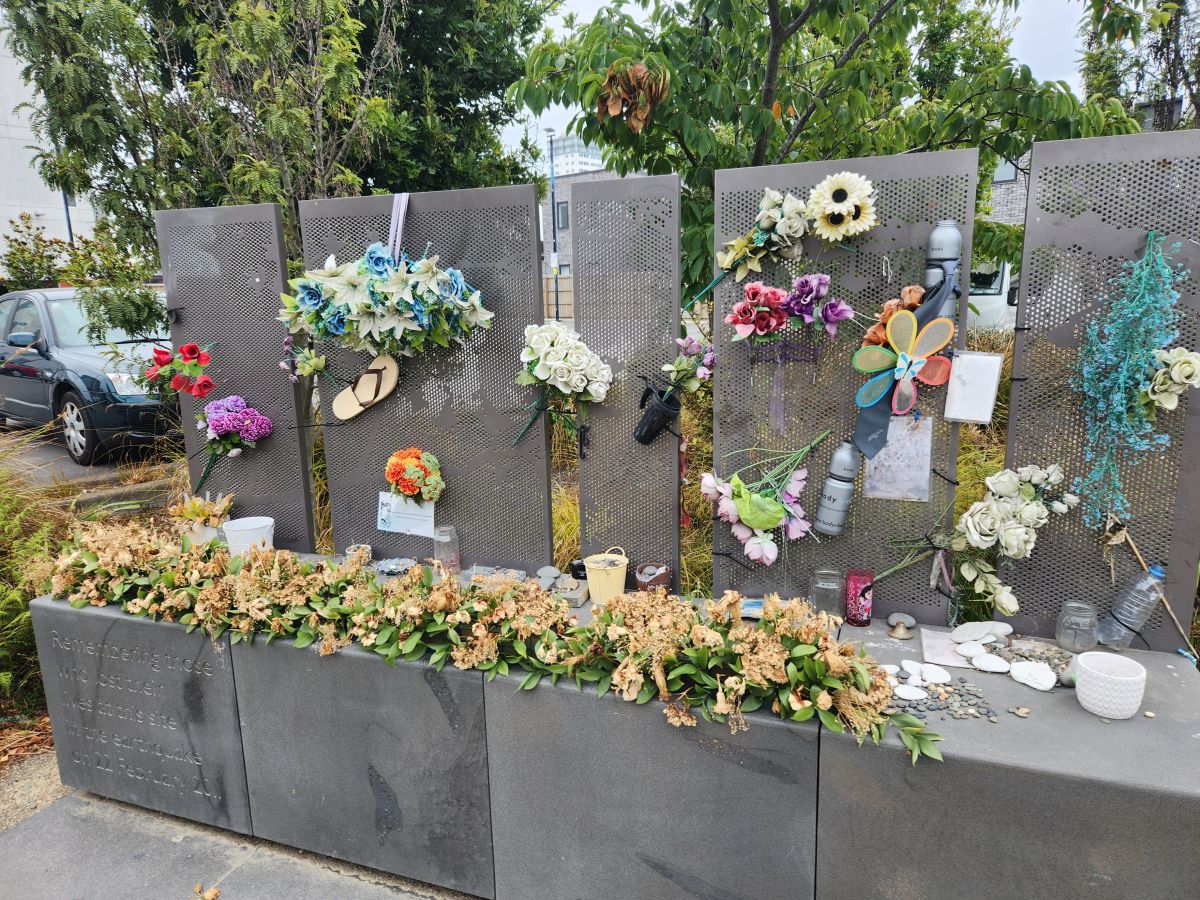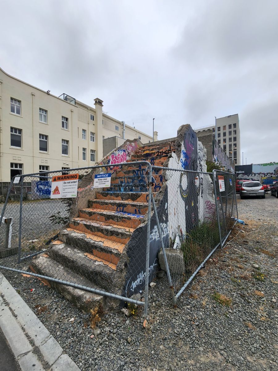 We wanted to go to the the CTV memorial park, the location of the CTV building where 115 people died when the it collapsed, but didn’t have any luck finding it. While we were quenching our thirst, we did some quick Google research, and lo and behold, the memorial park is less than a block from the transitional church – where we had just been. Okie dokie, more walking in our future! Back toward the church we go, easily finding the memorial which has the original tile entry floor still in place – as are 3 parking spaces with CTV stamped on Them. Poignant.