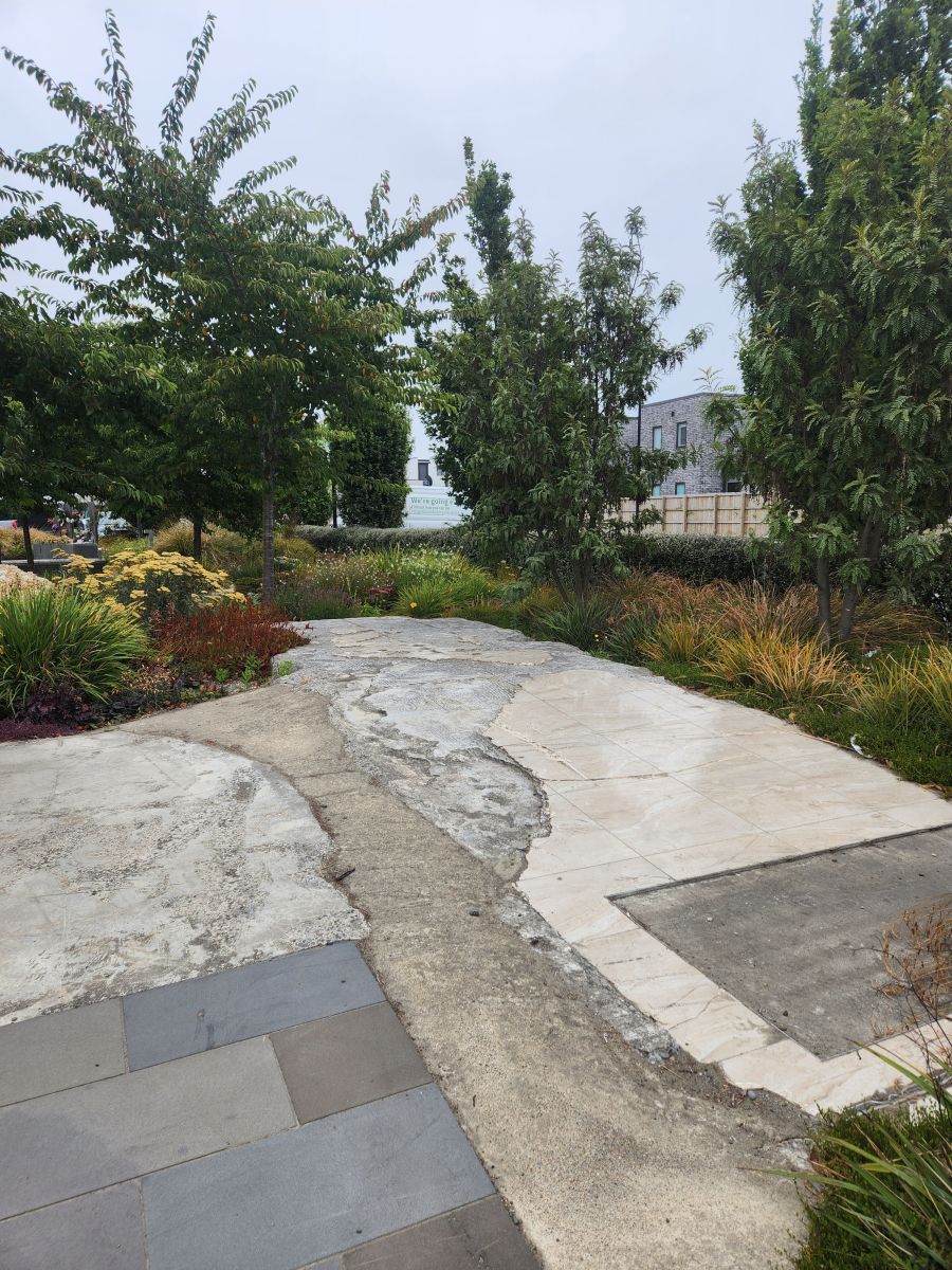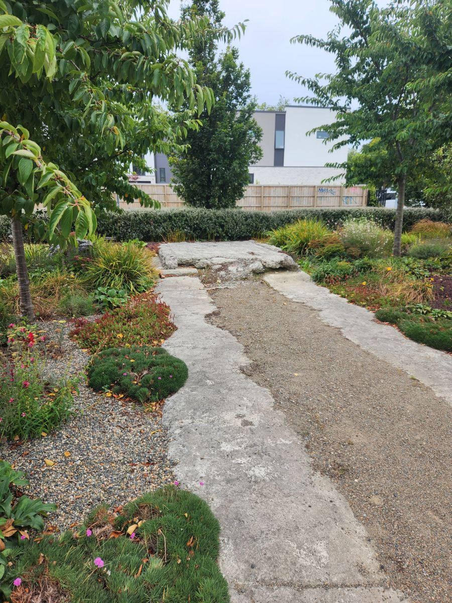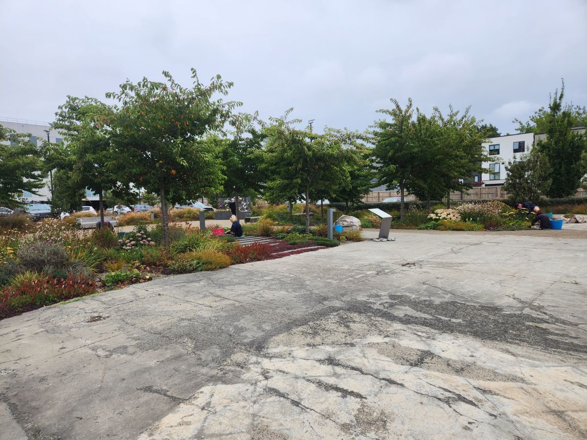 We wanted to go to the the CTV memorial park, the location of the CTV building where 115 people died when the it collapsed, but didn’t have any luck finding it. While we were quenching our thirst, we did some quick Google research, and lo and behold, the memorial park is less than a block from the transitional church – where we had just been. Okie dokie, more walking in our future! Back toward the church we go, easily finding the memorial which has the original tile entry floor still in place – as are 3 parking spaces with CTV stamped on Them. Poignant.