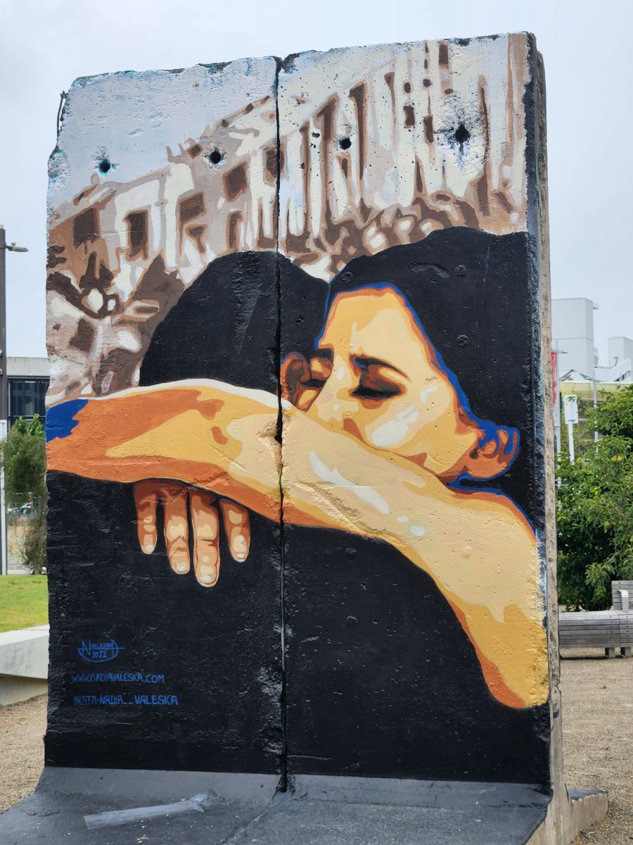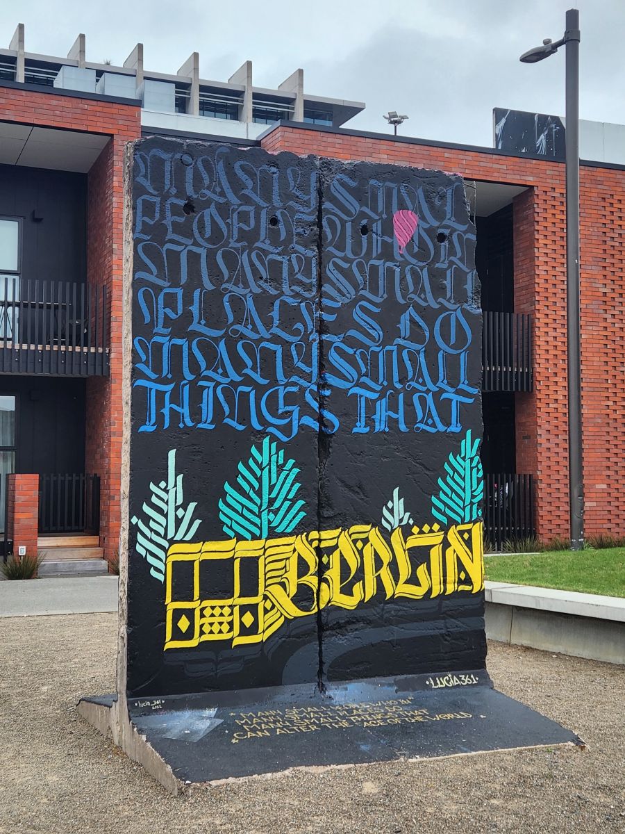 One last stop – at the earthquake memorial along the river – which is near the shuttle bus stop. On the way though, we pass a piece of the Berlin wall . As in Berlin, Christchurch artists continually refresh the paintings to keep up with the political and cultural sentiment of the moment. We finally reach the earthquake memorial, which is very lovely and peaceful a pretty little stretch of the river.