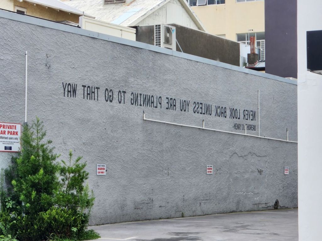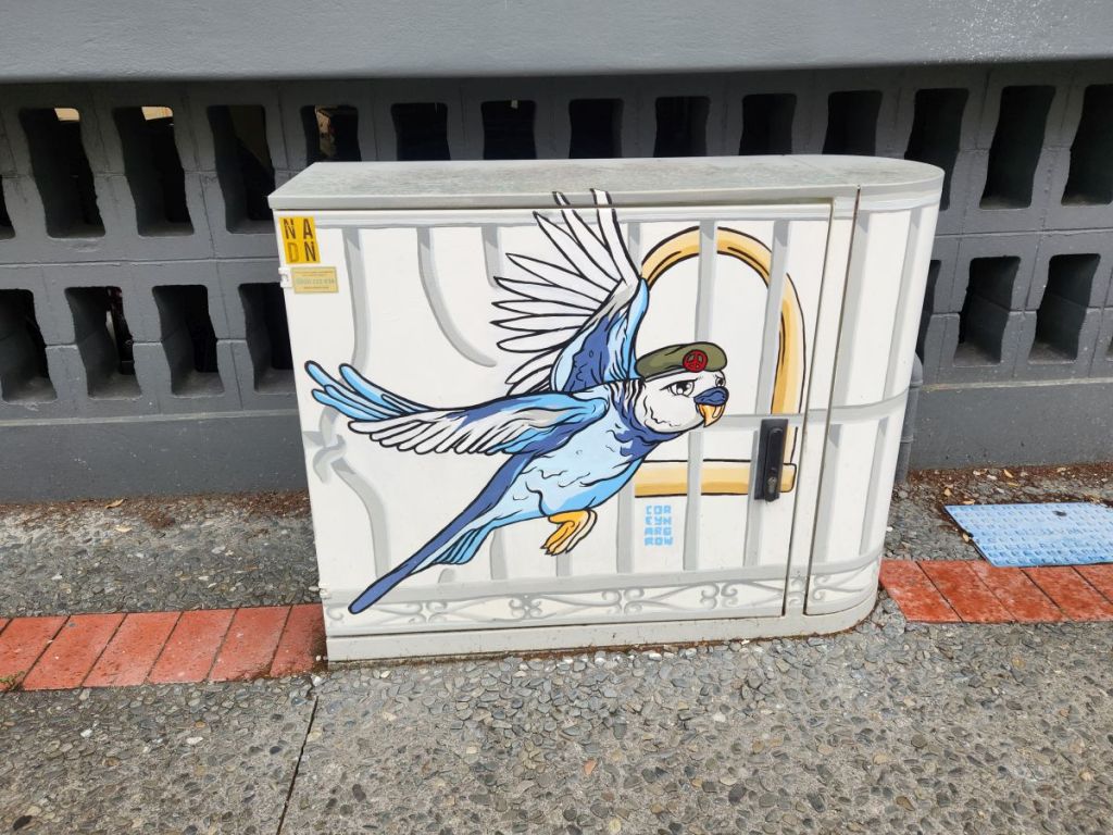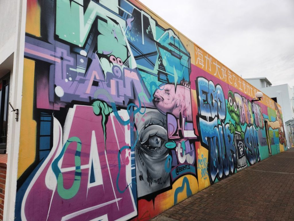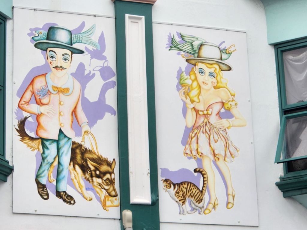 We walk all the way to the end of the main town area, to the war memorial, before circling back toward the waterfront. The buildings and the street art are really something to behold!