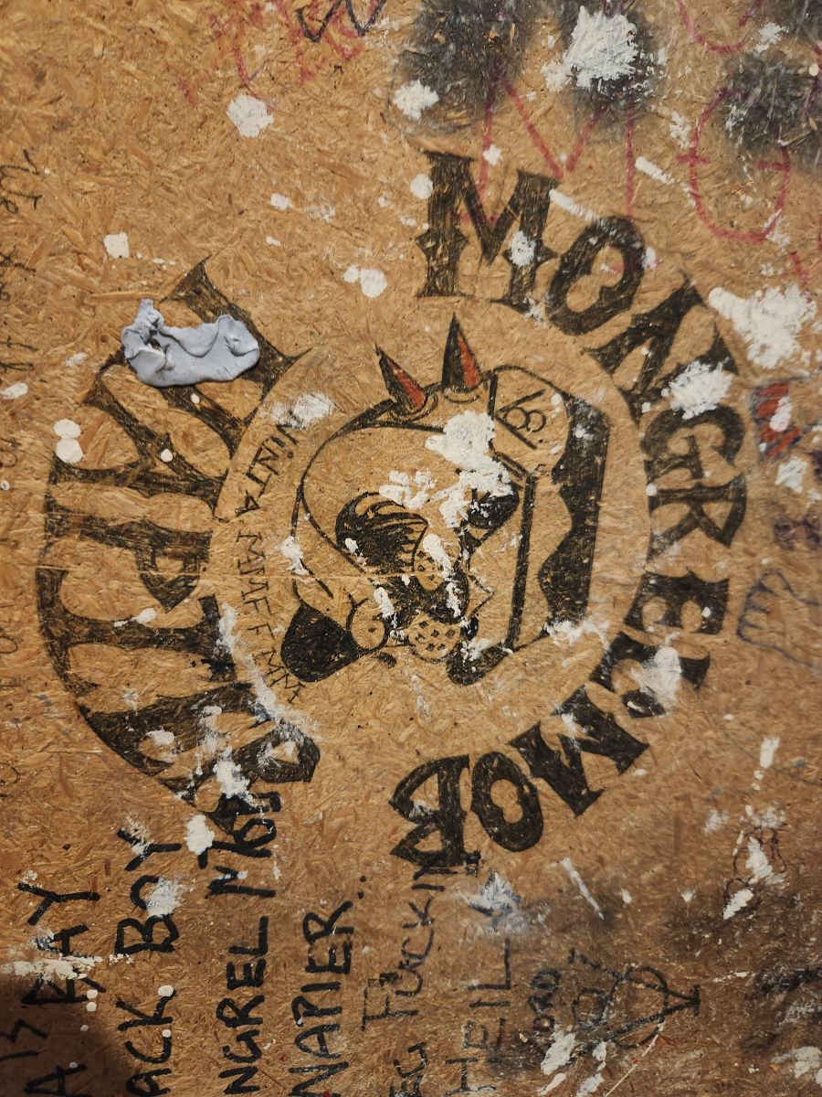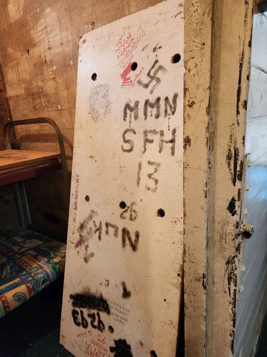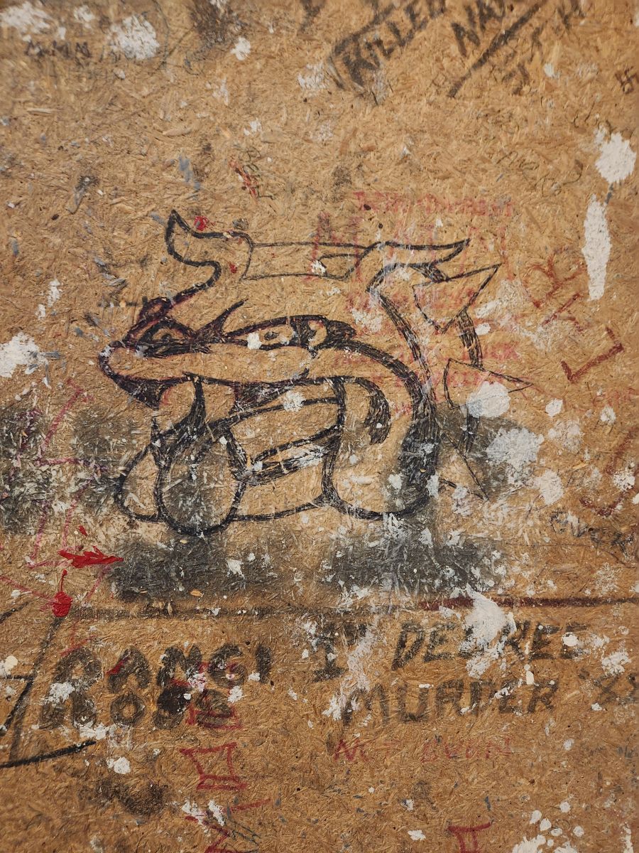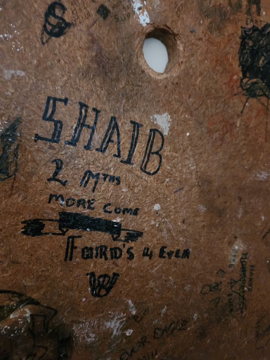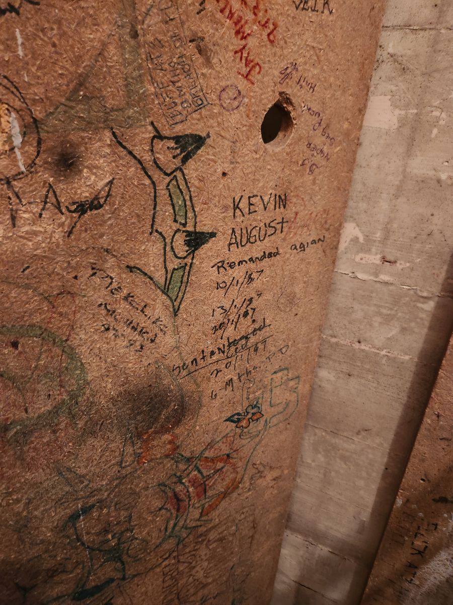 We saw all the graffiti in the Remand cells, mostly drawn on the bottom of the bed bases, by the Mongrel mob and other factions in the prison. One of the mob was so attached to the graffiti that he came back to prison just to get it.