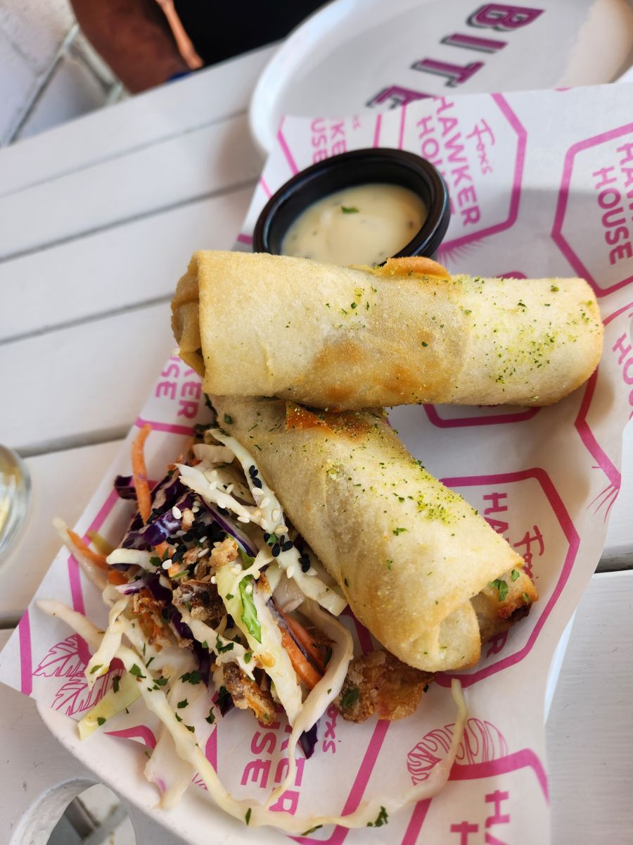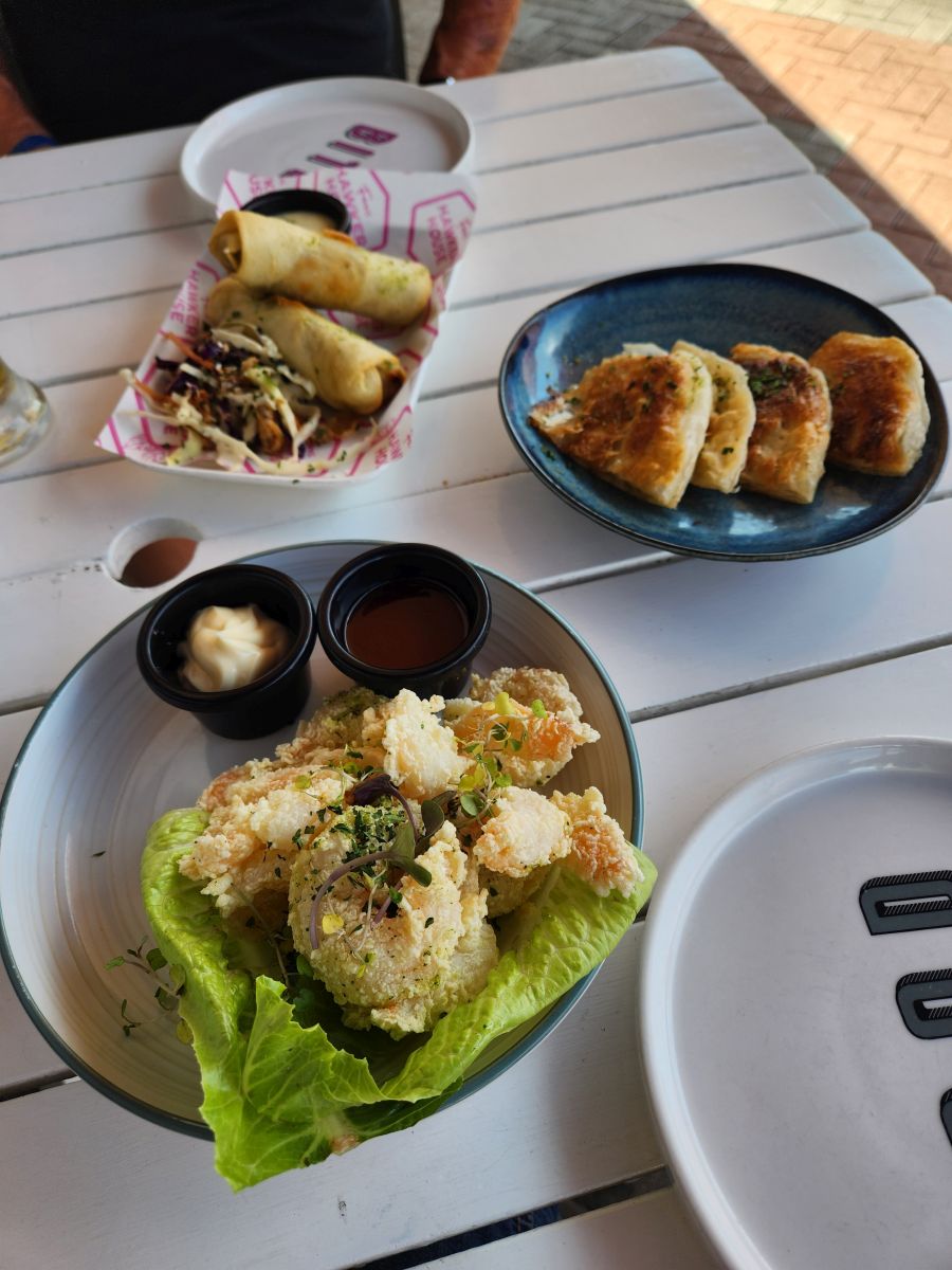 Now, though, time to explore the town and grab some lunch. After perusing the options, we chose Fox’s Hawker House for the menu and the shady sidewalk seating. A fun little place (that was actually bigger than we originally thought, with a huge outdoor patio in the back – sadly only discovered at the end of our lunch on a trip to the bathroom!) we thoroughly enjoyed a plate of huge tempura fried shrimp, totally different cheesesteak spring rolls and some roti. Perfect little lunch after our strenuous morning.