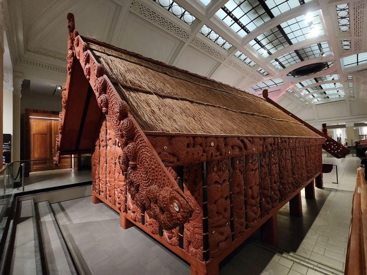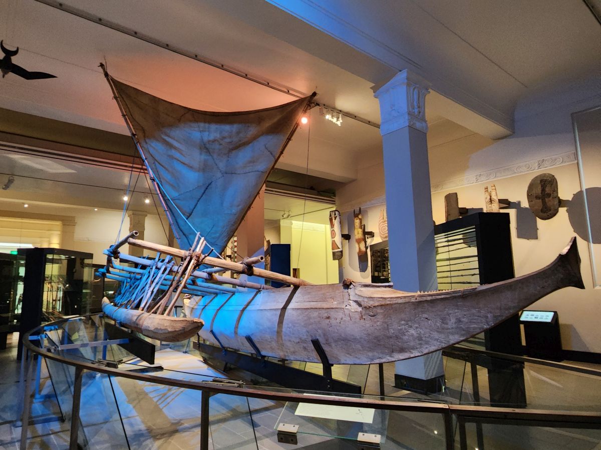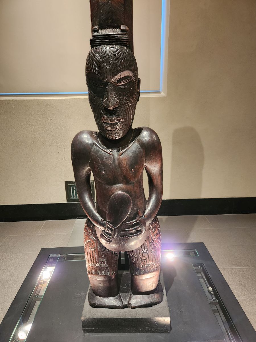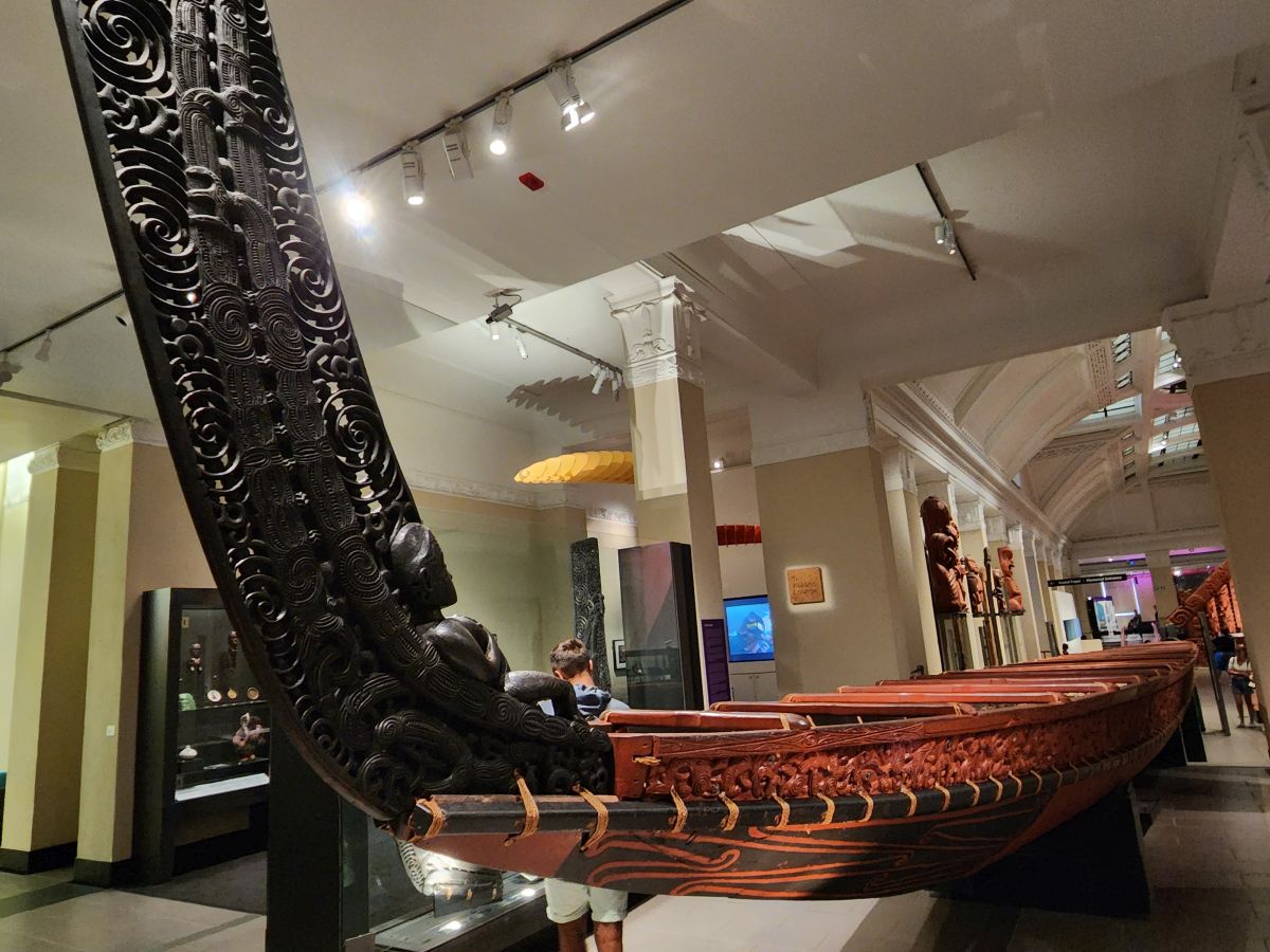 In the middle of the park lies the Auckland Museum, which was just opening as we arrived. Unfortunately, due to the storms, their credit card processing system was down. So this sweet gal walked us all over the museum to different entrances and machines, but couldn’t get any of them to work. She had us wait in the coffee shop while she went to find someone to help, and after a lovely cappuccino, we ended up getting in free. Bonus! To top if off, it was an amazing museum. Tons of exhibits and not just on the war – the bulk of the museum is devoted to Maori culture. They had artifacts and displays from all the different Polynesian islands too. We spent a great time wandering from room to room, exploring the jewelry (yes, #45 is a dog’s teeth necklace, and #57 is a fox teeth choker – eek), the traditional dress, the ceremonial huts (rebuilt to scale, I might add!) and the modes of transportation, i.e., canoes!