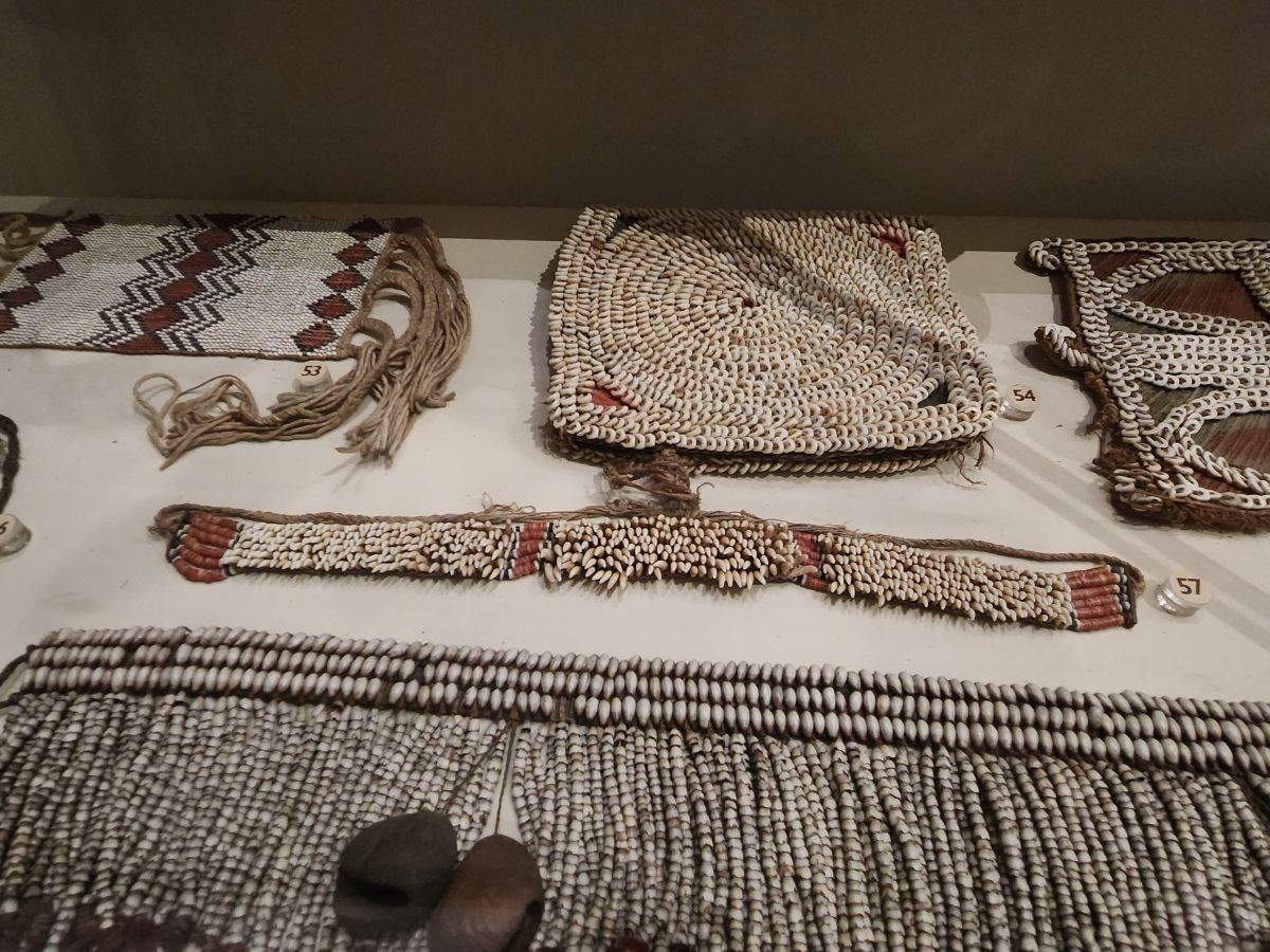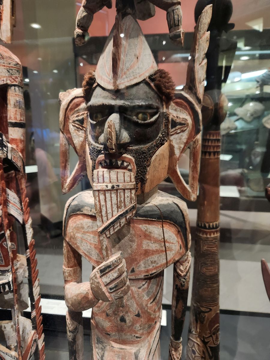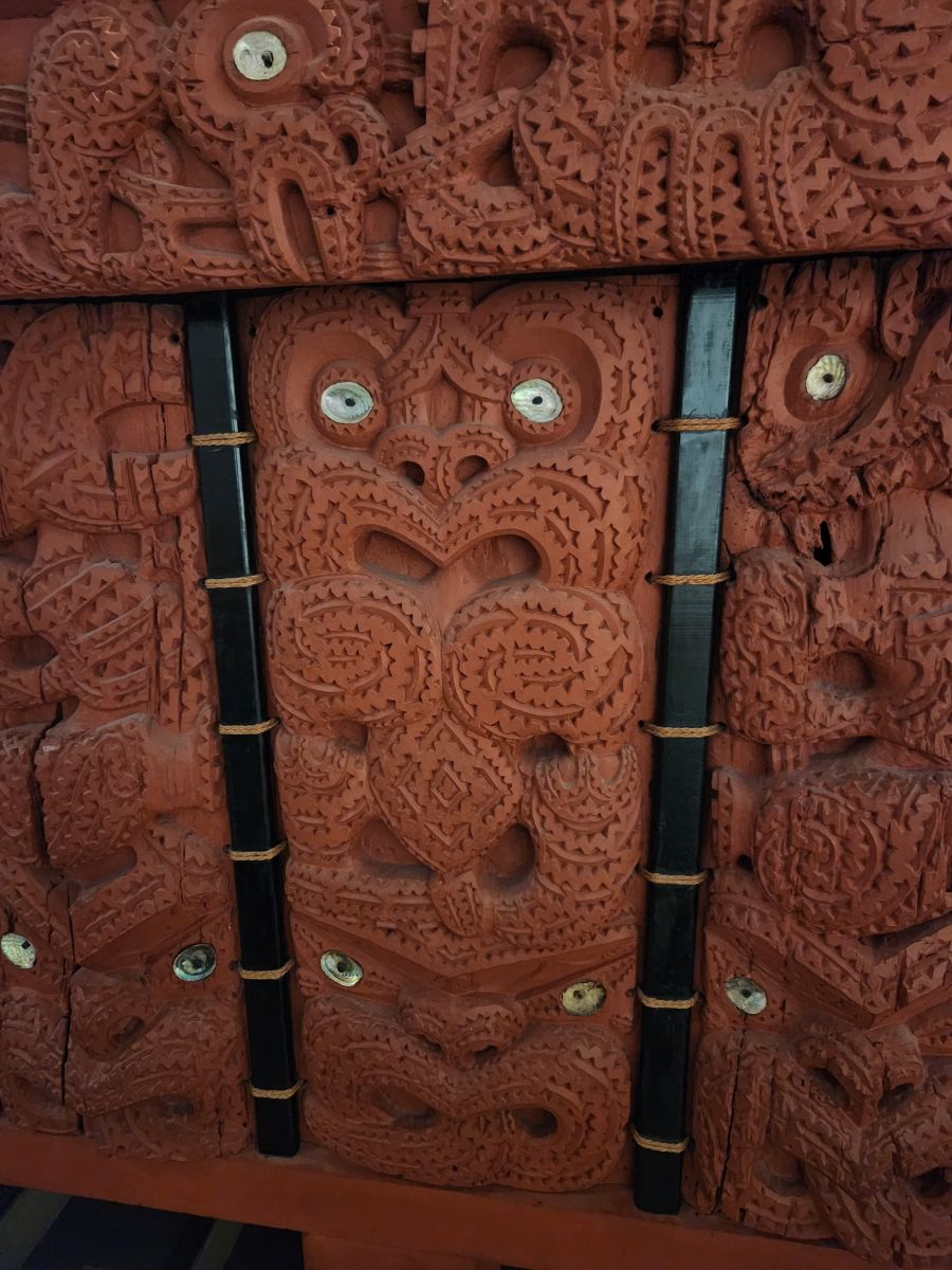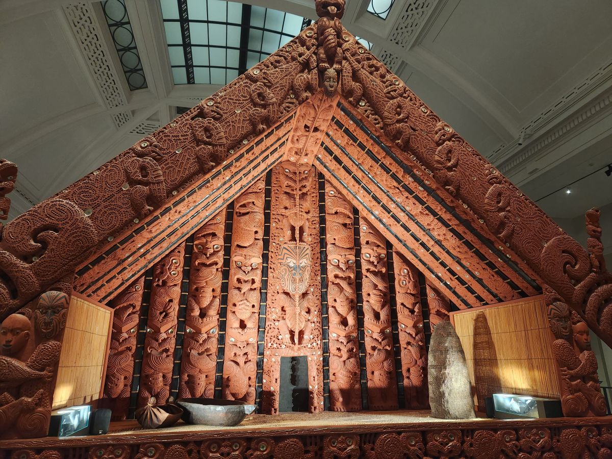 In the middle of the park lies the Auckland Museum, which was just opening as we arrived. Unfortunately, due to the storms, their credit card processing system was down. So this sweet gal walked us all over the museum to different entrances and machines, but couldn’t get any of them to work. She had us wait in the coffee shop while she went to find someone to help, and after a lovely cappuccino, we ended up getting in free. Bonus! To top if off, it was an amazing museum. Tons of exhibits and not just on the war – the bulk of the museum is devoted to Maori culture. They had artifacts and displays from all the different Polynesian islands too. We spent a great time wandering from room to room, exploring the jewelry (yes, #45 is a dog’s teeth necklace, and #57 is a fox teeth choker – eek), the traditional dress, the ceremonial huts (rebuilt to scale, I might add!) and the modes of transportation, i.e., canoes!