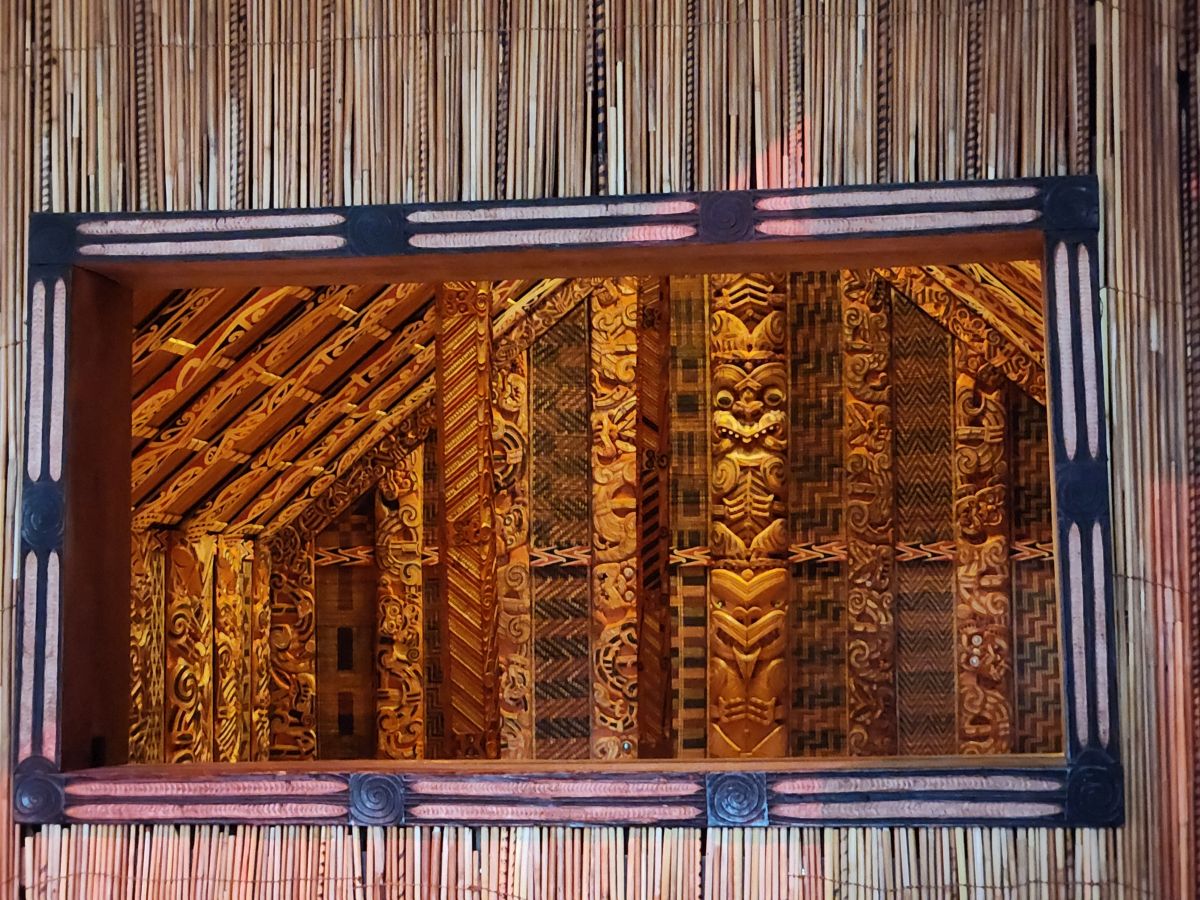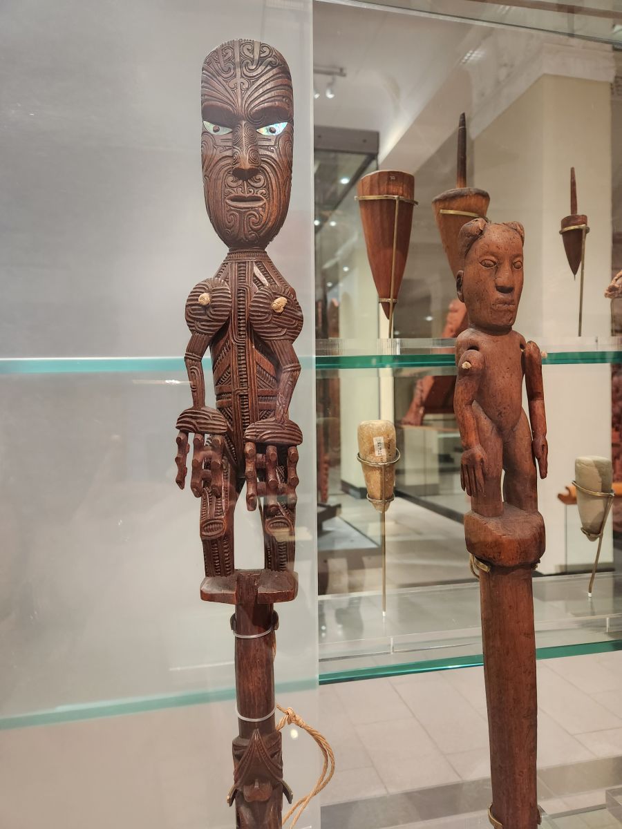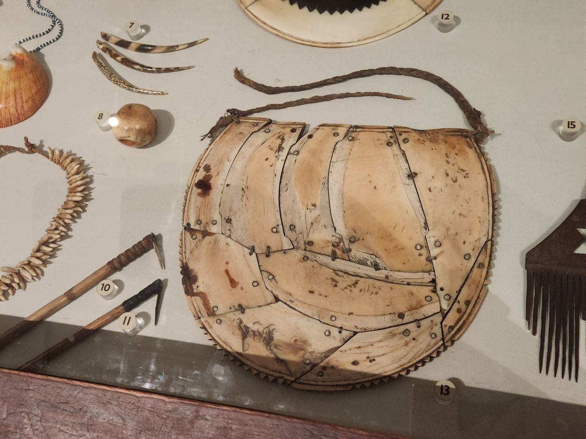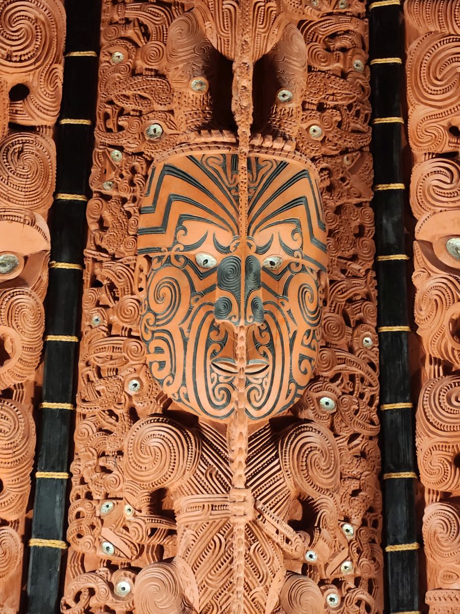 In the middle of the park lies the Auckland Museum, which was just opening as we arrived. Unfortunately, due to the storms, their credit card processing system was down. So this sweet gal walked us all over the museum to different entrances and machines, but couldn’t get any of them to work. She had us wait in the coffee shop while she went to find someone to help, and after a lovely cappuccino, we ended up getting in free. Bonus! To top if off, it was an amazing museum. Tons of exhibits and not just on the war – the bulk of the museum is devoted to Maori culture. They had artifacts and displays from all the different Polynesian islands too. We spent a great time wandering from room to room, exploring the jewelry (yes, #45 is a dog’s teeth necklace, and #57 is a fox teeth choker – eek), the traditional dress, the ceremonial huts (rebuilt to scale, I might add!) and the modes of transportation, i.e., canoes!
