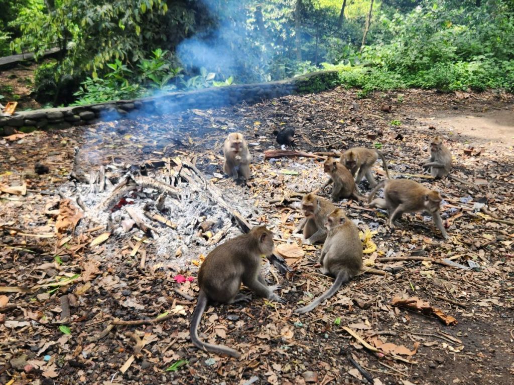 Then we climb even more stairs to the cemetery, passing along the way a monkey trying to open a coconut. Ok – we could stay here all day watching these cute little things! Dragging ourselves away from the coconut monkey, we enter the cemetery to find a whole group of monkeys, wandering through the tombstones of their relatives, and grabbing hot food out of what appears to be a trash fire smoldering at the back of the plots. There is definitely and alpha male here who keeps chasing the other monkeys away from the food and the embers. Makes for great watching – and they don’t care we are here. They just wander around, so close to you! You have to be careful where you walk so you don’t step on them.