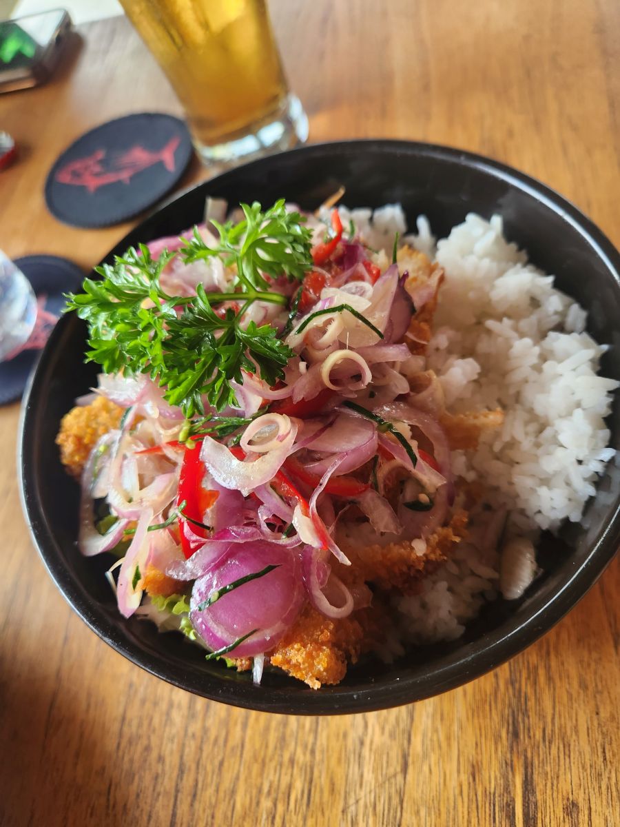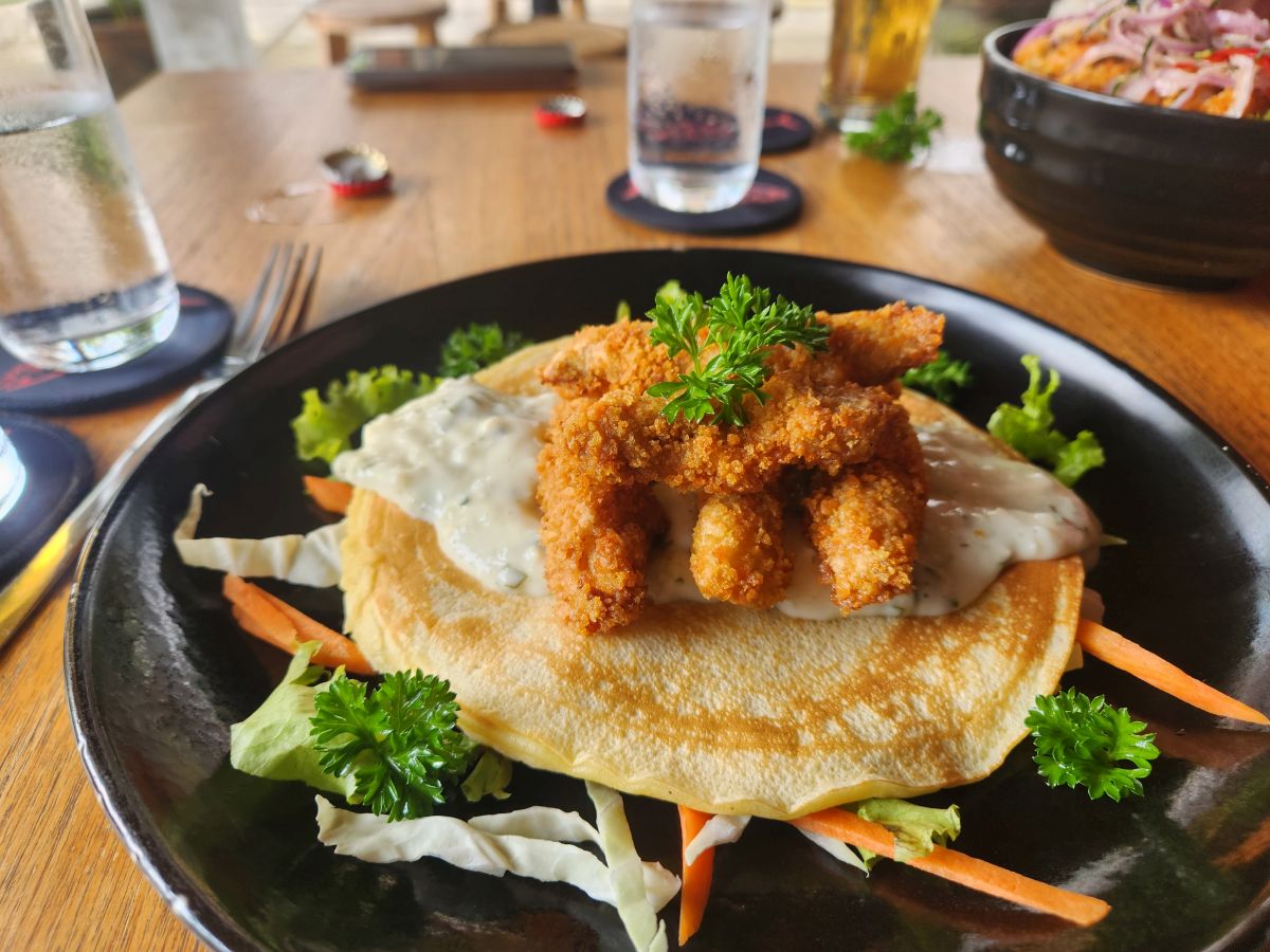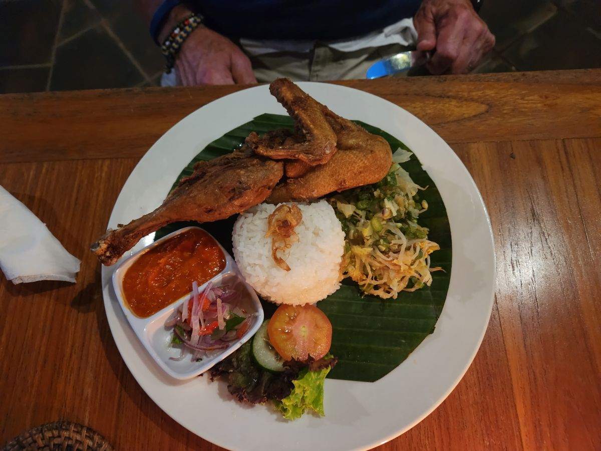 It is lunch time, so we stop at Garcon, one of the many, many restaurants that populate our street (and the whole of Ubud). Hanging out on the patio – we are too hot to go inside, we need to get used to this heat – we order a great lunch of fried chicken on a pancake (weird but oh so good!) and crispy fried fish sambal matah – both incredibly good and of course, both incredible cheap. Yeah, I’m not going to keep saying that. Suffice it to say, cost of living here is insanely cheap.