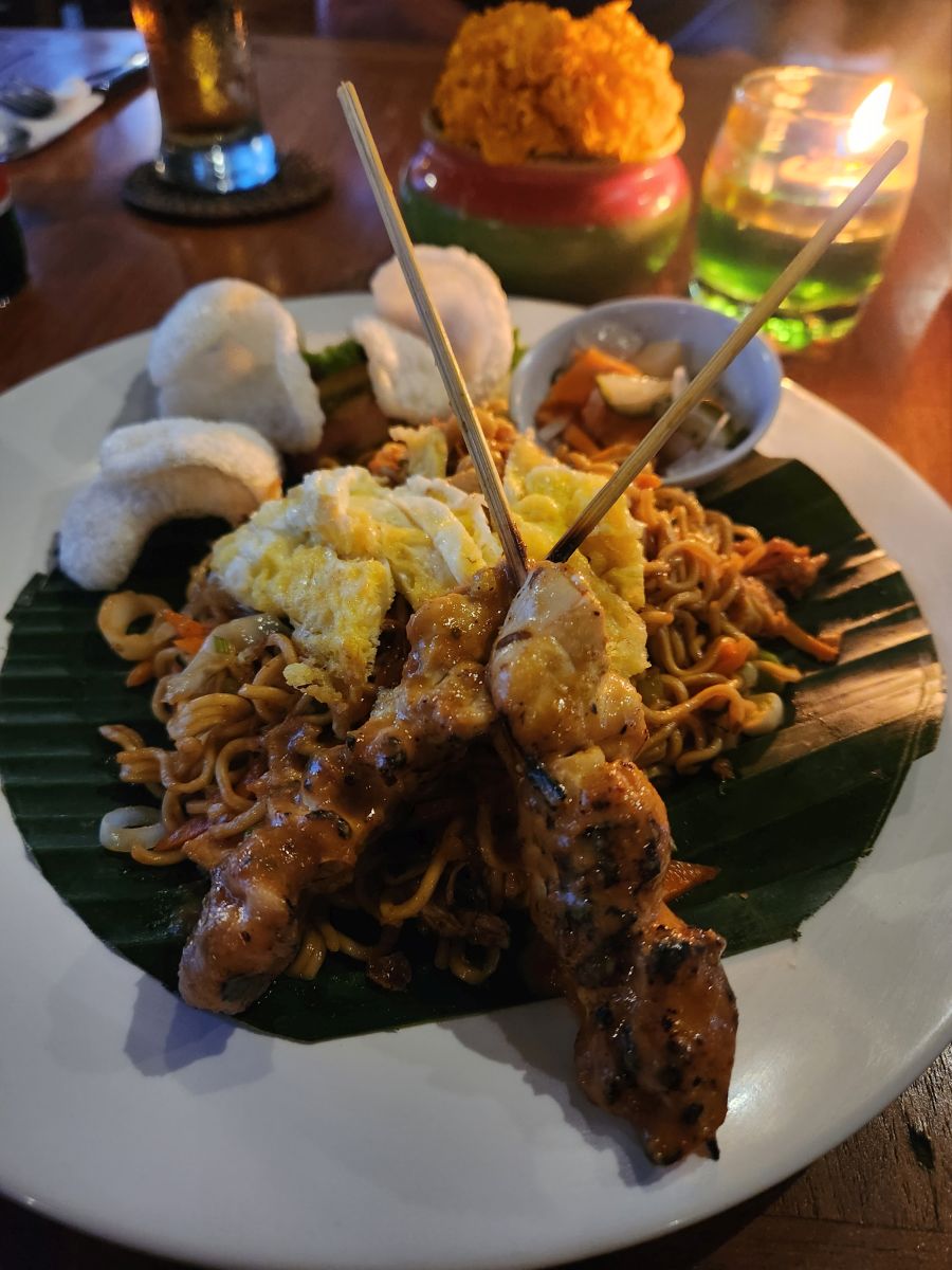 Luckily the rain does stop and we head out – this time on the footpath that is far preferable from the muddy-under-construction street – to find our dinner. Tonight we choose Lemongrass which overlooks a beautiful rice field, making for a lovely view during dinner. Tonight it is Mie Goreng Ayam for me, and crispy duck for Ed – both of which are fabulous. And you can’t beat the setting, as dusk settles in, a lovely breeze blows as the rice field fades into darkness.