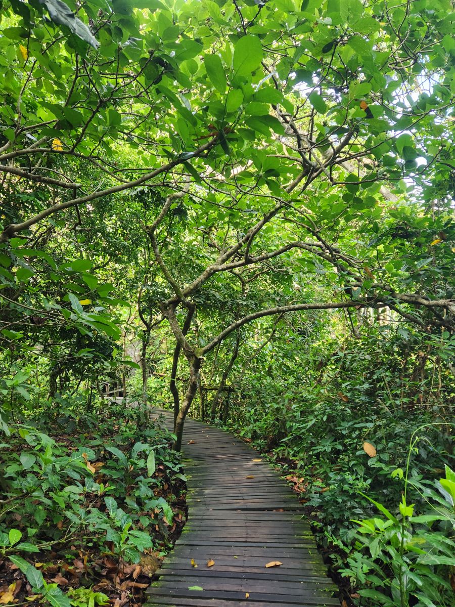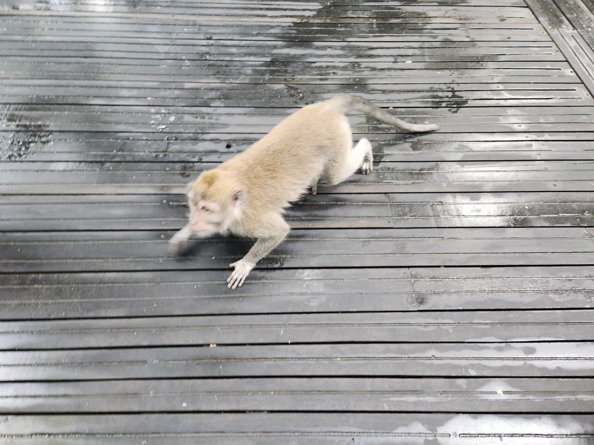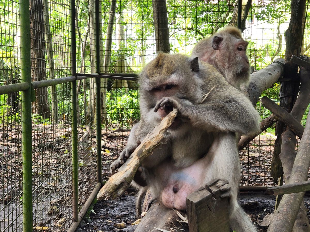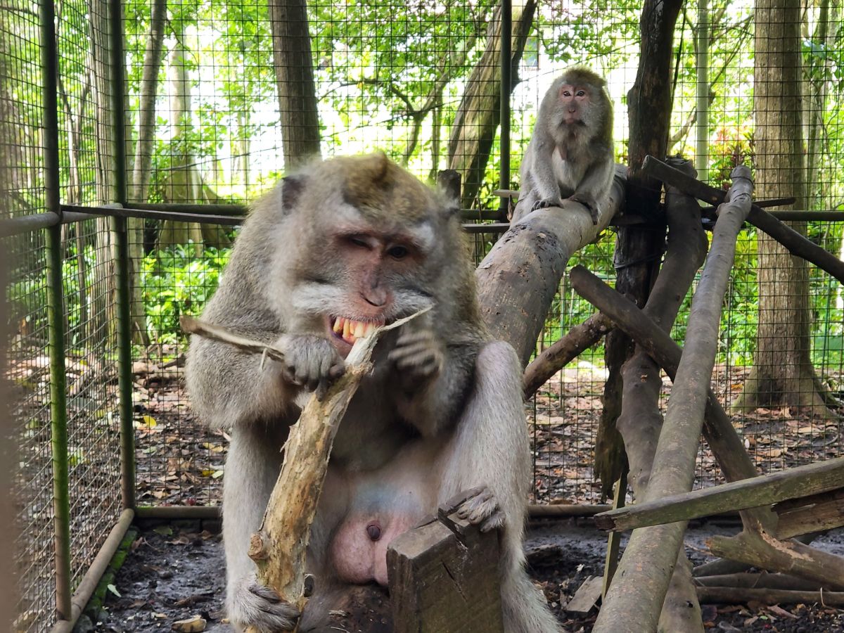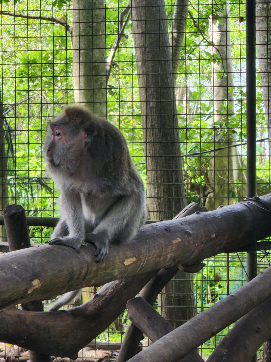 This forest has a group of free range monkeys, but also cages for recovering monkeys. Two sweet little monkeys are housed together – Nelson who is virtually blind and Tumsist who had an accident in 2019 and had to have one arm and a foot amputated. Aw. They are really sweet looking though, hanging out in their cage with Nelson chewing on coconut tree bark and Tumsist looking on.