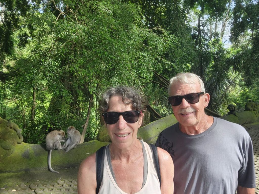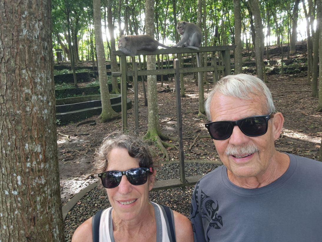 But in addition to the calm and “ignoring” monkeys, there is also a feisty monkey who has decided he likes me and my backpack a little too much! The darn thing hops on me and hangs off my backpack – going for a ride! Oh god – it is hysterical. I’m telling him no, get off – but I know I can’t touch him. All the signs say to just calmly walk away, but that doesn’t necessarily work when a monkey is hanging off of you….I finally dislodge the little thing and he goes after Ed. Oh – this is going to be a fun morning! We can tell! And of course we have no good pictures because we are too busy trying to get the damn monkey off my back….pack…..sorry, couldn’t resist! The only 2 we have are of me yelling at the monkey, and the culprit once he has fallen off of me and is starting to lurch for Ed