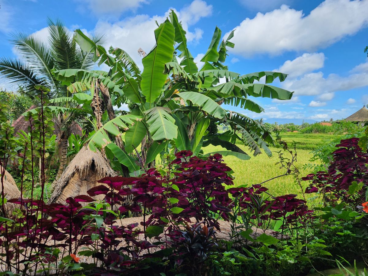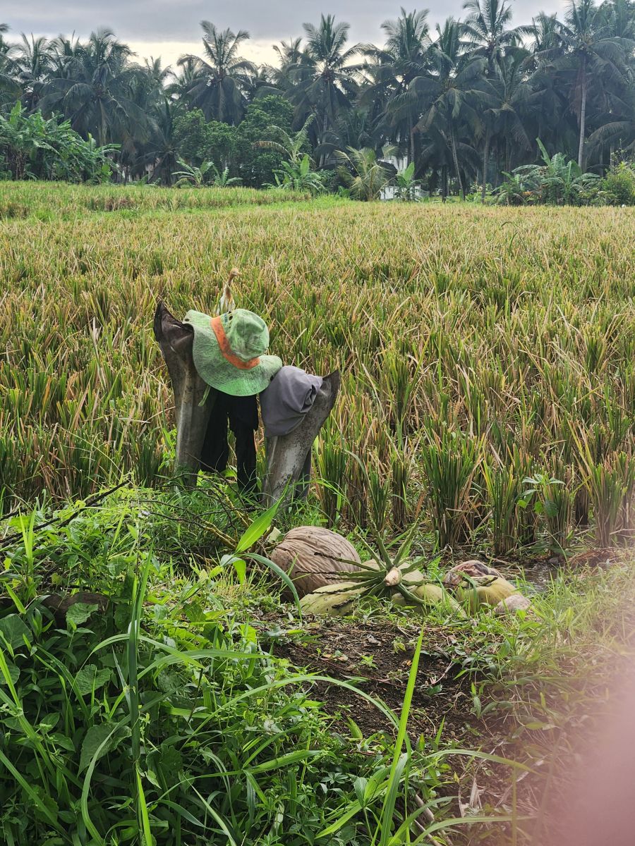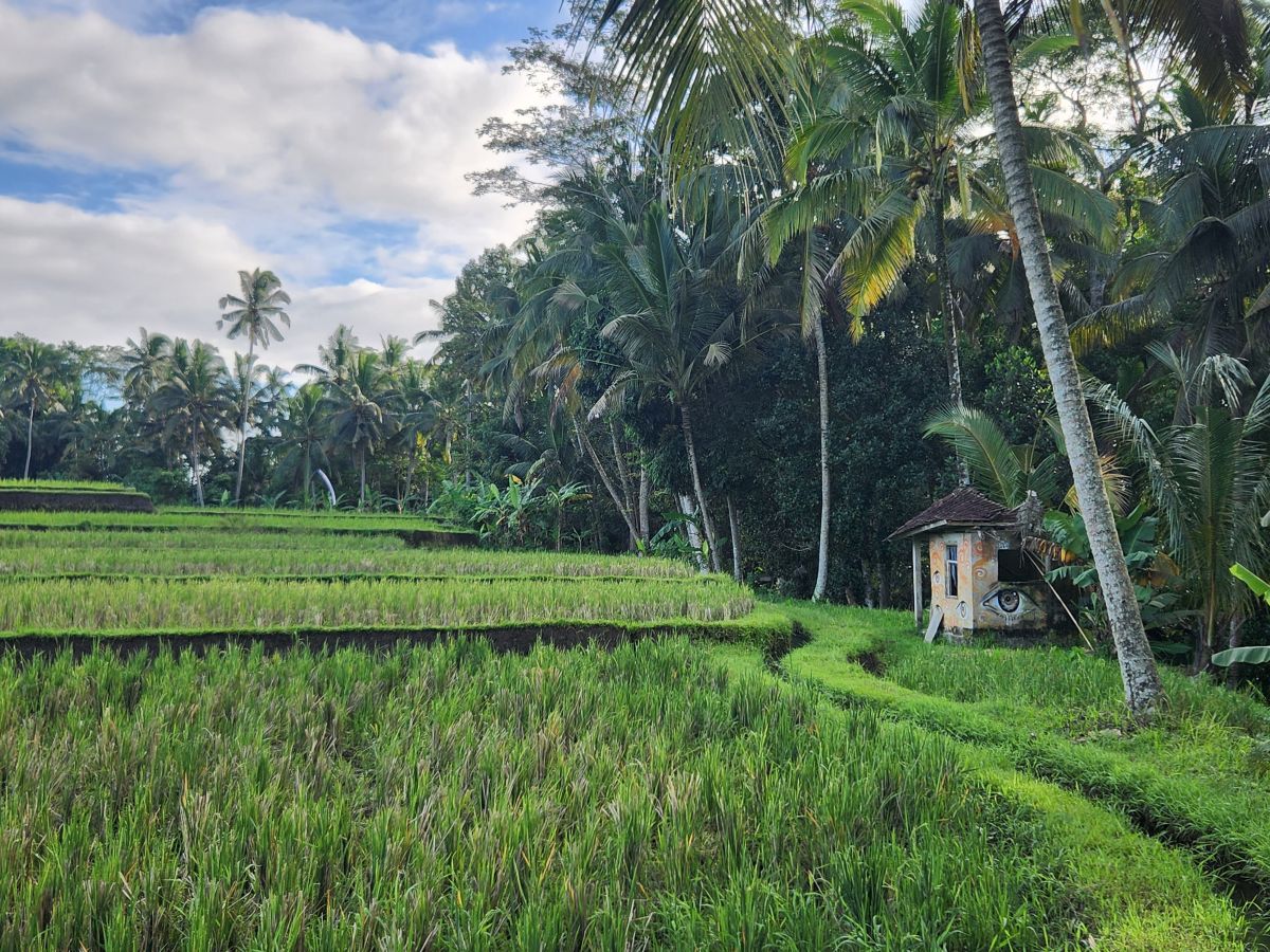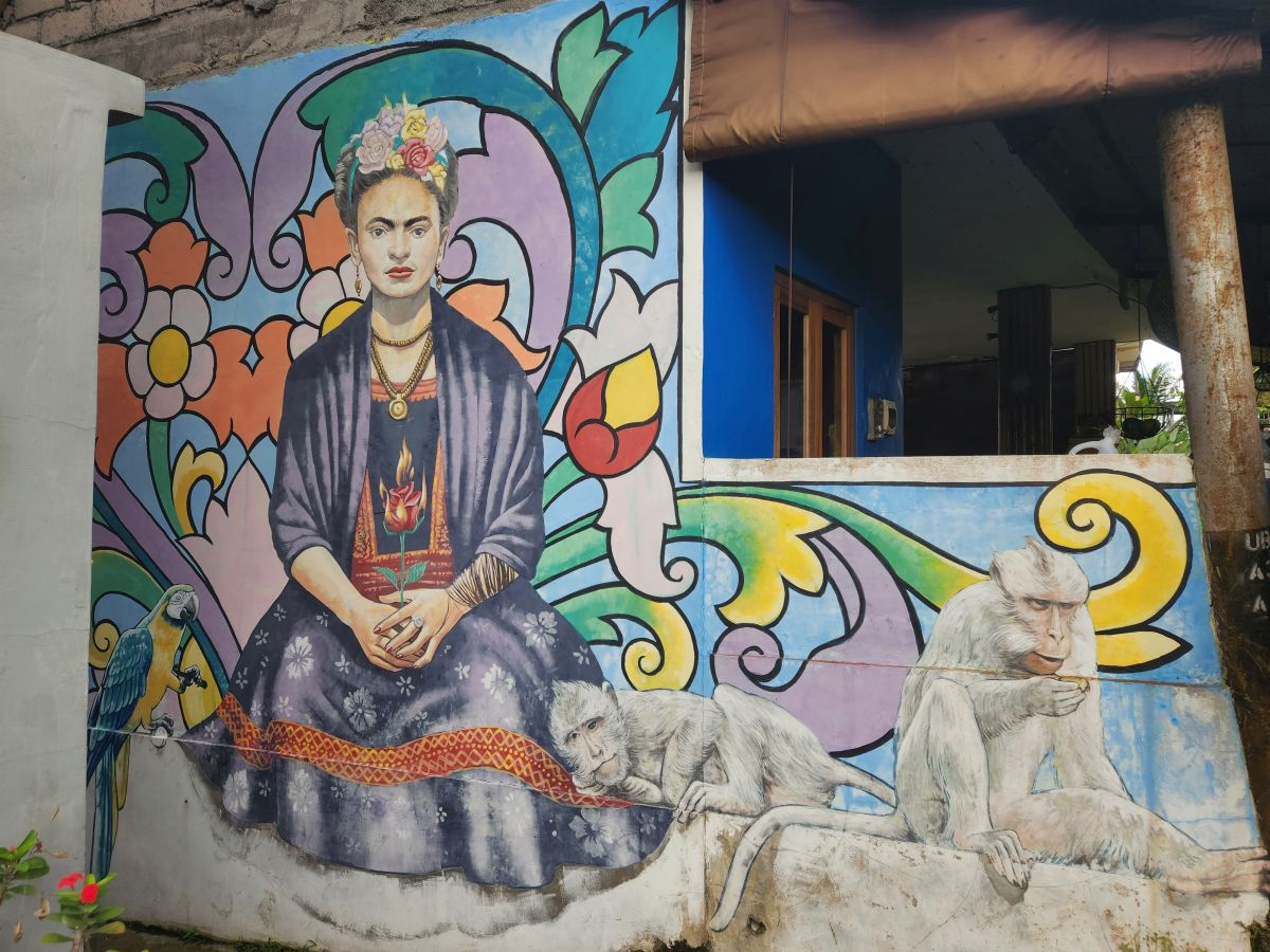 We’ve learned our lesson – we are up and out early this morning. To beat the heat…and the scooters! Our strategy works, and we have a lovely morning walk along the rice field path, past the mural with the man/woman (yeah, he/she is everywhere in the world and I still don’t really know what or who it is supposed to represent!) with the monkeys on one of the first buildings you pass on the walk, further on, watching the farmers in the field and the ducks doing their jobs, eating the insects and parasites.