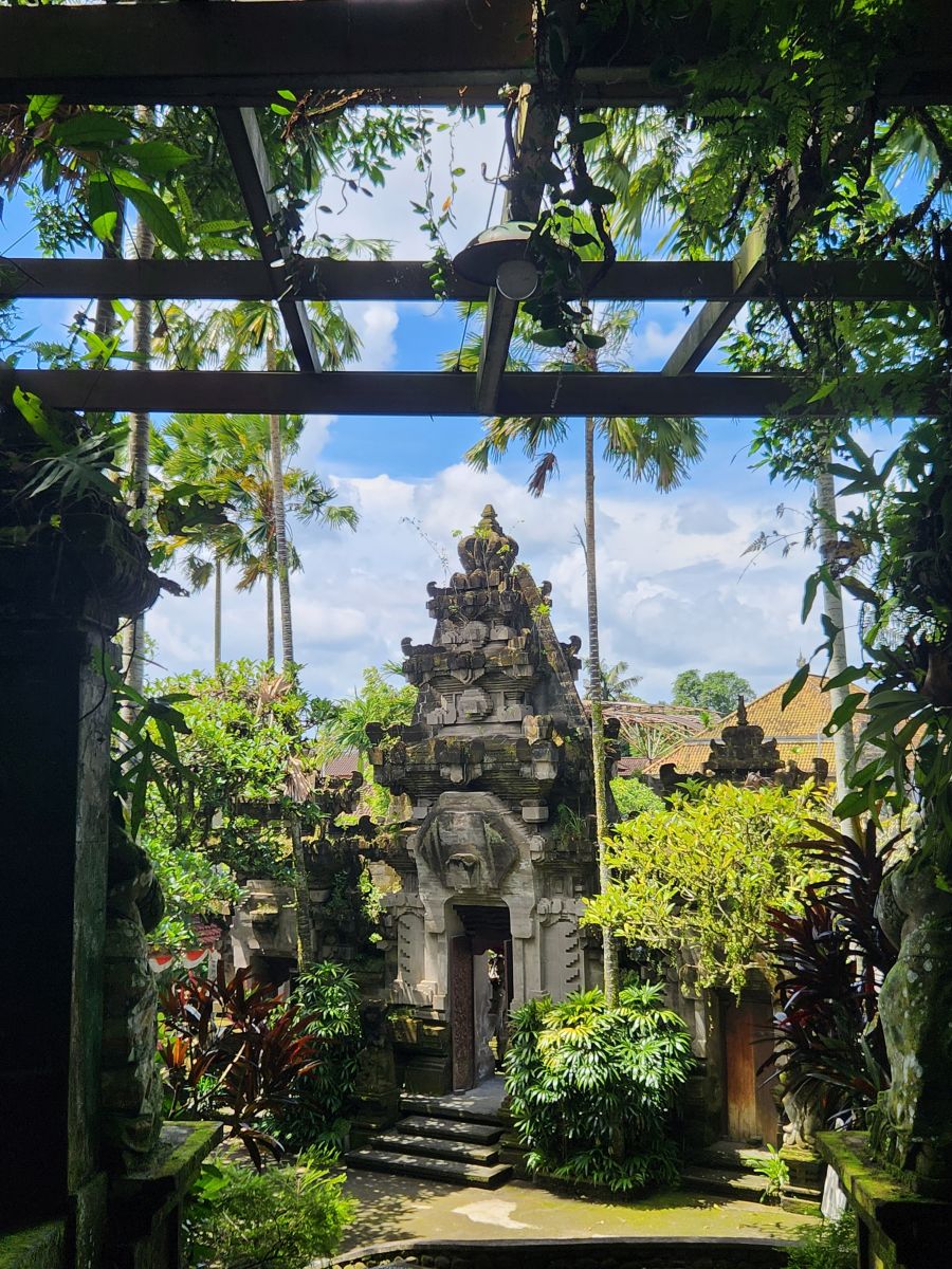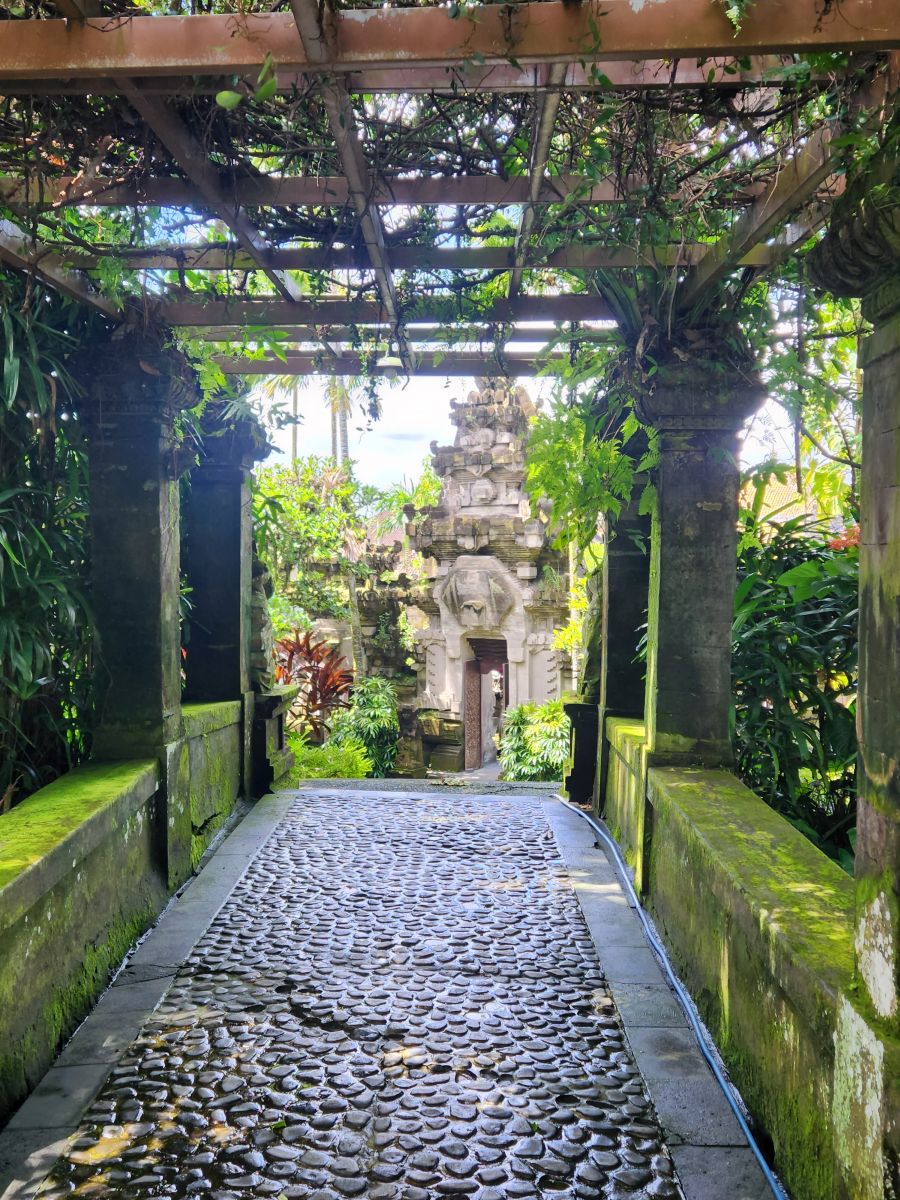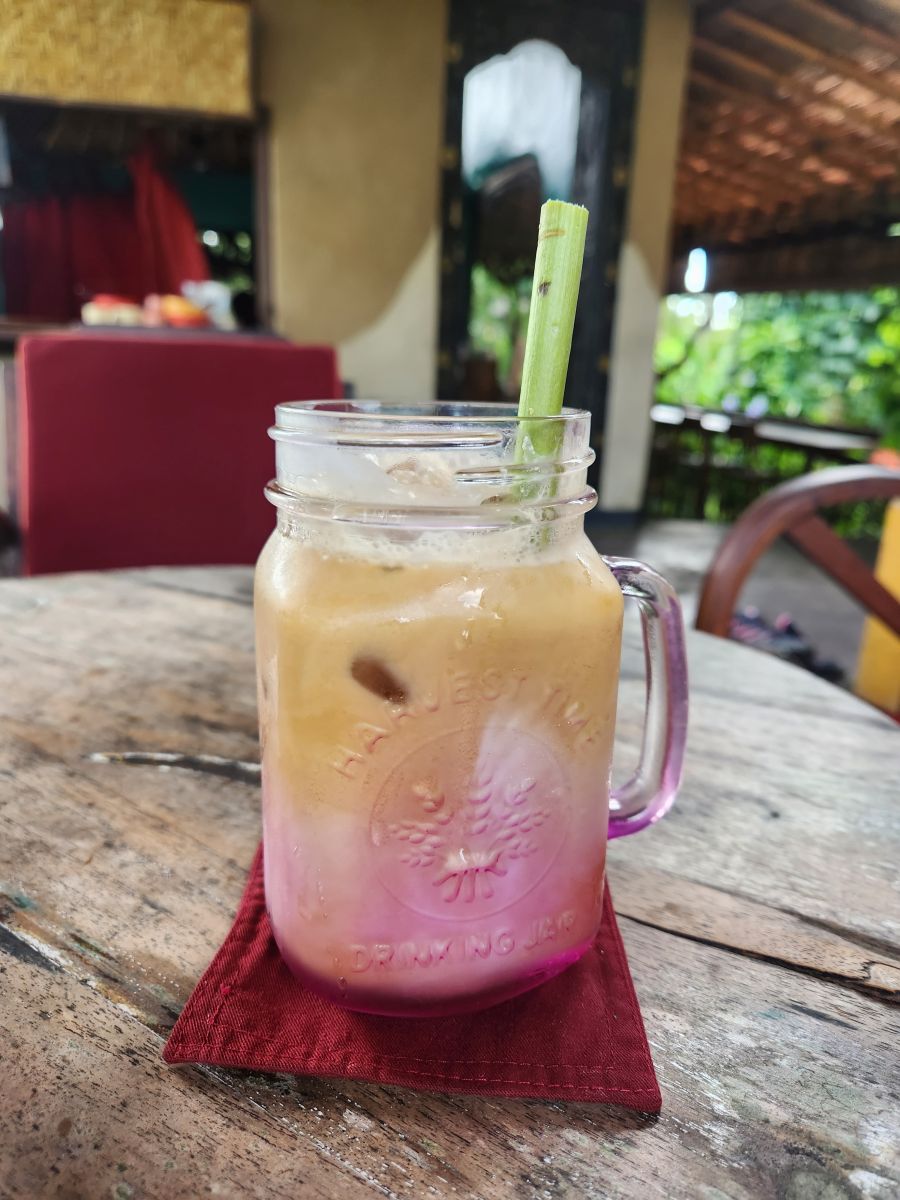 It is so early that many places aren’t open, including the Café Pomegranate, where they tell us they have fixed the coffee maker, but won’t be open for another 20 minutes. Oh well. On we walk. We actually stop at the Dragonfly Forest, a little café that has caught my eye every time we walk here. They have some rooms and villas as well, so the upstairs dining area is filled, but we happily plop ourselves down at a table on the lower level by the entrance way and feast our eyes on the beautiful foliage surrounding us as well as sate our thirst with an excellent, and quite pretty, iced latte with coconut milk (they are all organic and vegetarian here). It is a lovely little break before we navigate our way down the totally narrow walled path back to the main road.