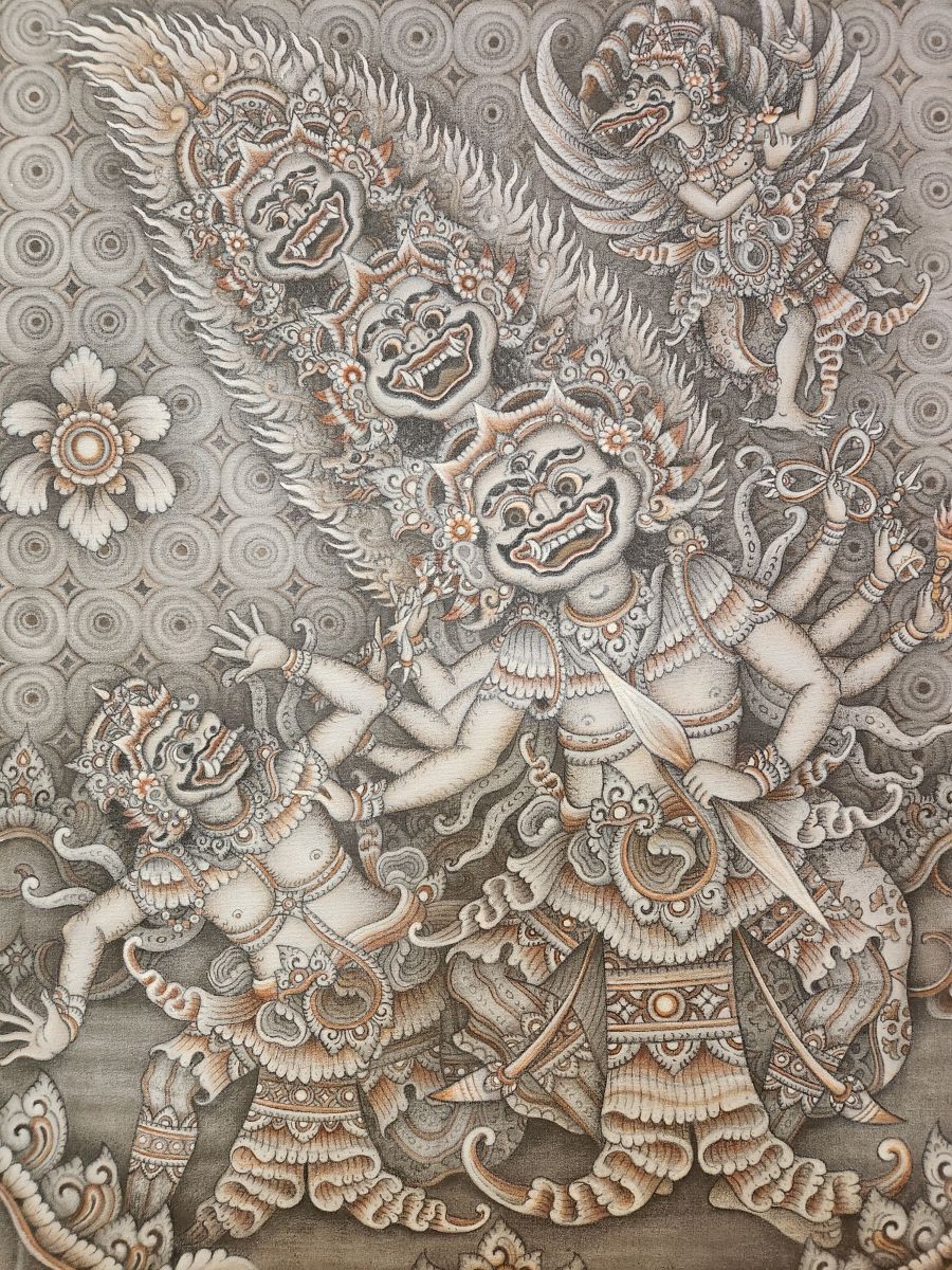 Well, regardless, even in our ignorance, at least the flowers and offerings make for beautiful sights along the various temples and here at the museum! We go straight to the new exhibit and it is just as fabulous as it was on the day before it opened. Maybe even more so as we spend more time reading about the benefactors of the art scene here (as explained in an earlier post) and more time with the new paintings, which are all available for purchase. Some at very high prices (there is one artist who is obviously popular and established with prices in the tens of thousands) and some at very reasonable prices. We love looking at all the different styles, and the different prices assigned to each. Quite fun – and while we are definitely not interested in buying anything (we’ve already decided if our sweet rice field walk guy has anything small, we will buy from him) it is still very fun to look at everything and think about who would buy it and where it would go.