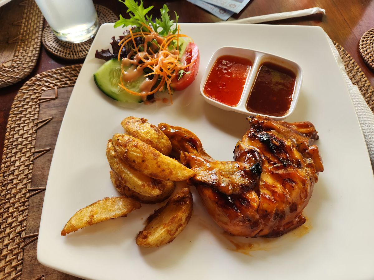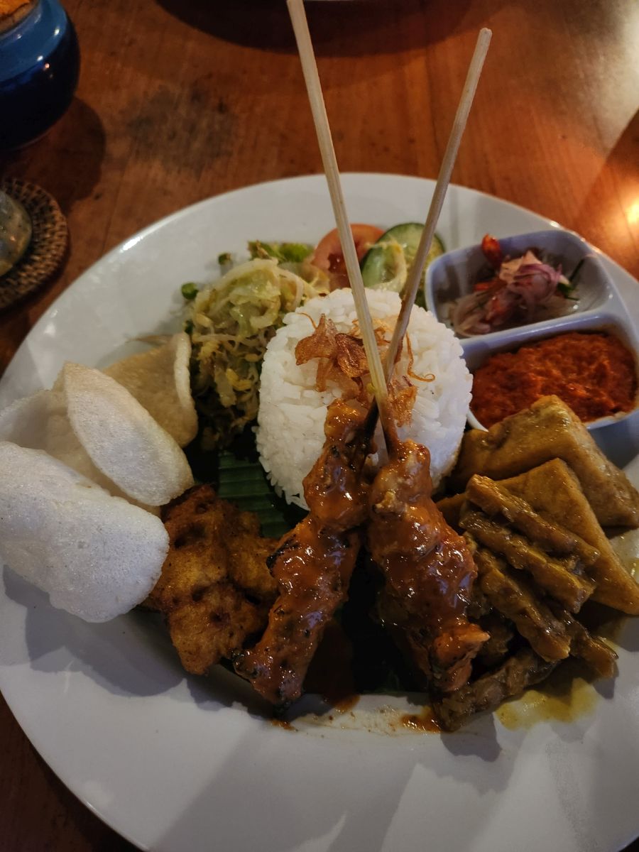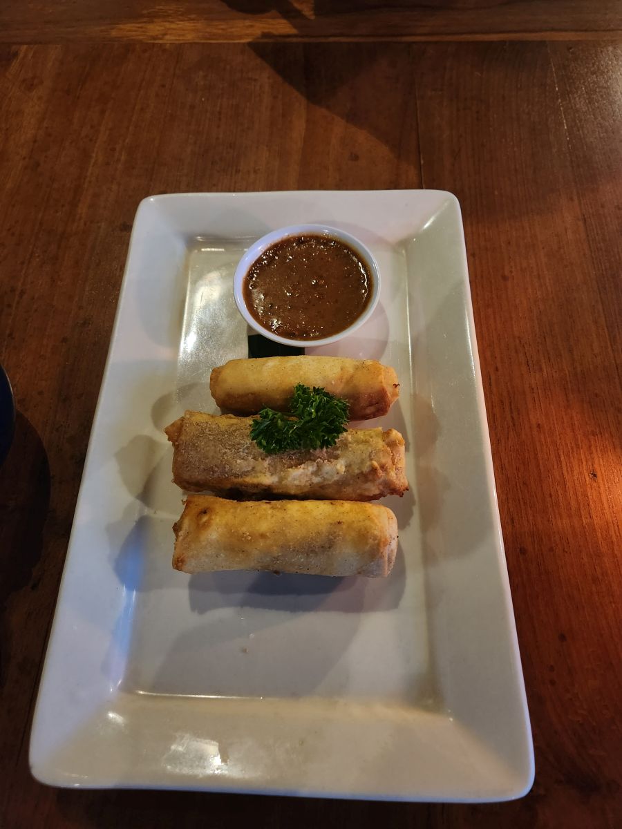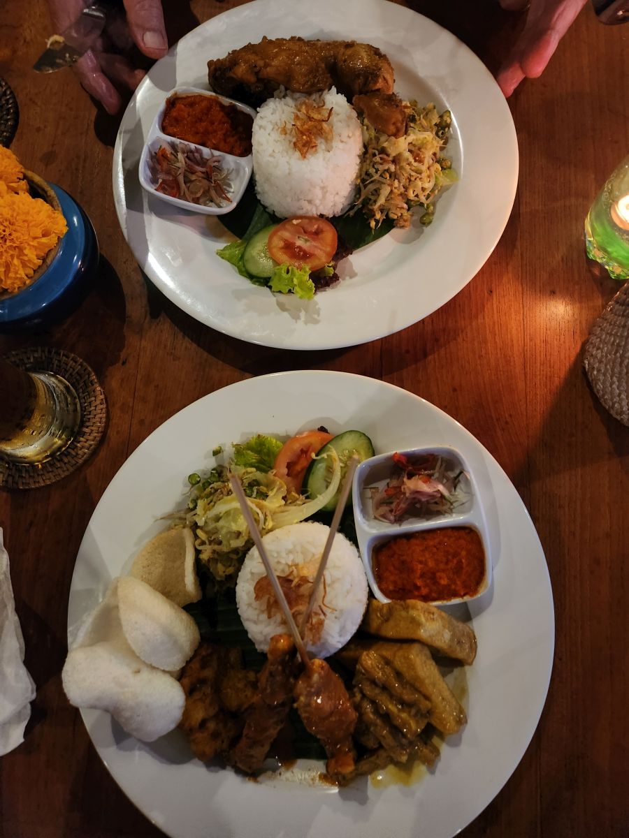 It doesn’t disappoint tonight. Same lovely setting. Same excellent food with spring rolls to share, Chicken satay for me and Ayam Bakar (grilled chicken) for Ed. You can’t go wrong here.