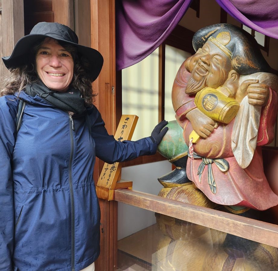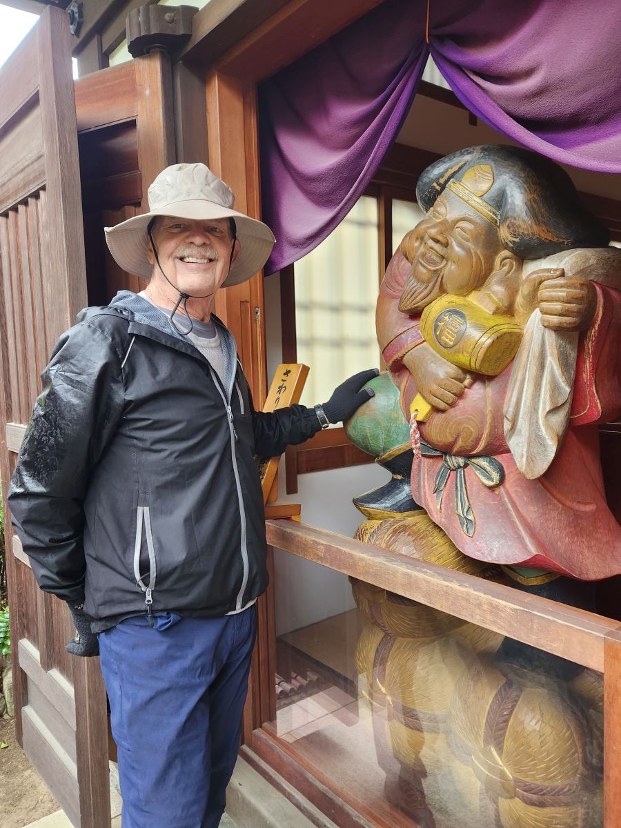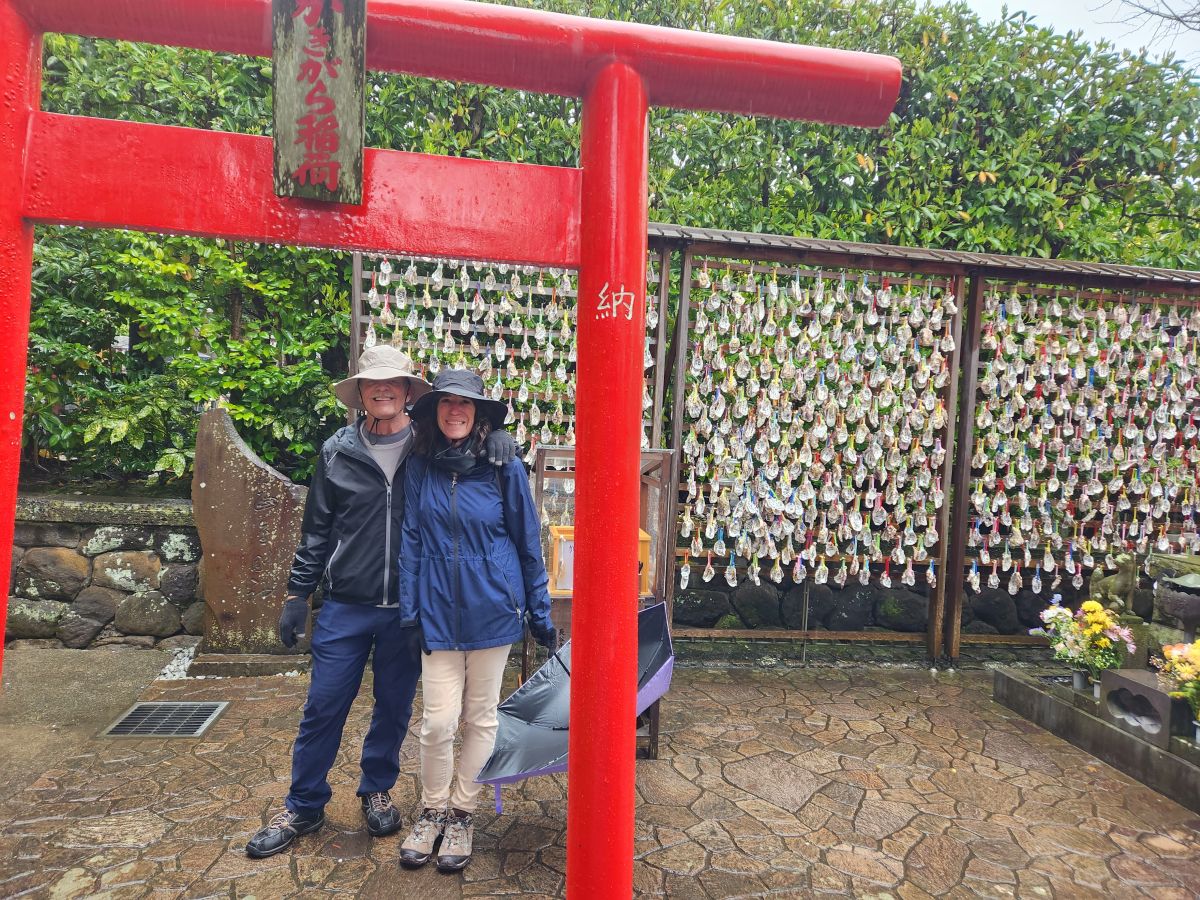 Shuji walked us around to the “husband and wife” rocks, that we rubbed for a healthy marriage, then through the main temple (no photos allowed) and out onto the plaza in front of the temple for photos on the outside. Totally fun!