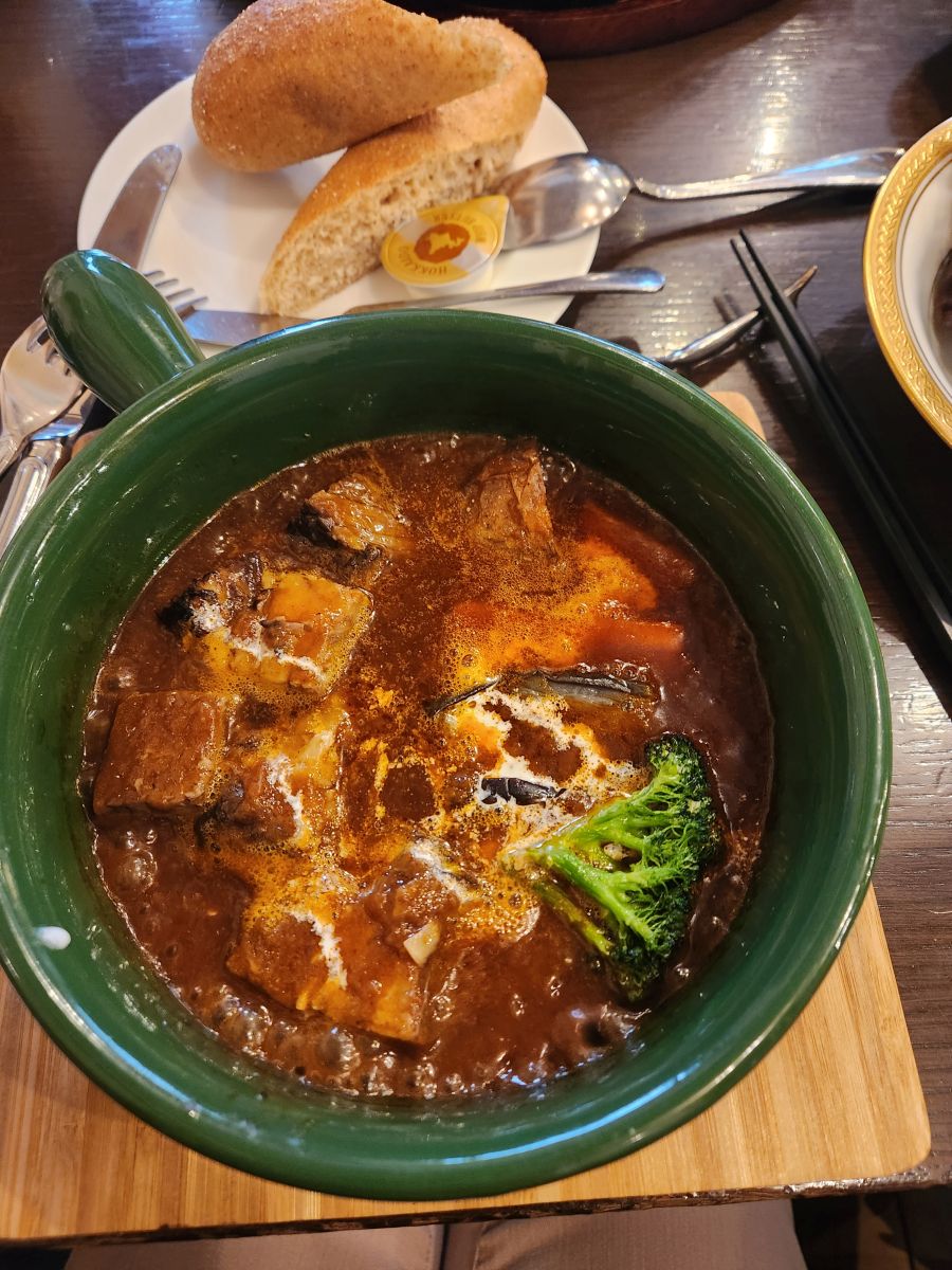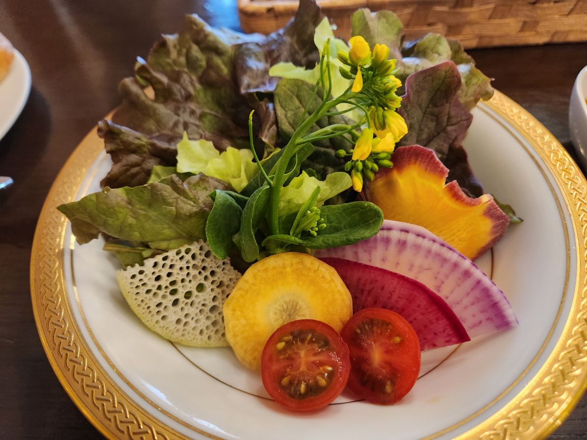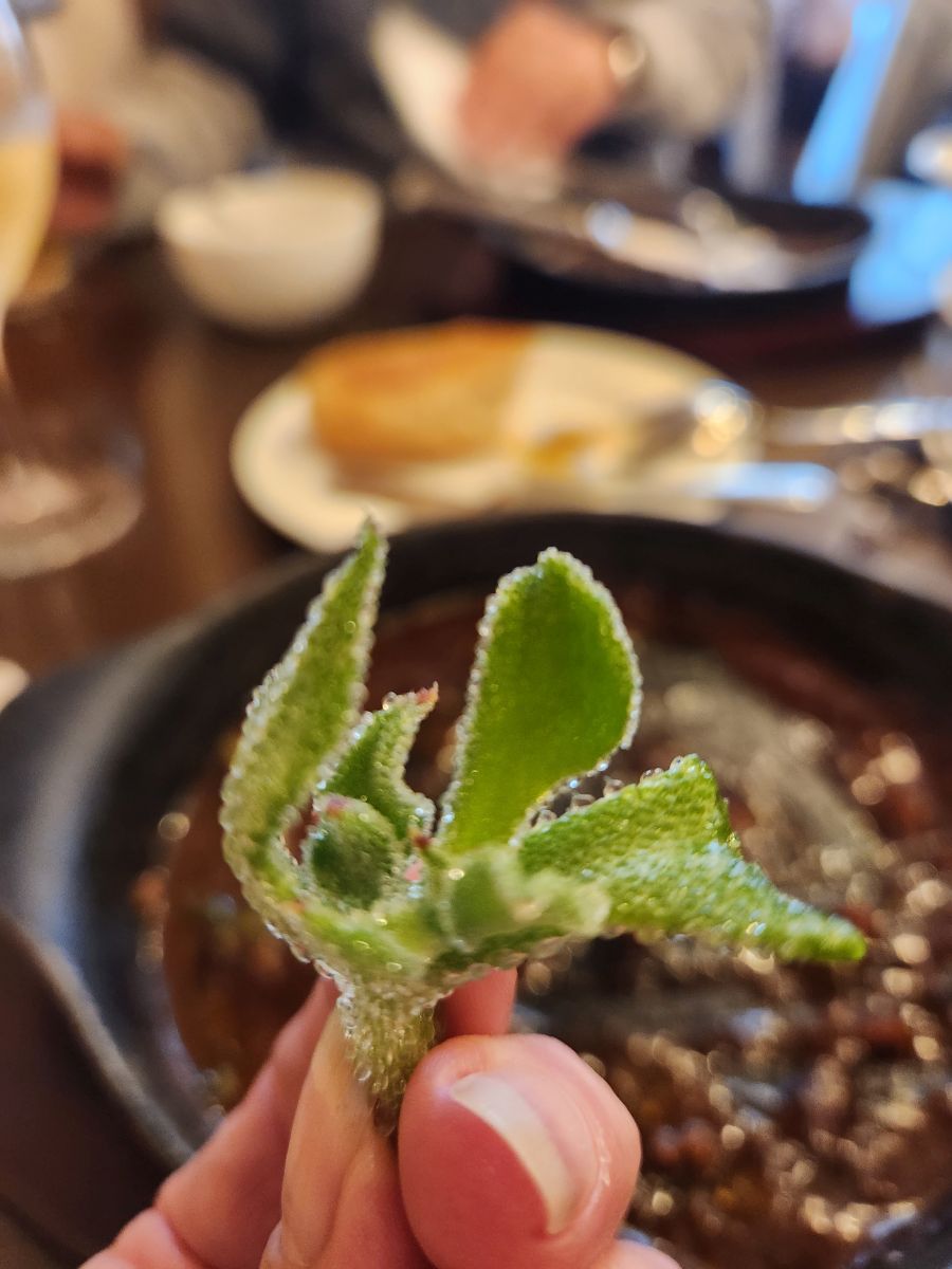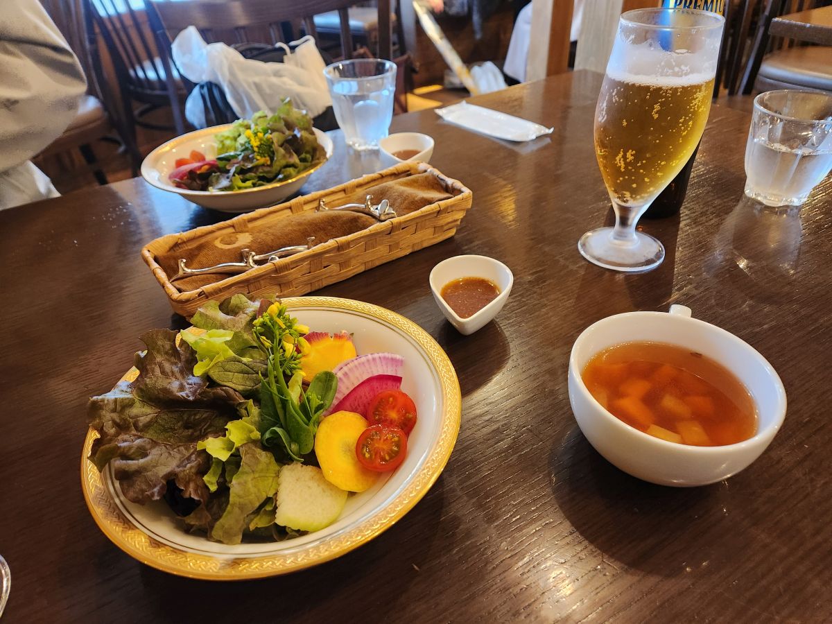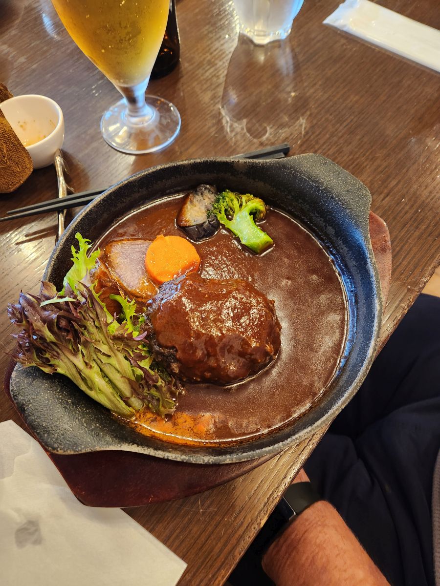But also totally wet and freezing and by this point, we felt like frozen drowned rats! We decided it was lunch time, and Shuji didn’t put up an argument! So we went in search of lunch, stopping at Wasai Yakura, a favorite of Shuji’s, where he knows the owner who took excellent care of us. We had a wonderful traditional Japanese/western lunch of hamburger and sauce (really Salisbury steak, but excellent beef) and beef stew – sort of like beef bourguignon but with salad and soup. Kamakura is known for its vegetables, and the salad was amazing with the best tasting and prettiest veggies! And then the owner brought us this thing called an Ice plant to try. It was amazing – it looked like it had ice crystals on it, tasted salty but literally melted in your mouth.