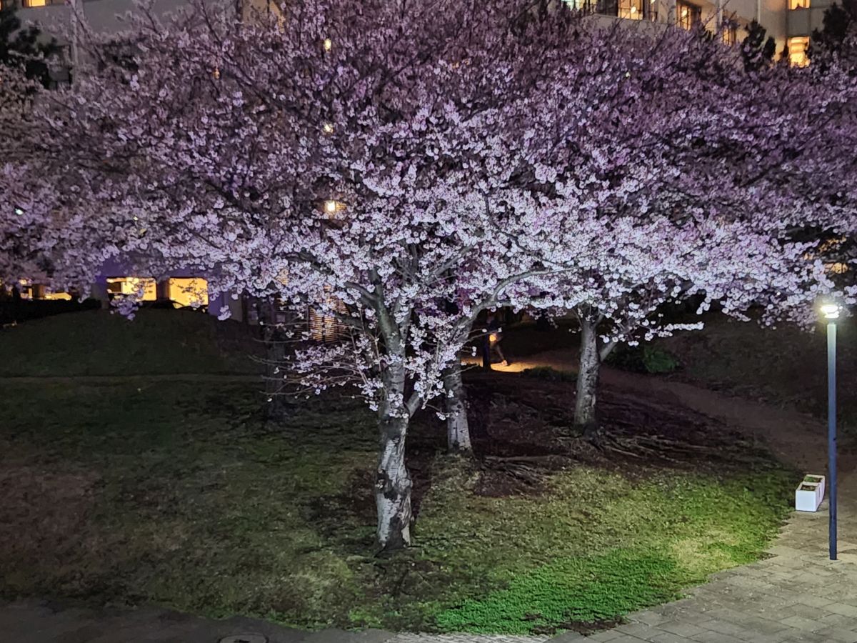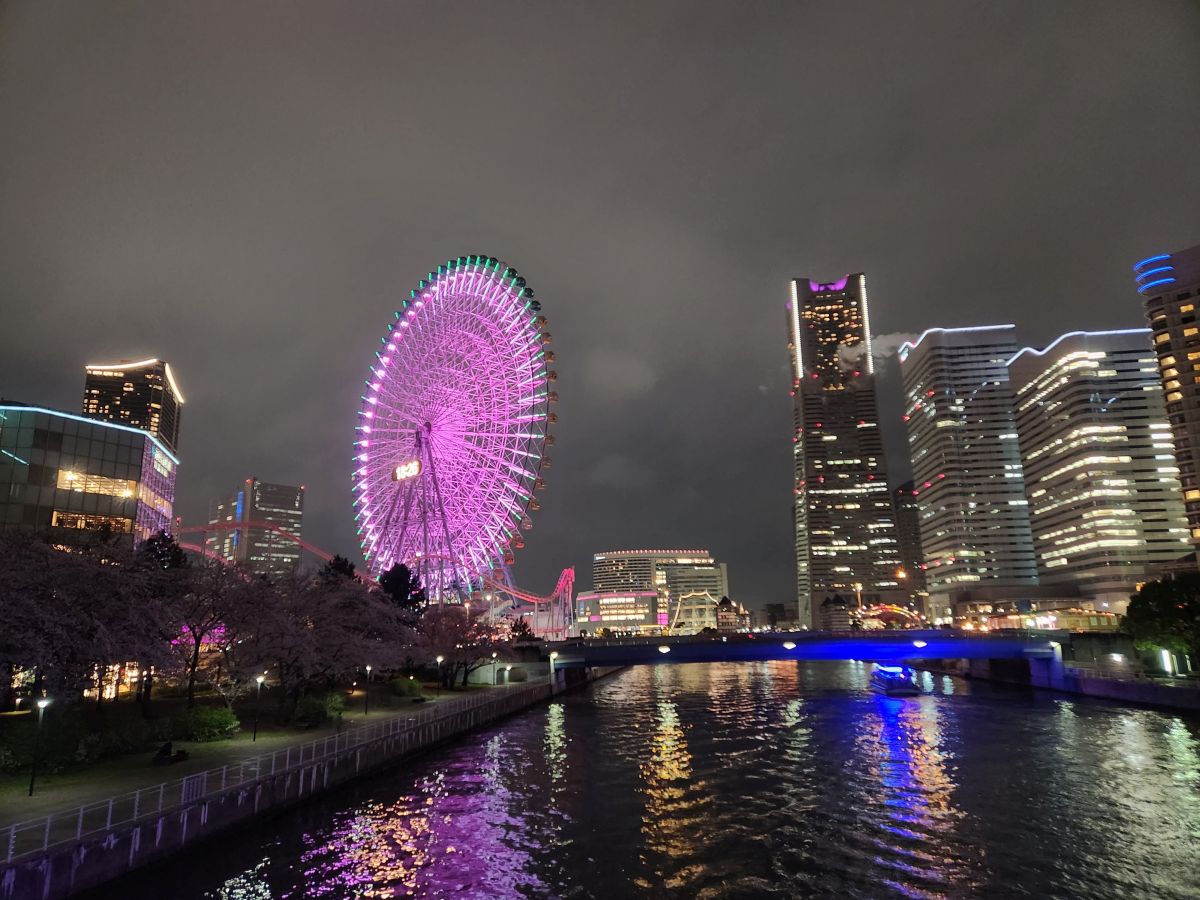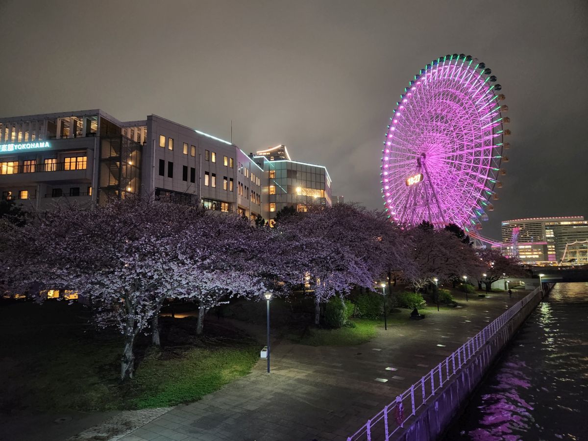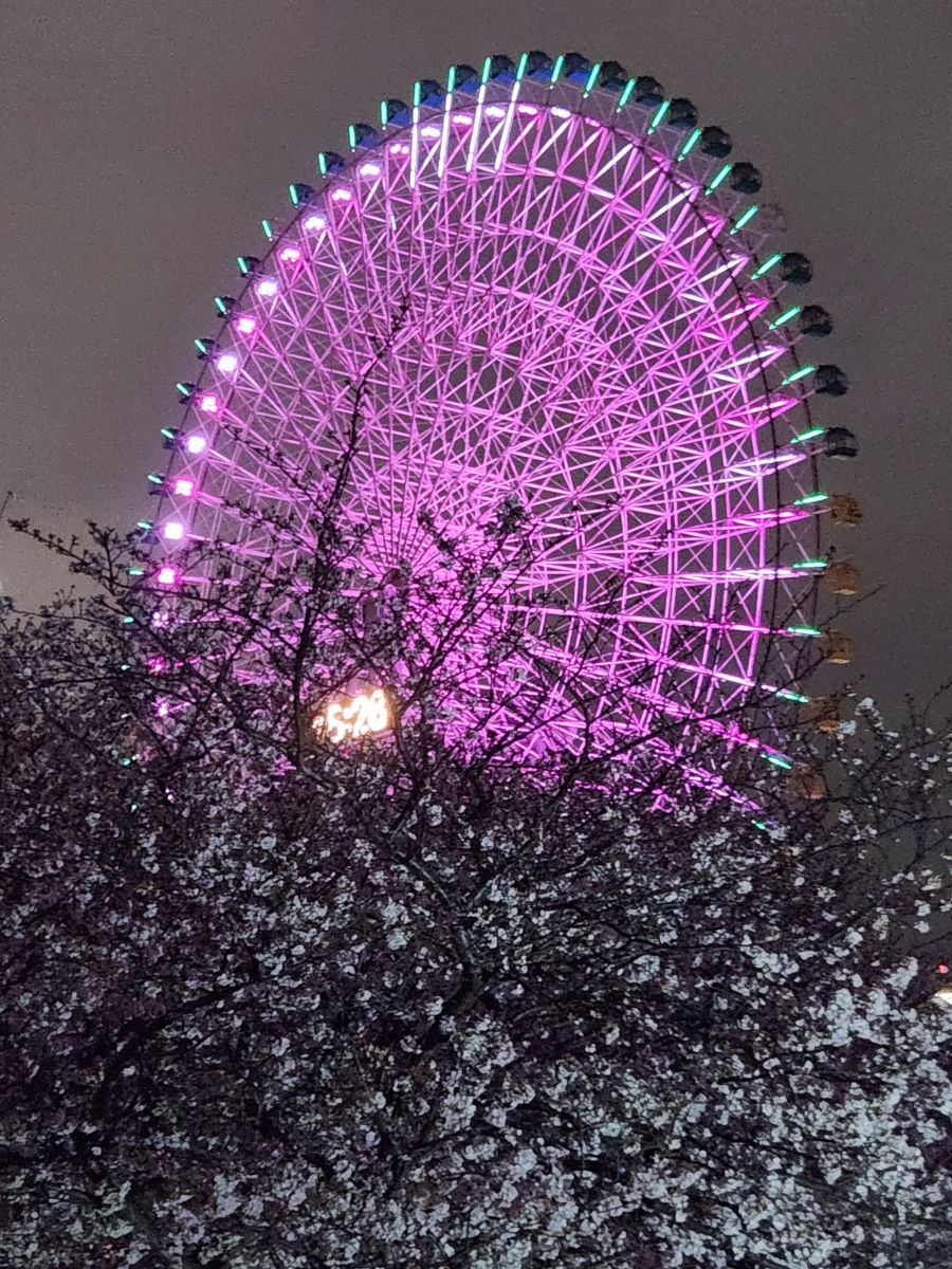 Later that evening, we ventured out into what has become a gorgeous night, along the harbor front, past the now lit and still beautiful cherry blossom trees, to another food court type place we found really close to the hotel.