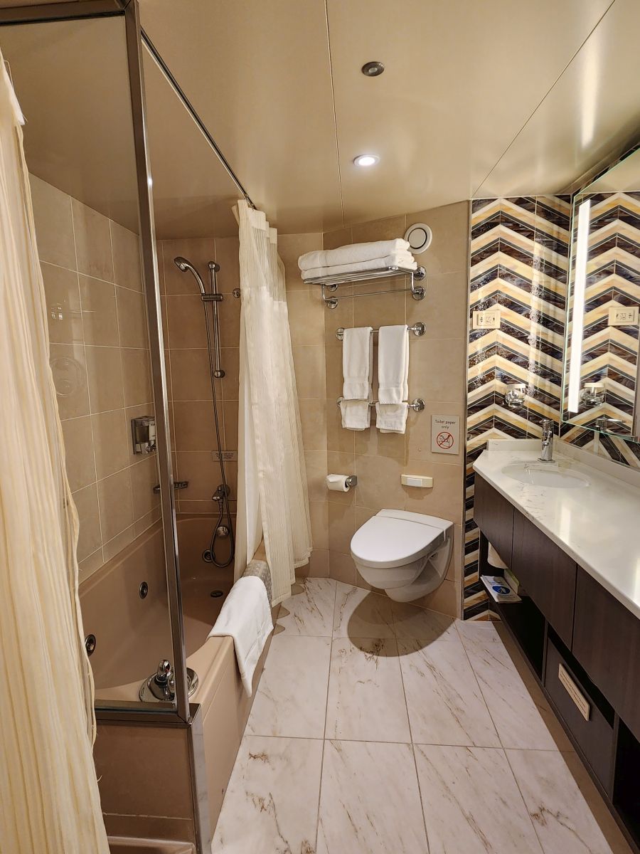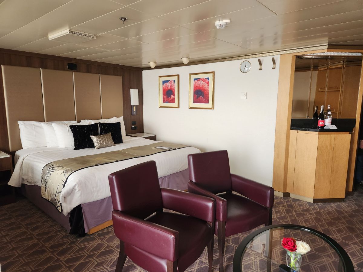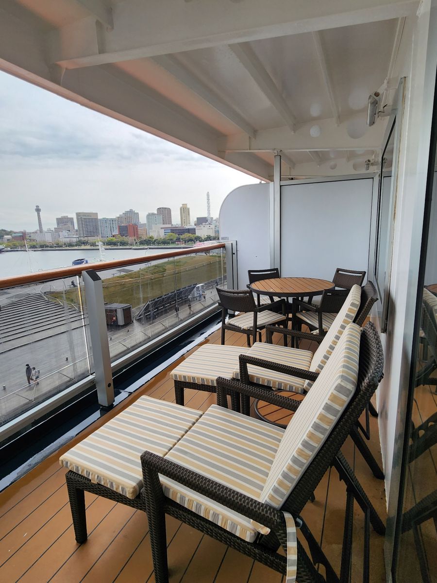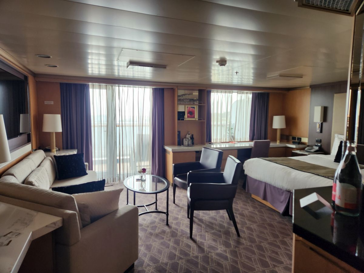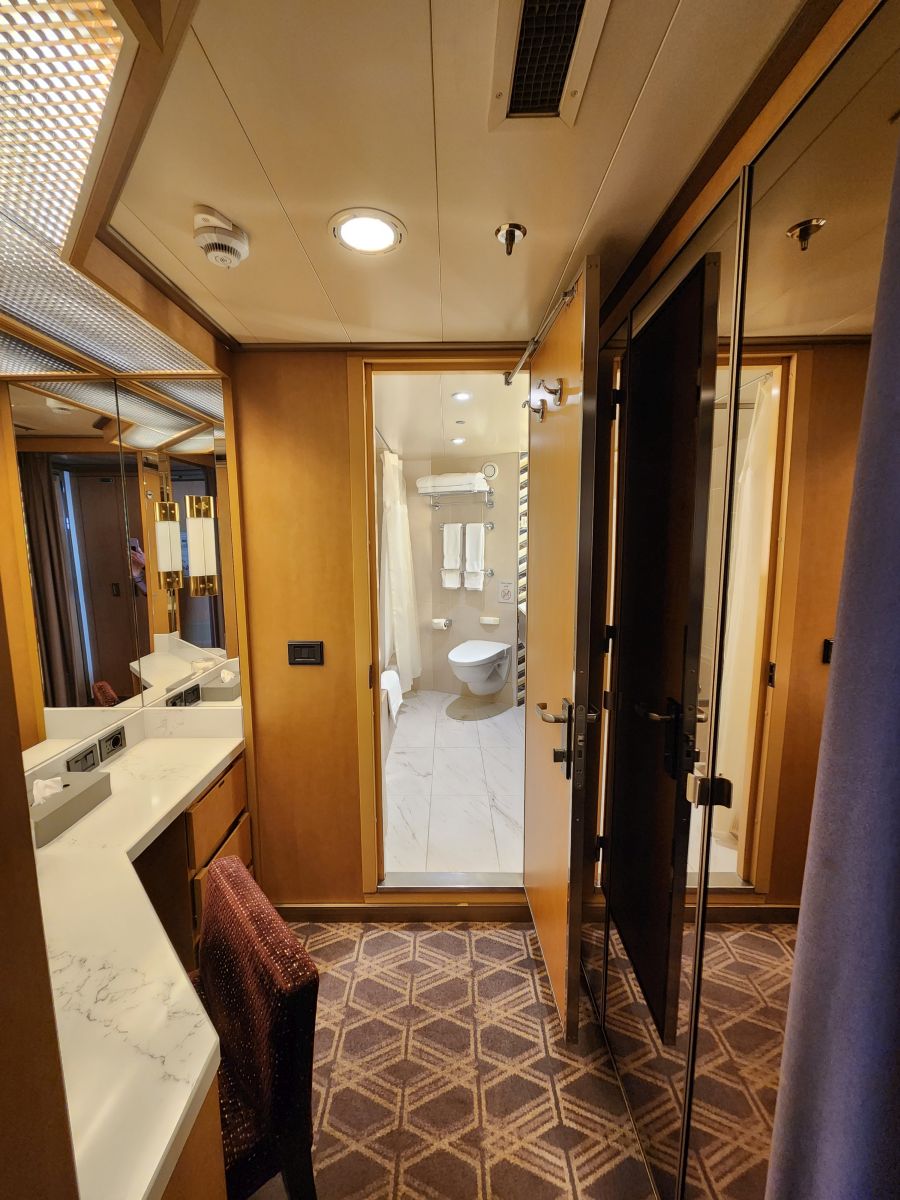 And what a cabin! We sprung for a suite upgrade and it’s fab! Huge living area and equally huge bathroom – oh and that balcony. It is almost as big as the owner’s suite balcony on Azamara! So exciting.